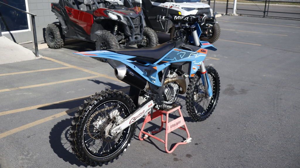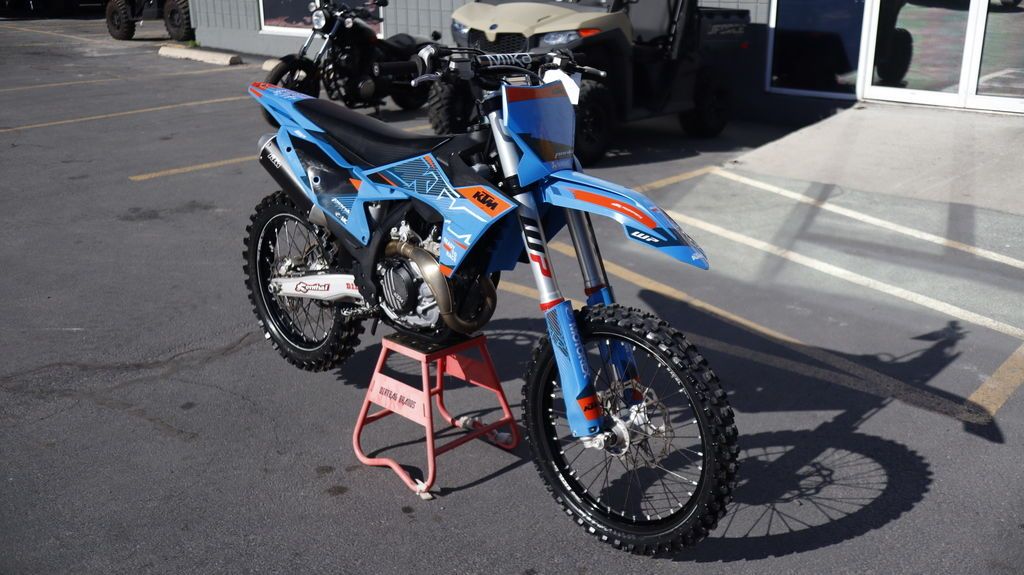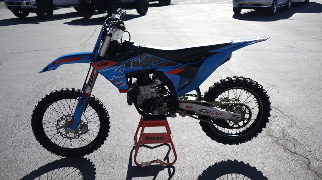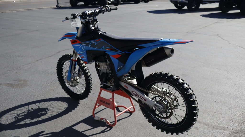 2024 KTM 450 SX-F We aren't ones to brag, but with a trophy cabinet ready to rip at the seams, the KTM 450 SX-F is the epitome of a podium hunter. With 5 AMA 450 supercross titles in the last 7 seasons, the 2024 KTM 450 SX-F rolls into the pit already armed with the learnings of past championships. It's time to extend the trophy room. Features may include: BEFORE THE GATE Easy Suspension Adjustment Get dialed in! The 2024 KTM SX range boasts totally tool-free suspension setup at both ends. Thanks to the shock absorber design featuring hand-adjustable dual compression control, it allows riders to adjust high- and low-speed settings in a matter of seconds. On the front end, the forks are also easily adjusted thanks to a single air pressure preload valve, as well as through easy access click adjusters for compression and rebound. We'll even throw the air pump in as standard. START STRONG More Usable Power When the war drums sound and the gate drops, you need to be the first off the line in a bid to rule the roost. The 2024 KTM 450 SX-F boasts one of the most powerful 4-stroke powerplants in the pits, with its SOHC engine proving to be the perfect example of advanced engineering. With with massive power in a light package, you'll leave the competition with more than a little mud on the face. CALM UNDER FIRE Absolute Control No matter how gnarly the track is, you'll find complete confidence thanks to the frame design that has not only been engineered for longitudinal rigidity but also repositions rotating mass closer to the center of gravity. The shock mounting also provides improved anti-squat behavior for better traction out of corners, while the footpeg mounting position has moved inwards for less risk of hooking up in deep ruts or when scrubbing jumps. HIT THE BIG STUFF Mass Centralization Ready to rip your arms out of the sockets? Together with the benefits of mass centralization and overall reduced weight, the anti-squat behavior of the chassis is significantly improved by changing the backbone of the steel frame concept. In layman's terms, the 2024 KTM 450 SX-F gets its power down perfectly when tearing out of corners. MAINTAINING MOMENTUM Consistency A WP XACT shock absorber provides unmatched consistency lap after lap, thanks to low-friction SKF linkage seals and advanced damping characteristics for unsurpassed traction and energy absorption.