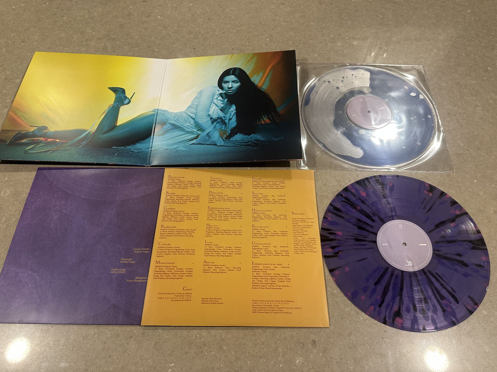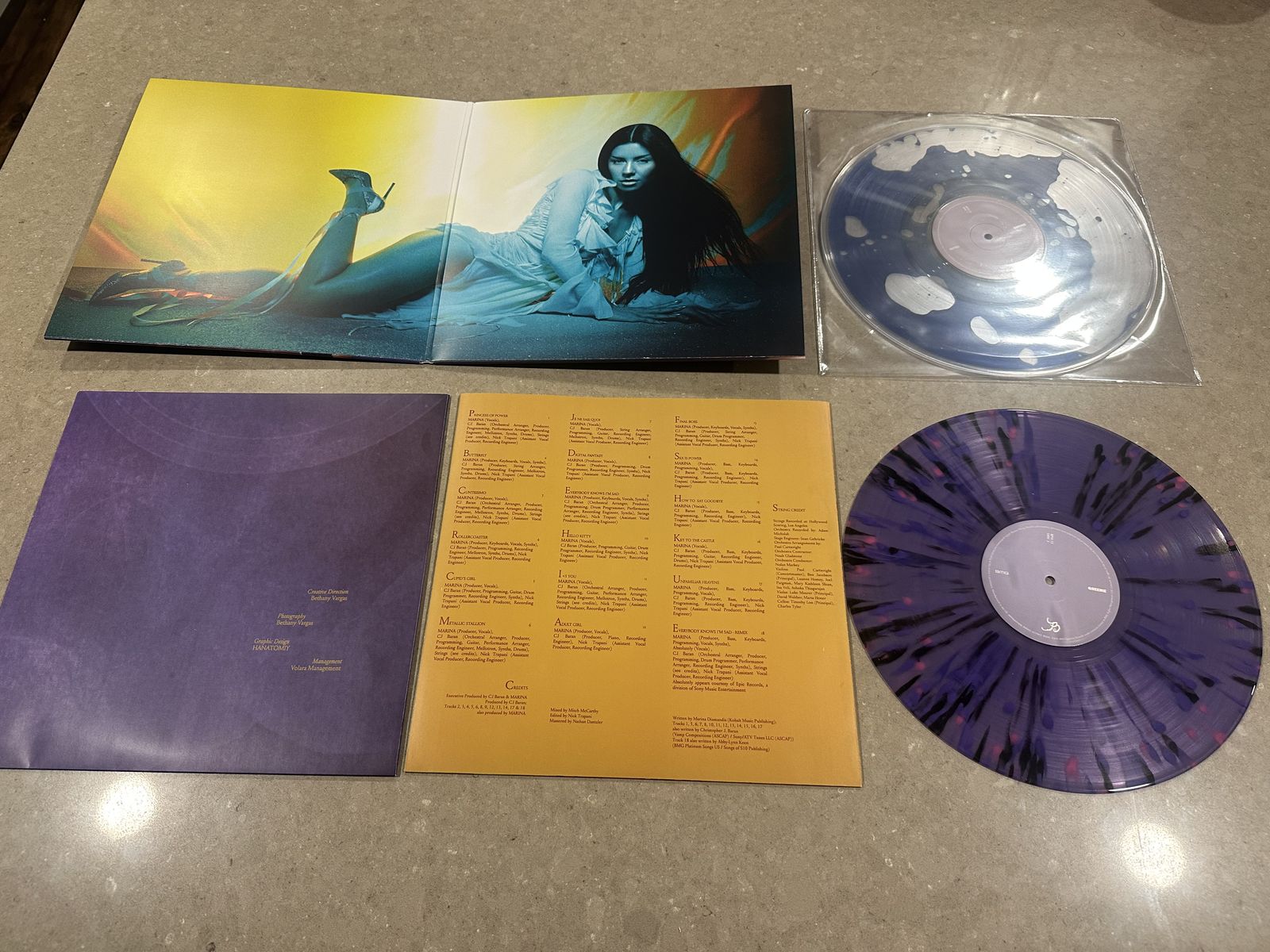 Following the Blood Records sell-out of MARINA’s sixth album PRINCESS OF POWER, this Bad World exclusive liquid LP format comes with purple splatter effect disc 2.Inspired by the superpower that is love, it marks the internationally acclaimed and award-winning artist’s first independent release. The album explores the concepts of power and leadership for a new generation. It’s a record that is built on the belief that love doesn’t make us weak, it’s something to be empowered by and celebrated. Both vinyl are so pretty and unique! You’re going to love it!