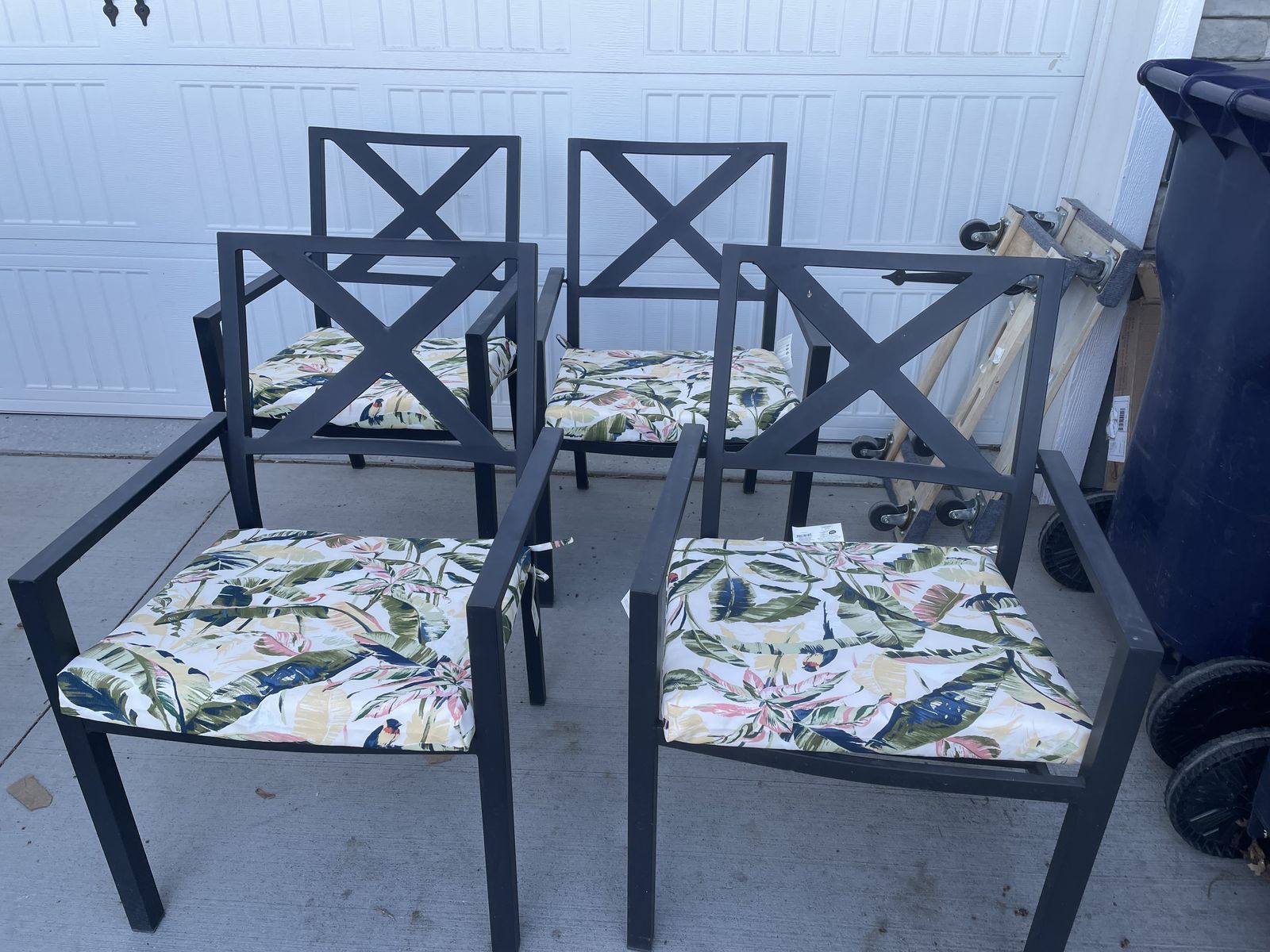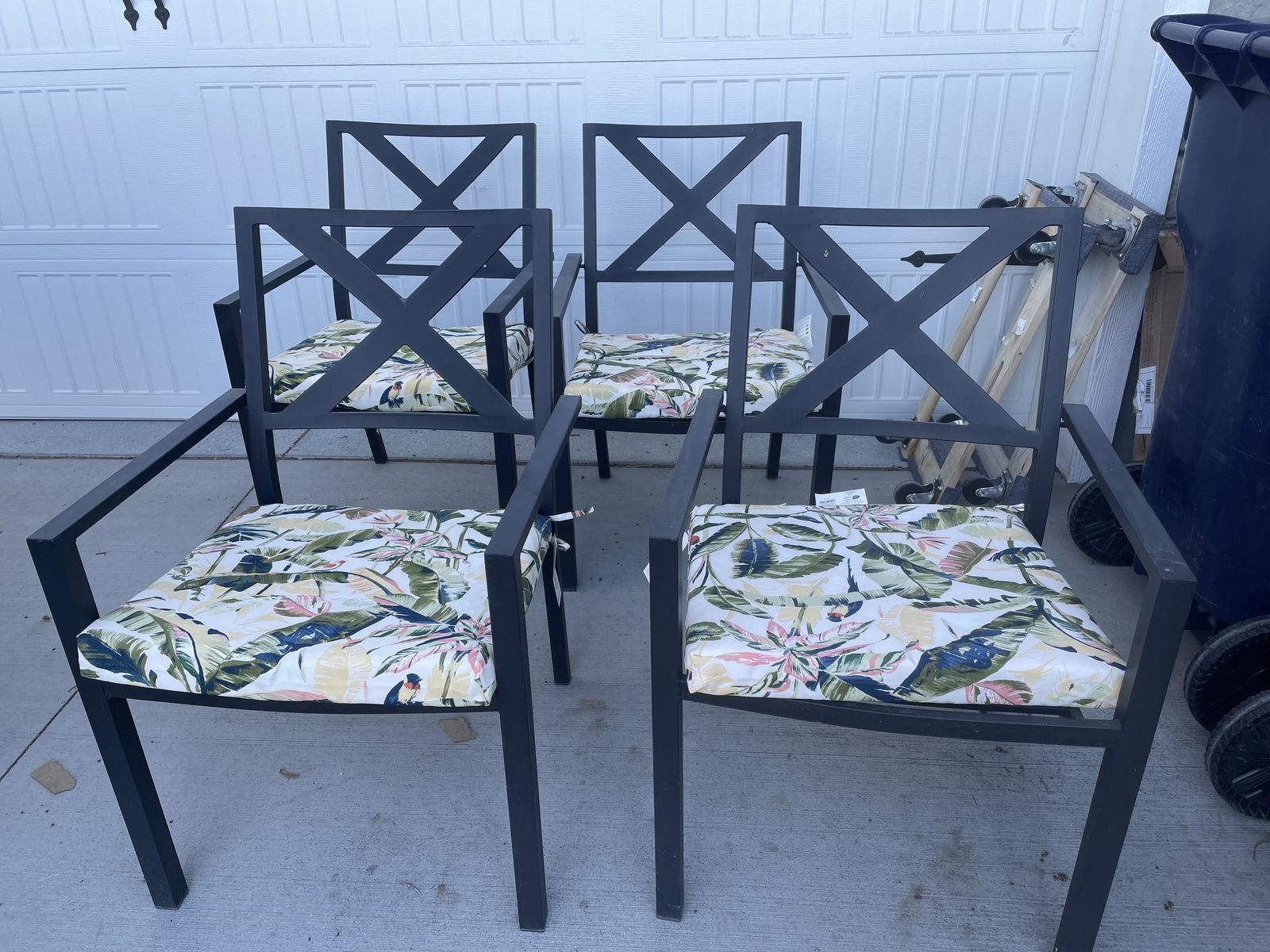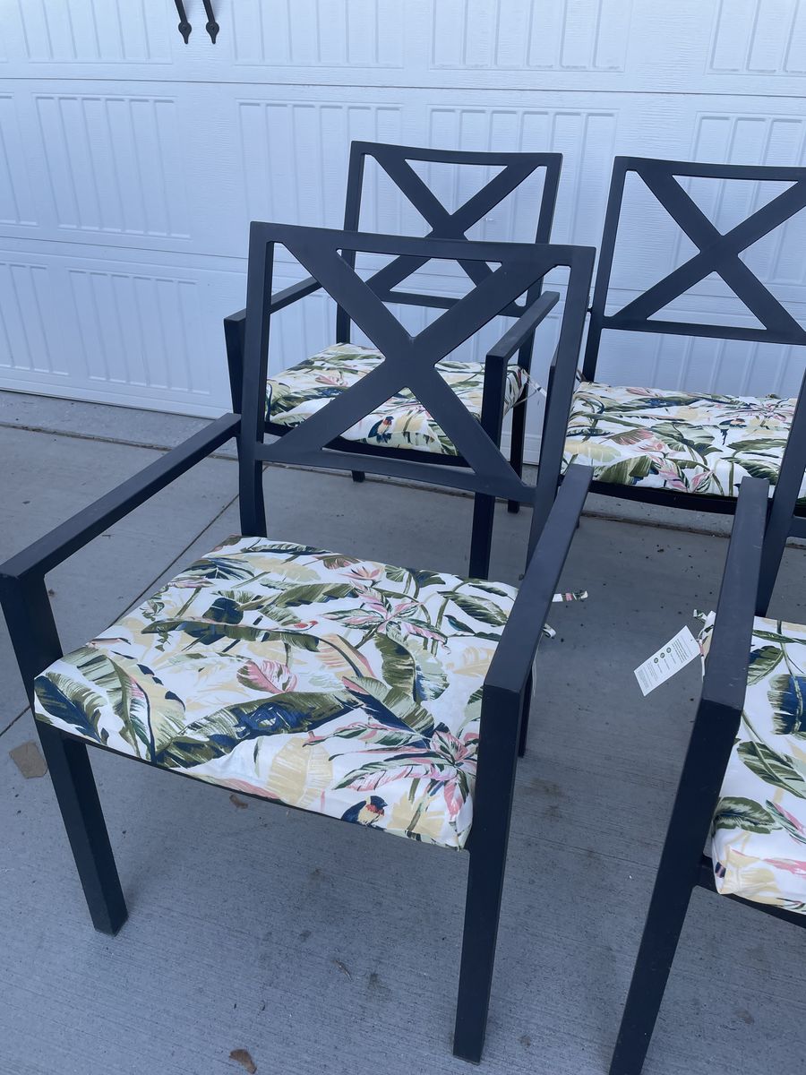 lightly used 4 metal outdoor dining chairs with new cushions