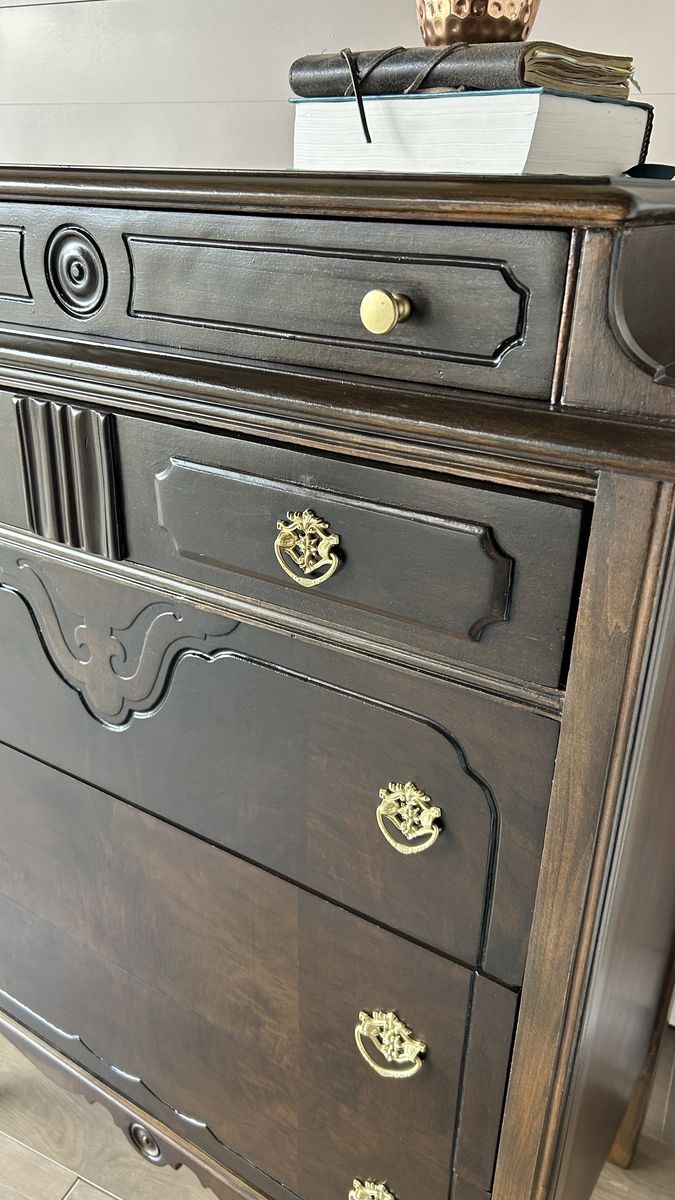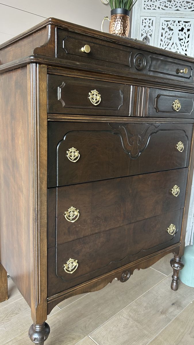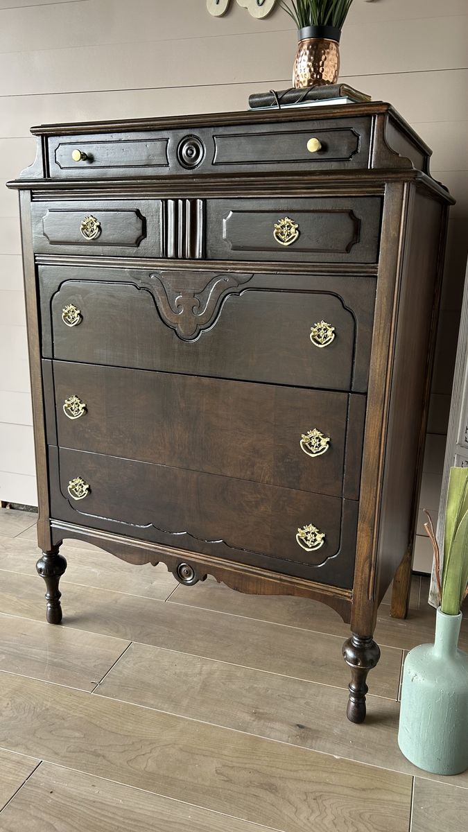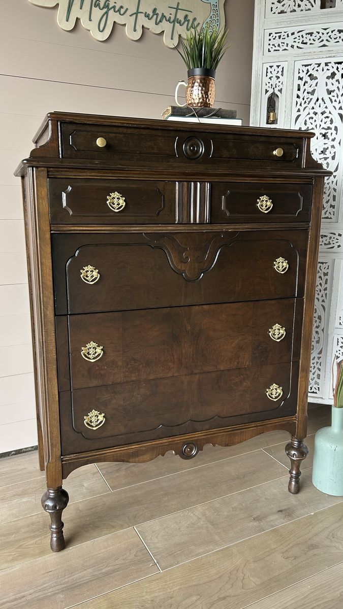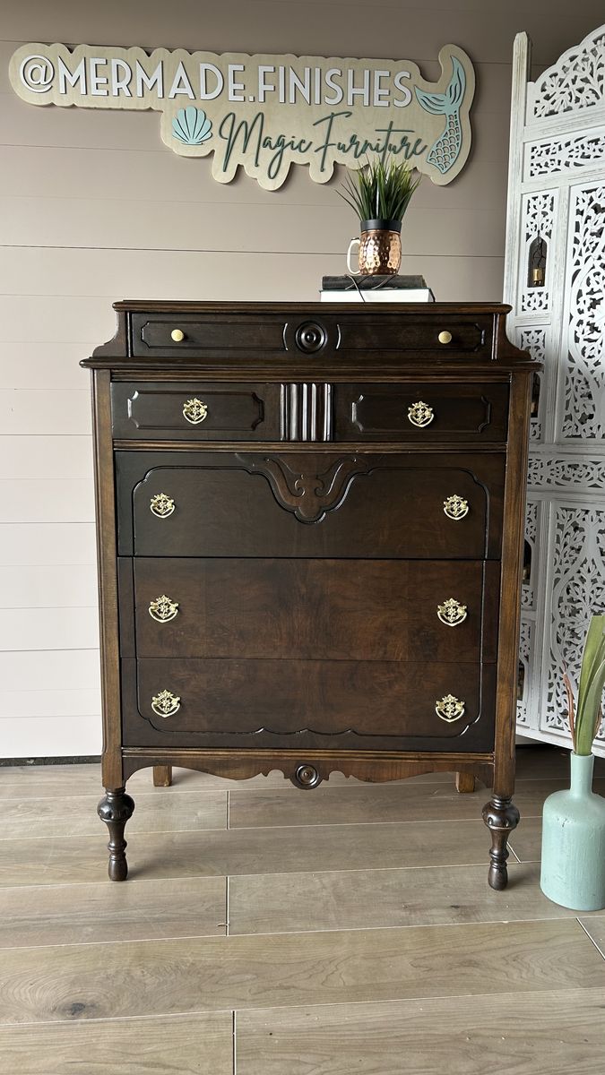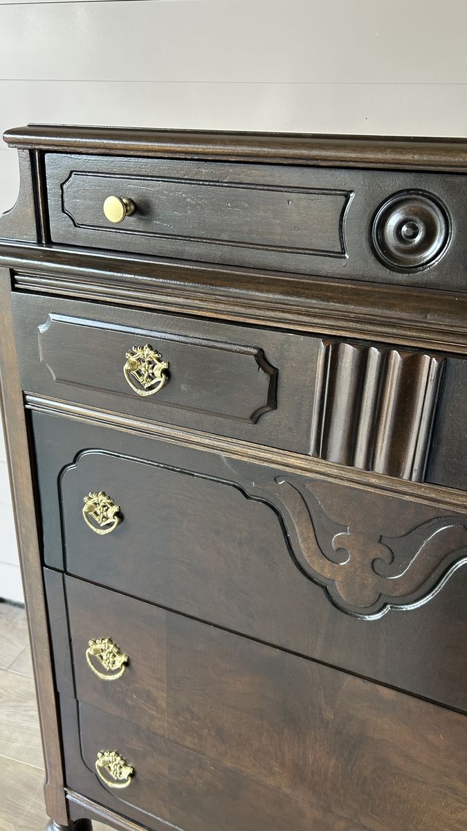 Meet the King — this stunning antique highboy chest features incredible carved detail work, an ornate top gallery drawer, decorative appliqué, turned spindle legs, and original brass hardware with an anchor/crest motif. Professionally refinished in a rich dark walnut that lets the beautiful wood grain and craftsmanship shine through. Dimensions: 46”H | 34”W | 19.5”D Price: $595 This piece is part of a royal court! Also available: The Queen – A taller, equally stunning antique highboy at $595 The Heir – A solid smaller chest at $495 Buy the King + Queen together and get The Heir FREE! Buy the King OR Queen and get The Heir for 50% off! local delivery in the Salt Lake area is available