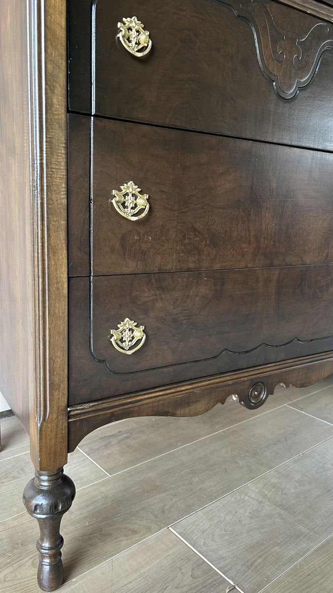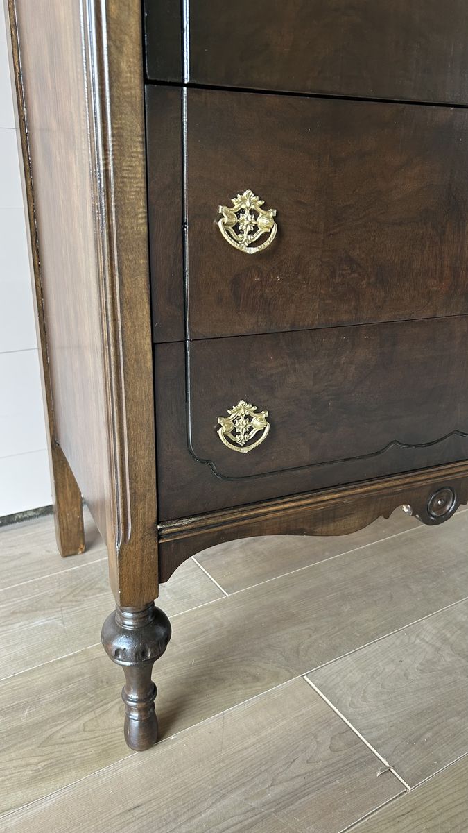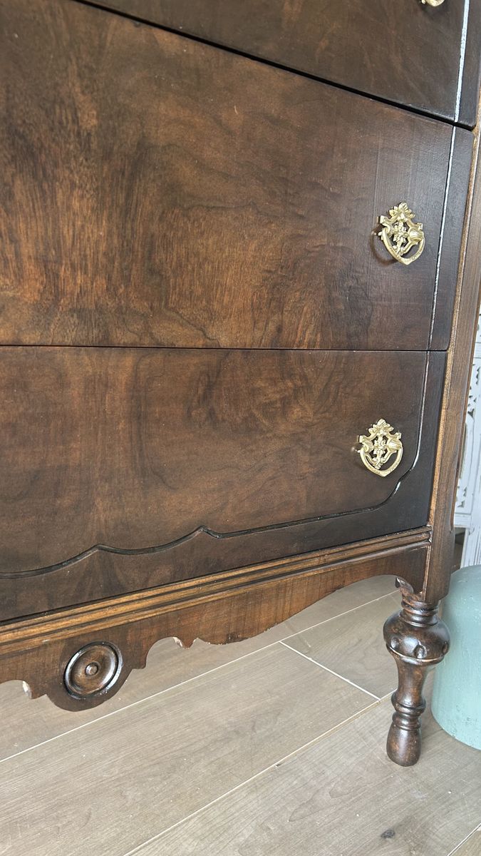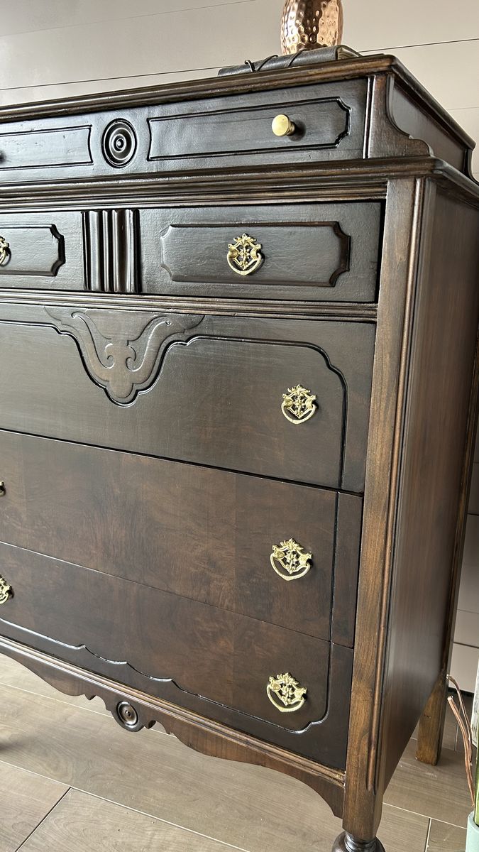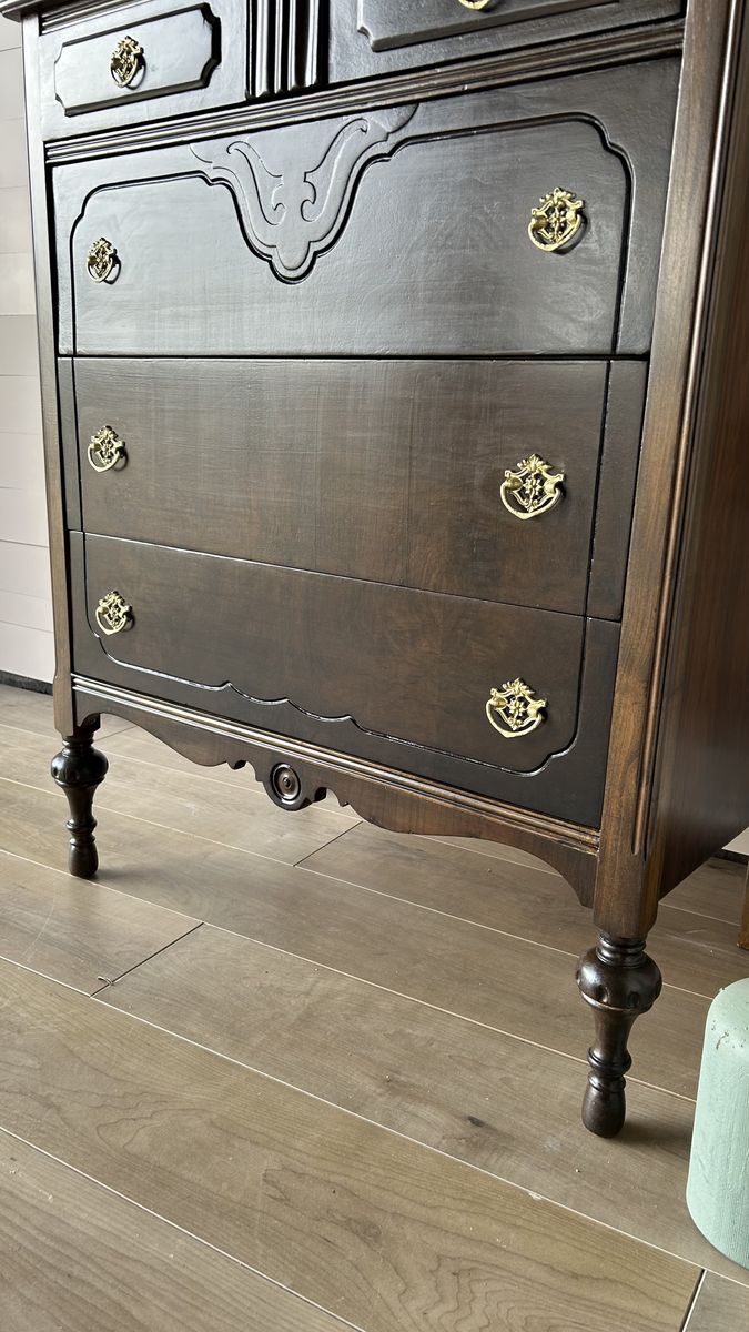 Meet the King — this stunning antique highboy chest features incredible carved detail work, an ornate top gallery drawer, decorative appliqué, turned spindle legs, and original brass hardware with an anchor/crest motif. Professionally refinished in a rich dark walnut that lets the beautiful wood grain and craftsmanship shine through. Dimensions: 46”H | 34”W | 19.5”D Price: $595 This piece is part of a royal court! Also available: The Queen – A taller, equally stunning antique highboy at $595 The Heir – A solid smaller chest at $495 Buy the King + Queen together and get The Heir FREE! Buy the King OR Queen and get The Heir for 50% off! local delivery in the Salt Lake area is available