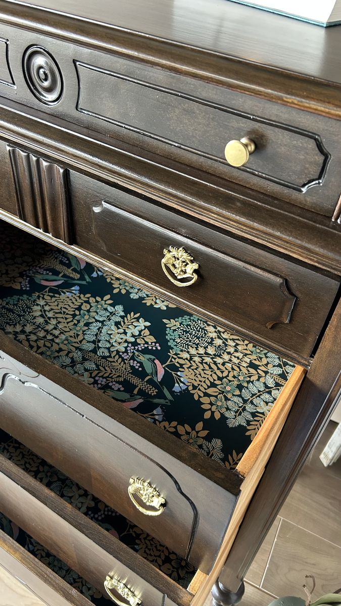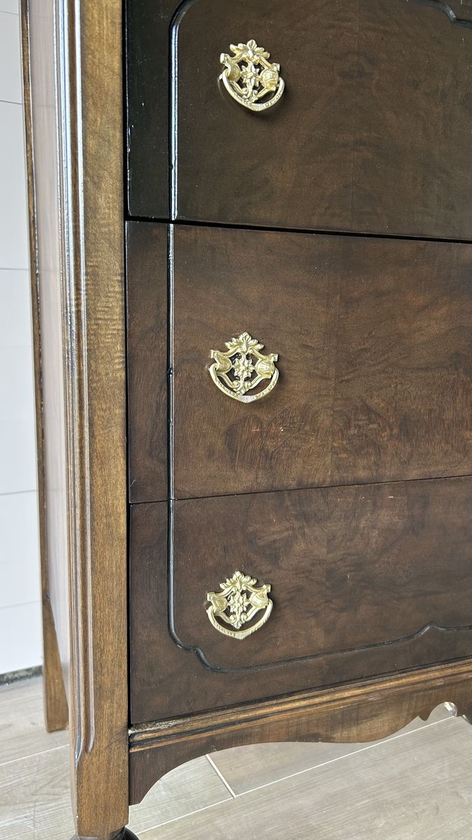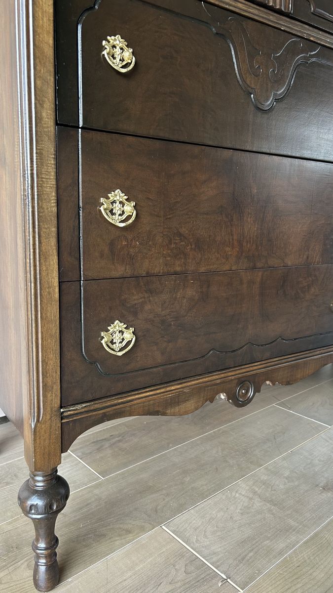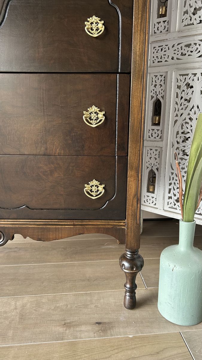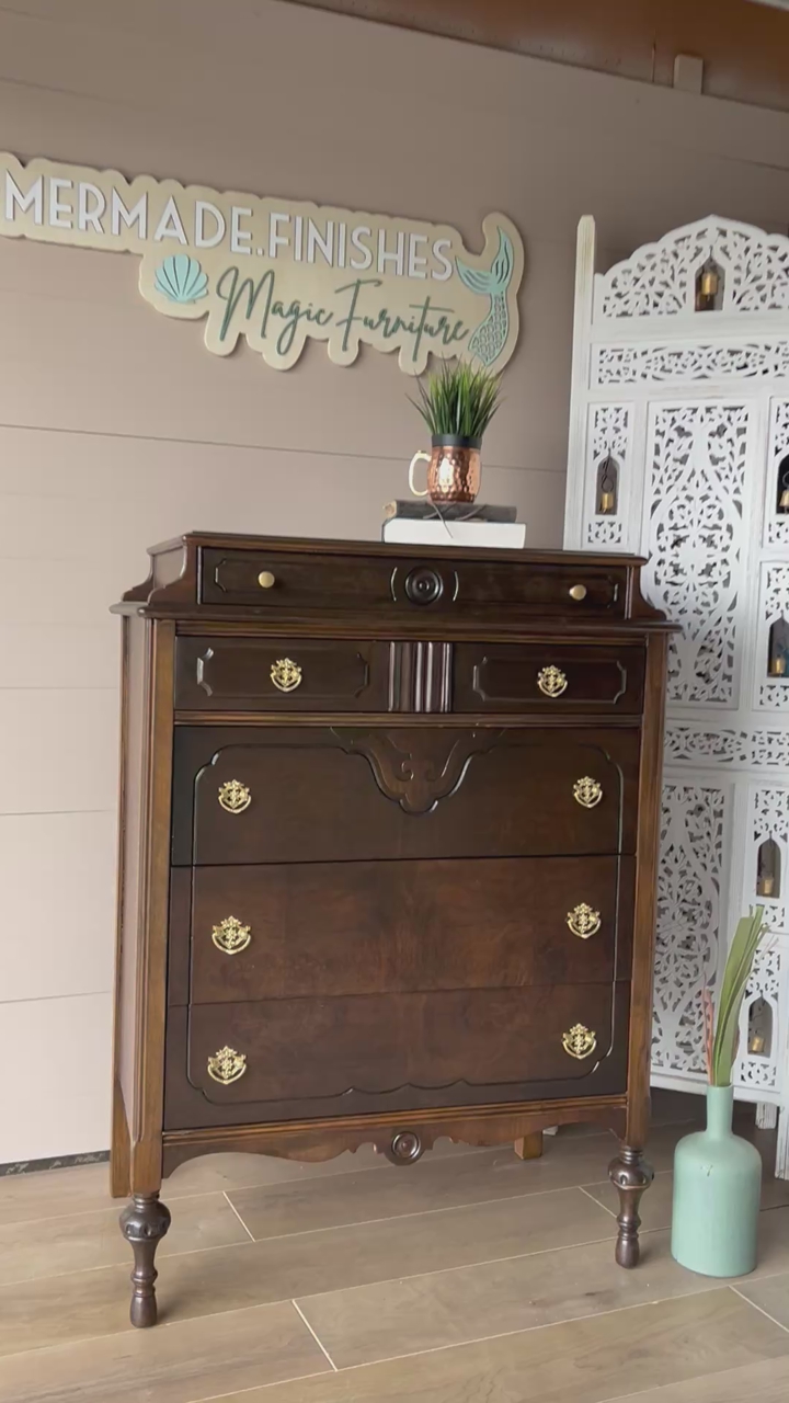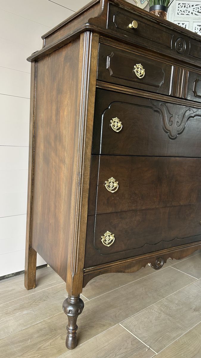 Meet the King — this stunning antique highboy chest features incredible carved detail work, an ornate top gallery drawer, decorative appliqué, turned spindle legs, and original brass hardware with an anchor/crest motif. Professionally refinished in a rich dark walnut that lets the beautiful wood grain and craftsmanship shine through. Dimensions: 46”H | 34”W | 19.5”D Price: $595 This piece is part of a royal court! Also available: The Queen – A taller, equally stunning antique highboy at $595 The Heir – A solid smaller chest at $495 Buy the King + Queen together and get The Heir FREE! Buy the King OR Queen and get The Heir for 50% off! local delivery in the Salt Lake area is available