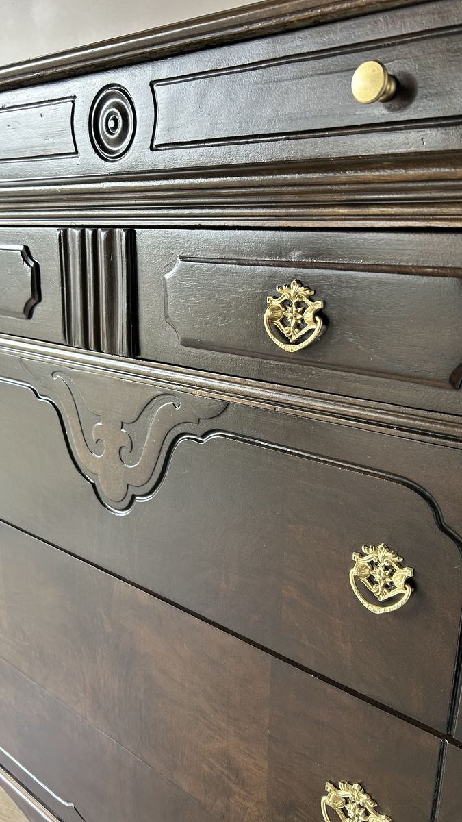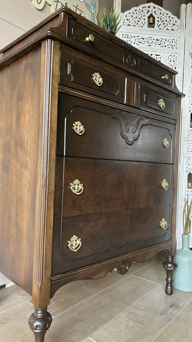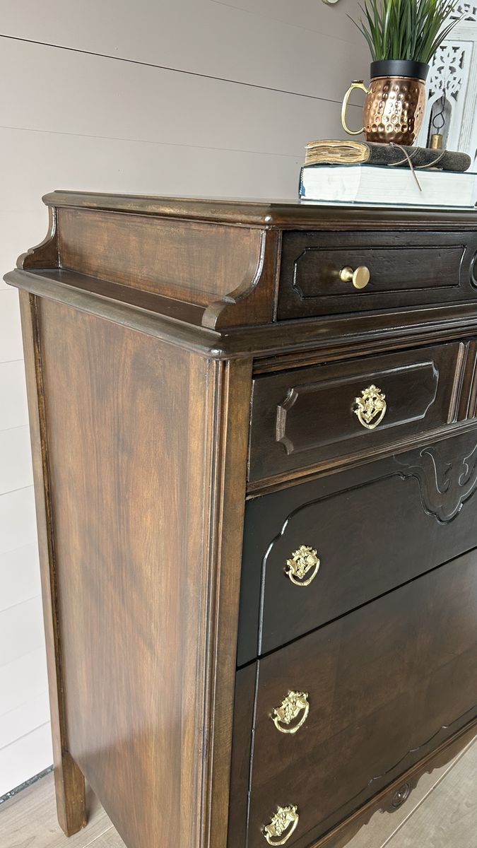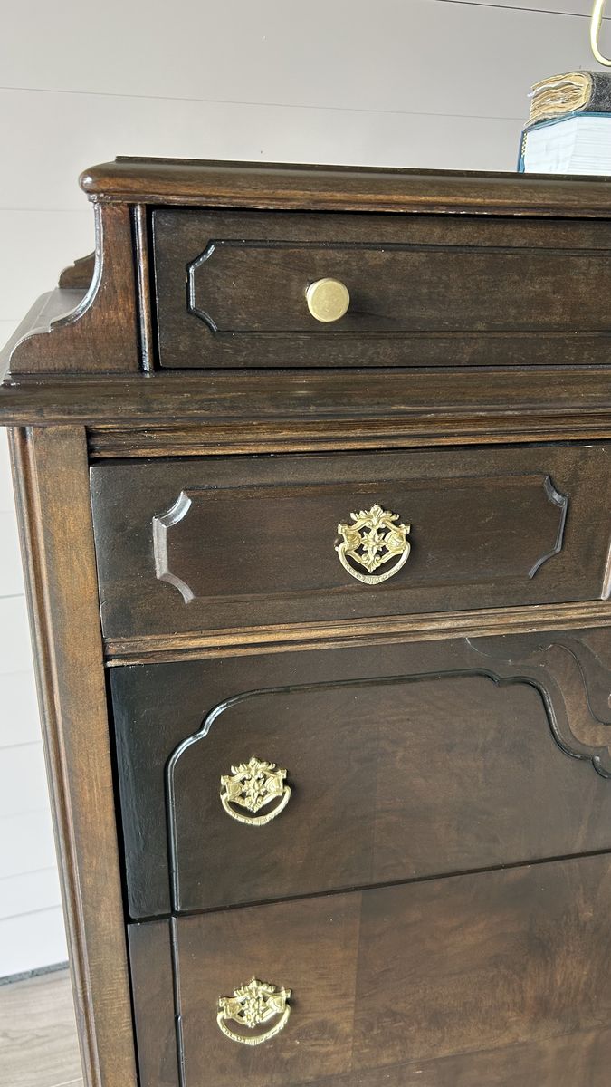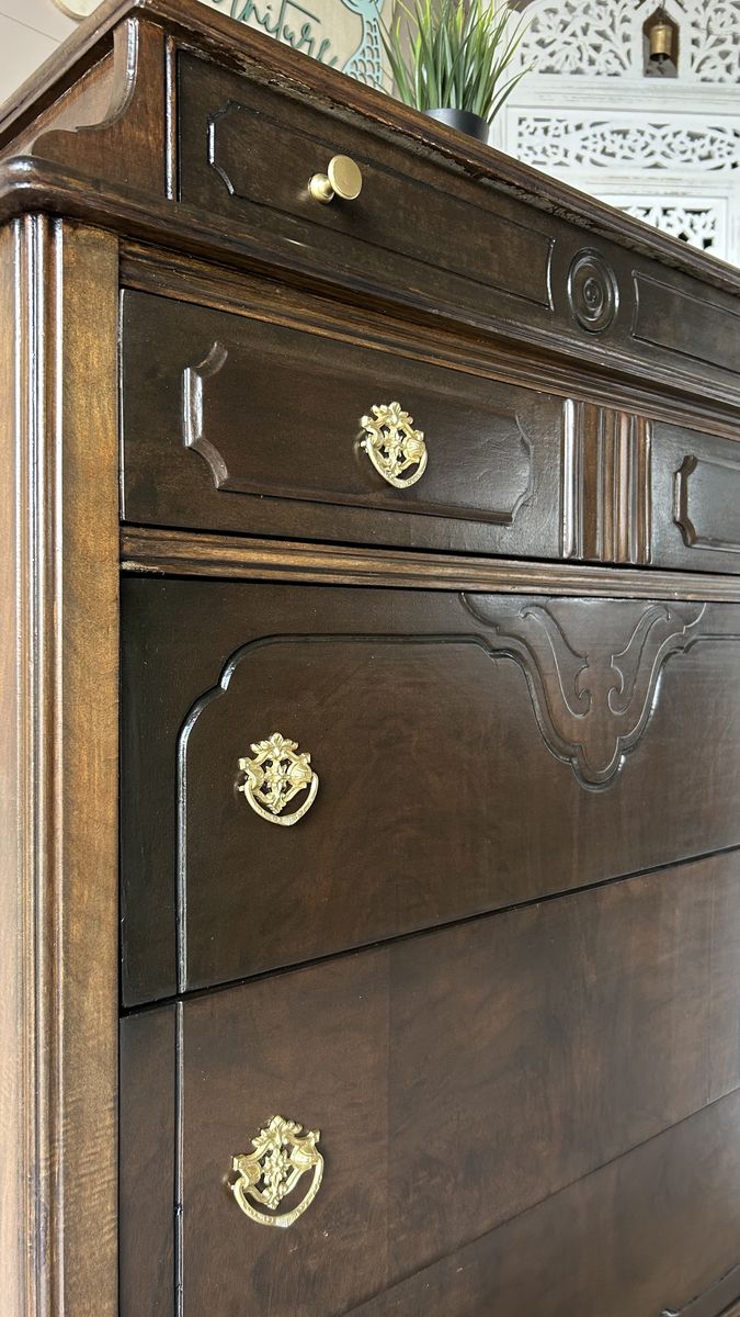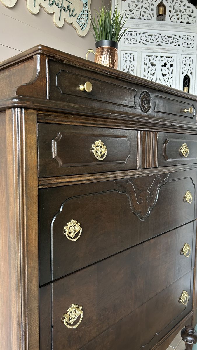 ZelleDelivery Available THE KING – Antique Highboy Dresser | Dark Walnut | Gold Hardware