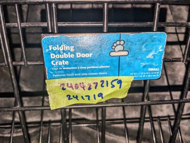 Small Wire Dog Crate. Collapsible design and handle for easy storage and transport. Comes with plastic pan, divider and cushion. Dimensions: 24"L x 16"W x 19"H