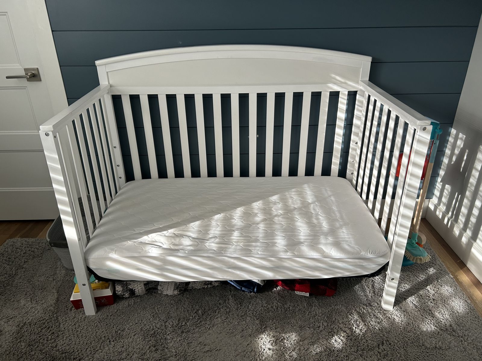 Adjustable mattress heights, double-sided mattress. The mattress and sheets could be included, if interested.; smoke free home. A couple imperfections but in good condition overall. Our little boy is upgrading to a twin size bed
