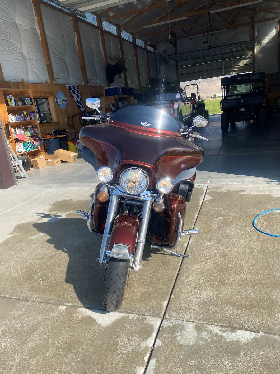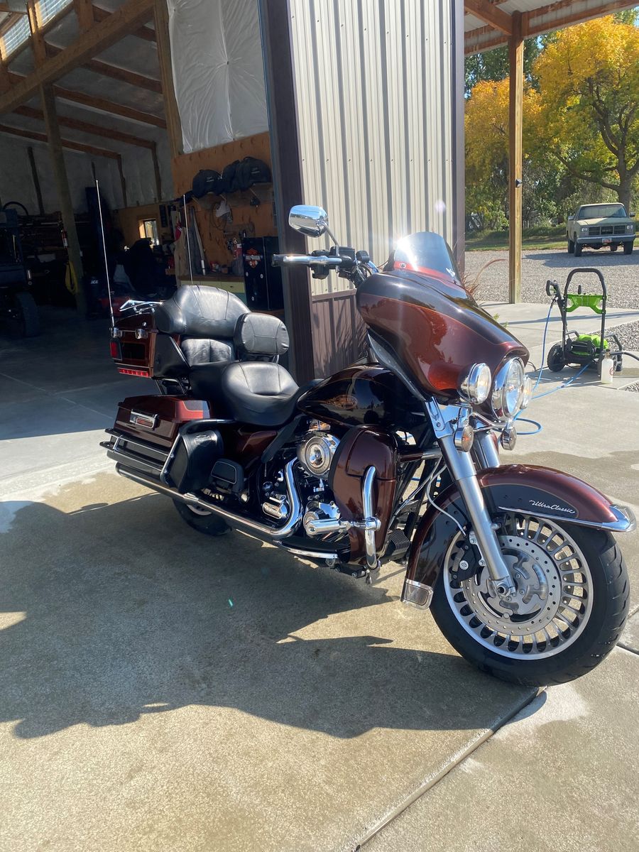 2009 Ultra Classic in rare root beer brown. Clean one owner in excellent condition. Just had the 50k service completed, including two new tires. Has Stage 1 air filter, tune and Rinehart pipes. Includes Harley cover, soft bag liners, GPS, XM radio tuner. Also has the factory rear shocks that have been lowered for easier reach and the low profile seat along with the driver backrest. Just installed new battery.