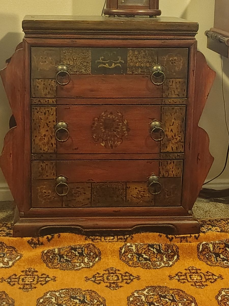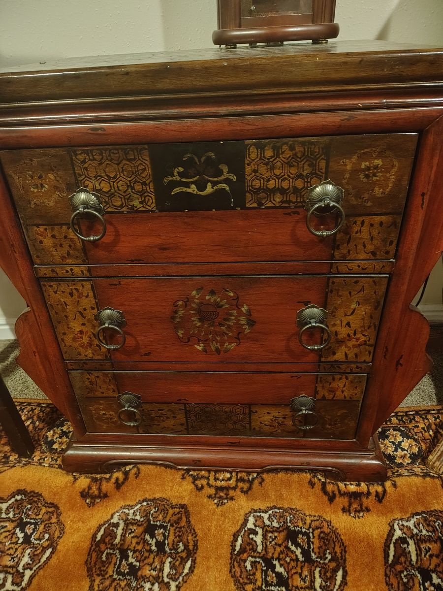 Vintage 100 percent Wool antique Japanese Tansu chest, a traditional portable storage piece known for its intricate wood carvings and ornate iron hardware.