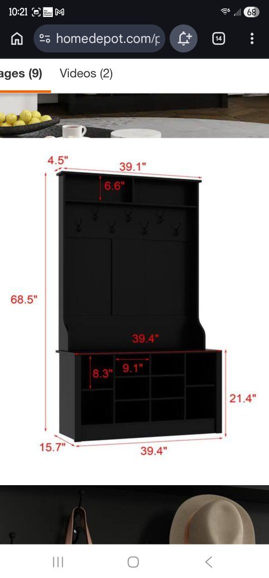 New in box Freestanding Black Hanging coat rack with shoe storage and bench