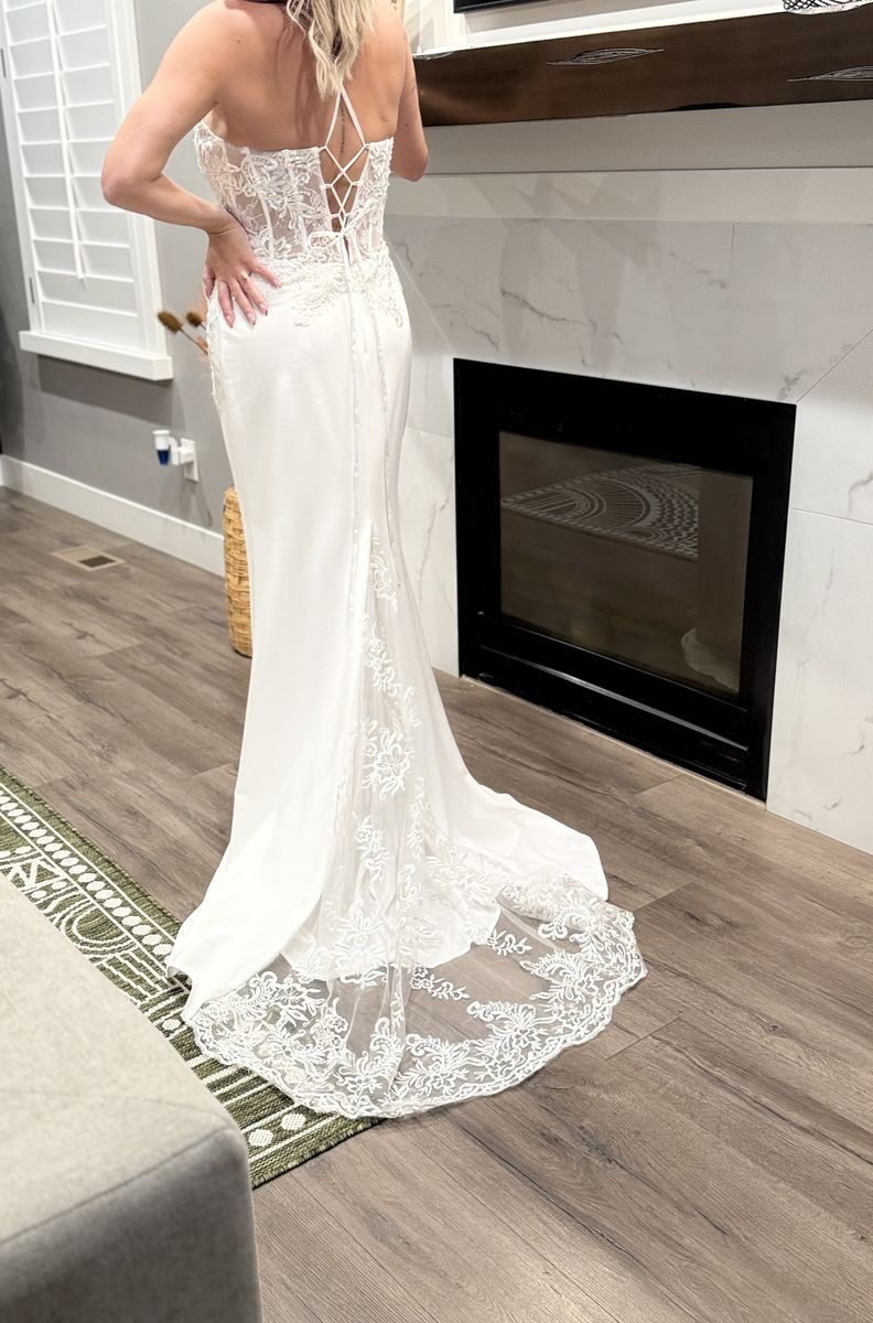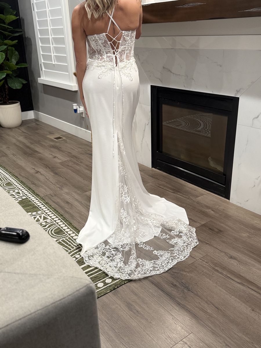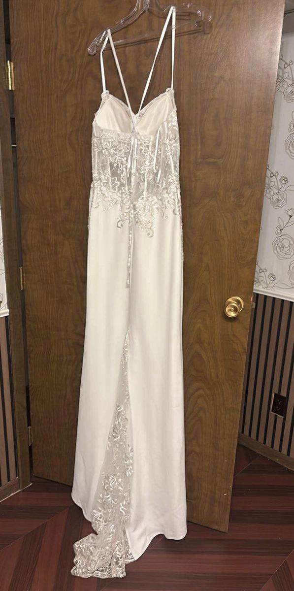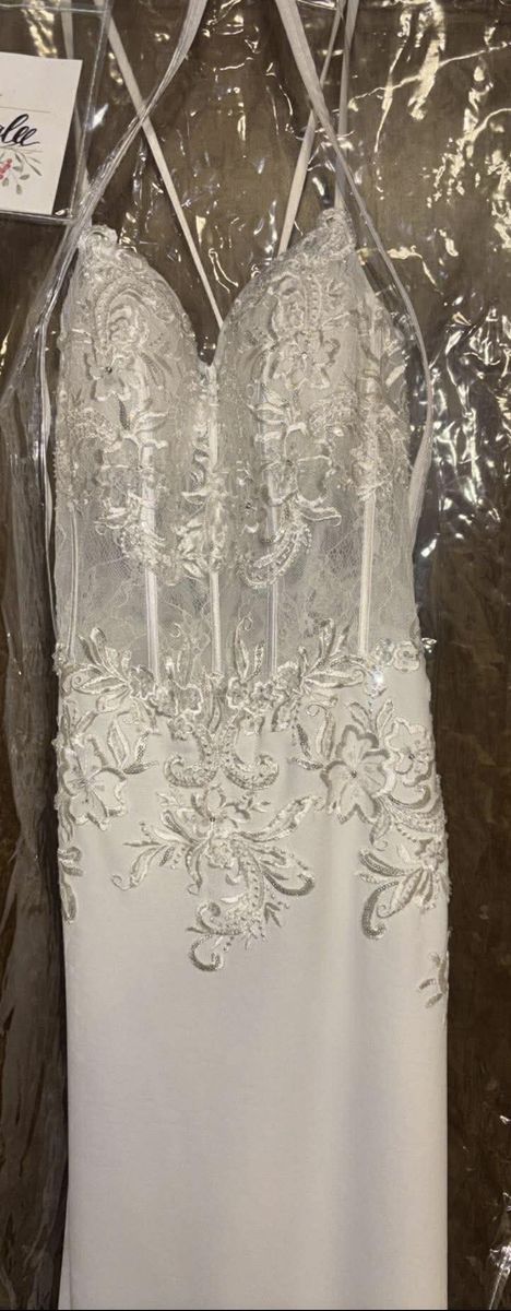 Size 10/12 wedding dress, never worn. I love this dress, but decided to go with my original choice. There have been no alterations made to it.