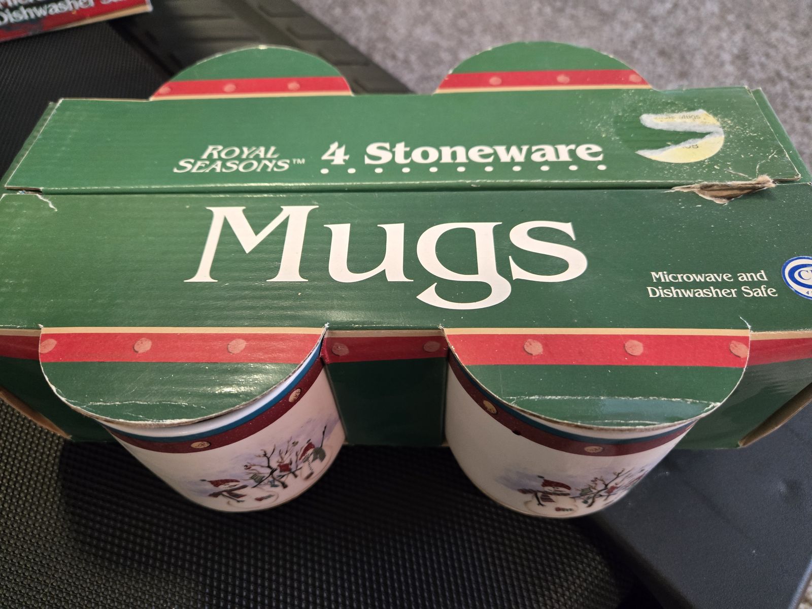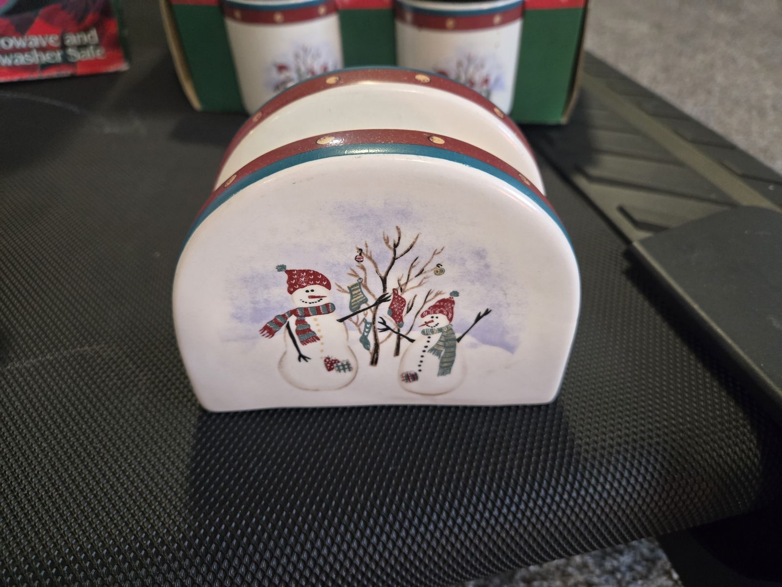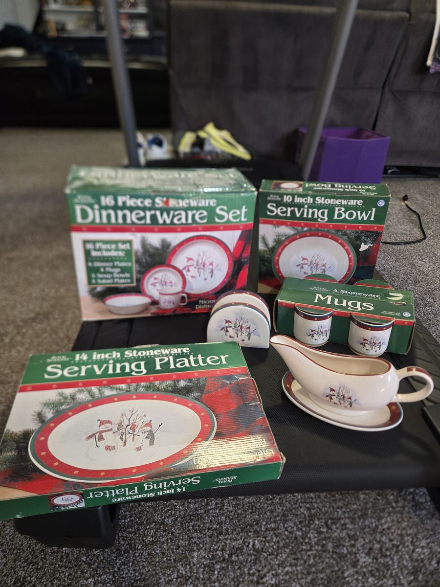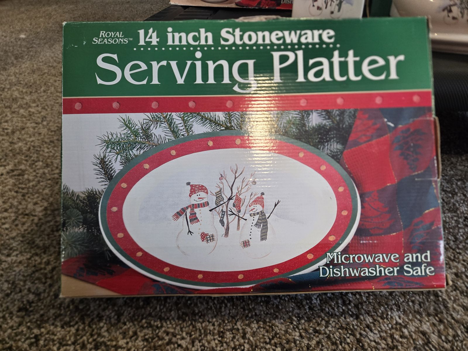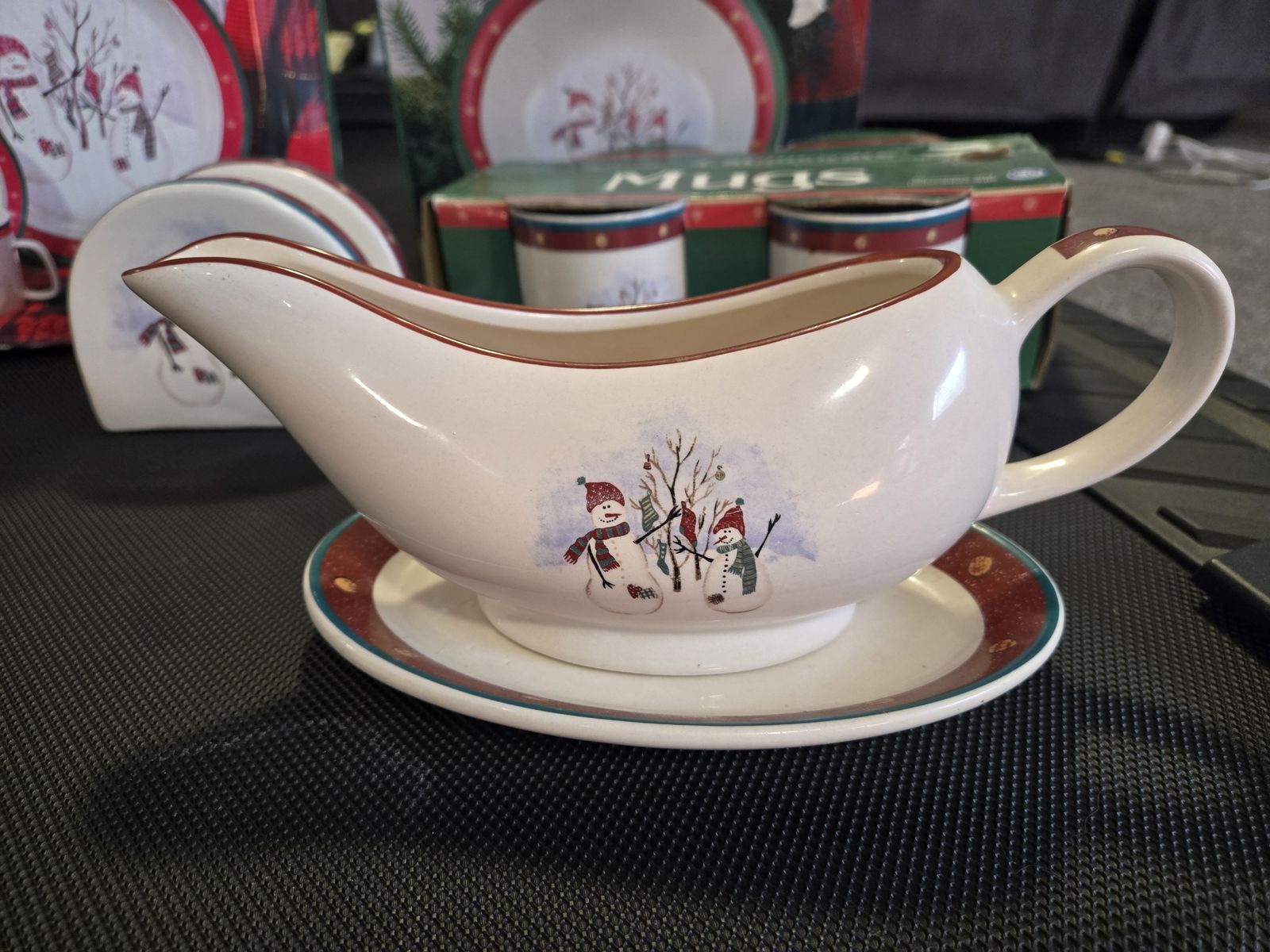 VenmoSnowman Christmas Stoneware Dinnerware set - service for 4 (Dinner plate, salad plate, bowl and mug), 14 inch Serving Platter, Gravy Boat, 10 inch Serving Bowl, Napkin holder and 4 additional mugs. Snowman design. Stoneware. Dishwasher and microwave safe. Total of 25 pieces.