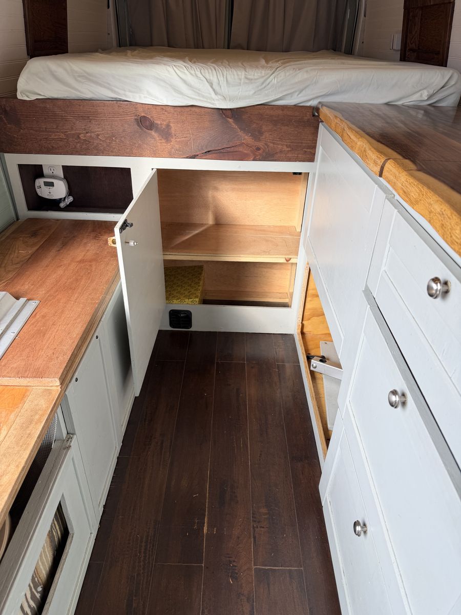Van previously had a fridge; space and wiring are still set up so installing a new fridge is quick and easy.