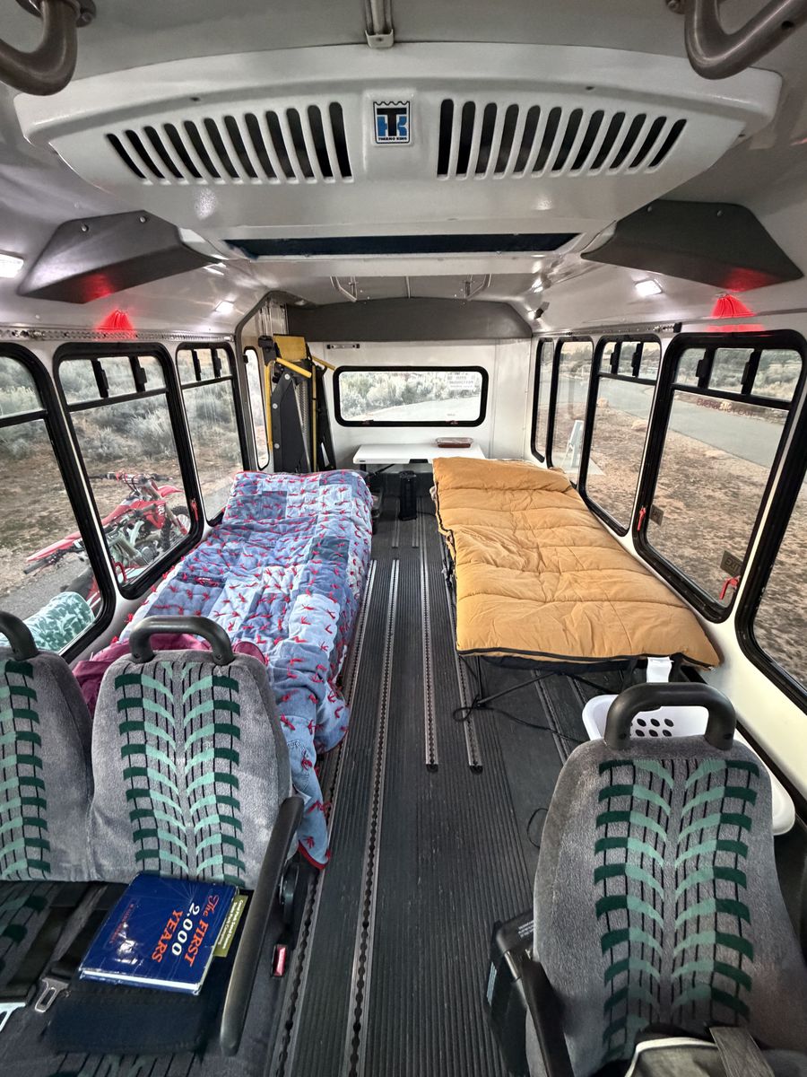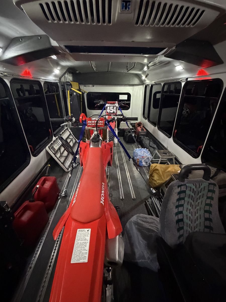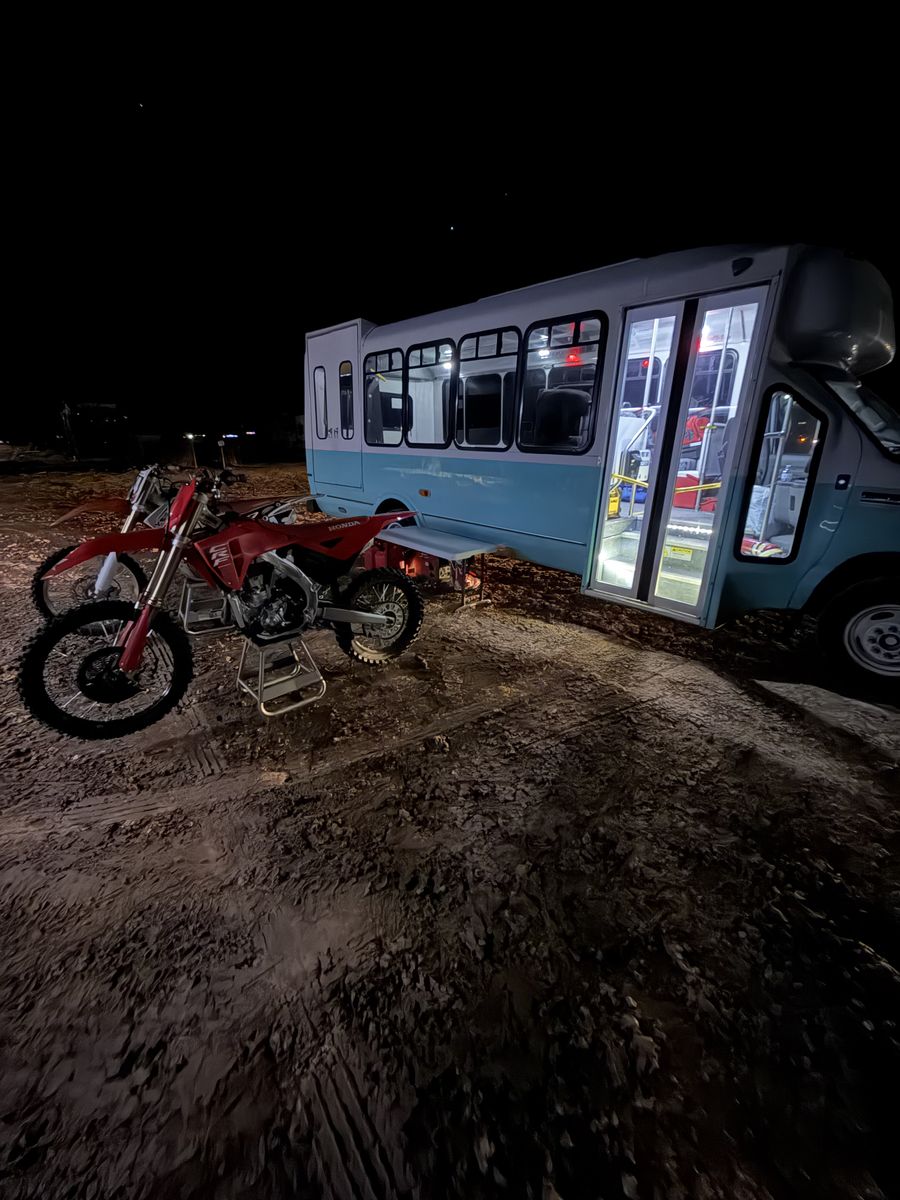 Here is a 2017 Ford Elderado transit van that I converted into a Dirt bike hauler/camper van. I have had 4 full sized bikes tucked in and strapped down, so there is plenty of room for you and a couple buddies! The wheelchair lift works great for loading and unloading your bikes and gear as well. Works great as an overnight camper, we just setup a couple of cots and it is great for a night out. 215,000 miles, but runs perfect. This bus only runs on CNG. Not Gasoline. DM with and questions Will not respond to “is this available?”