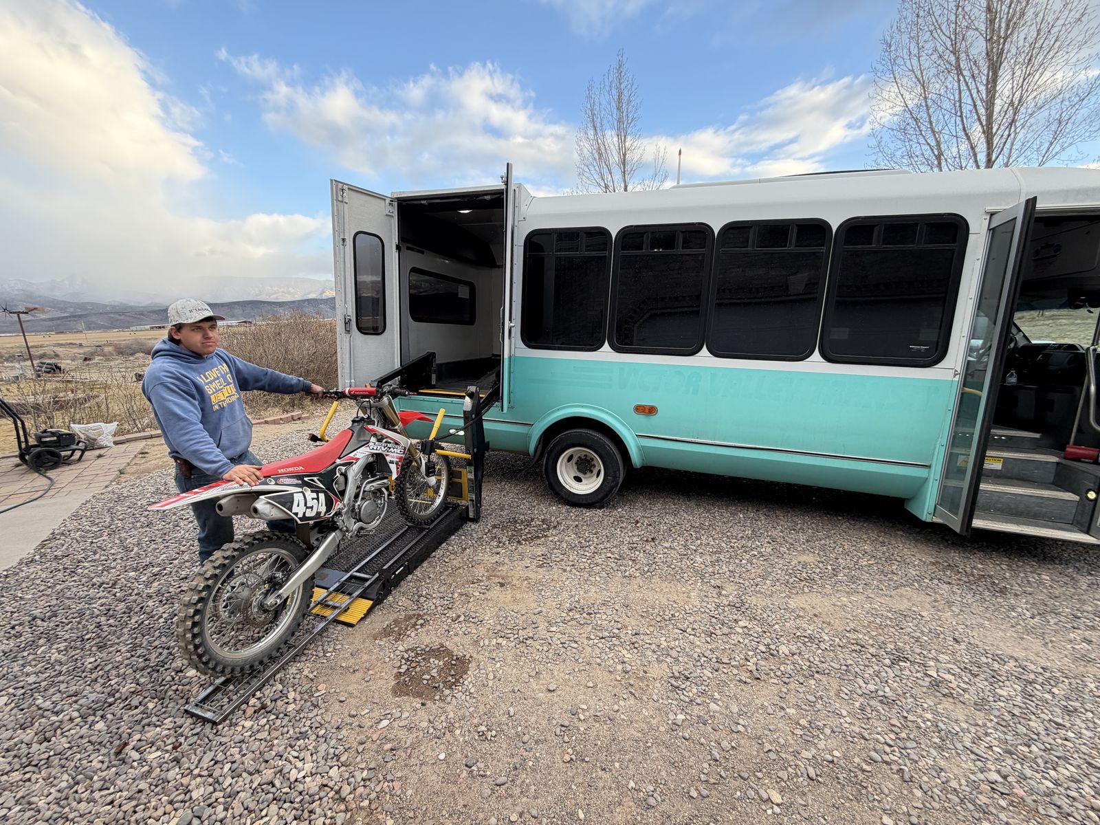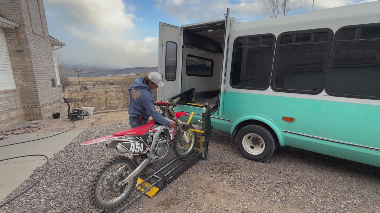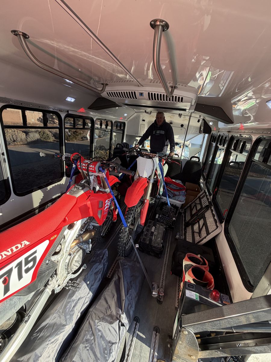 Here is a 2017 Ford Elderado transit van that I converted into a Dirt bike hauler/camper van. I have had 4 full sized bikes tucked in and strapped down, so there is plenty of room for you and a couple buddies! The wheelchair lift works great for loading and unloading your bikes and gear as well. Works great as an overnight camper, we just setup a couple of cots and it is great for a night out. 215,000 miles, but runs perfect. This bus only runs on CNG. Not Gasoline. DM with and questions Will not respond to “is this available?”