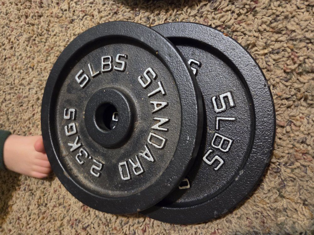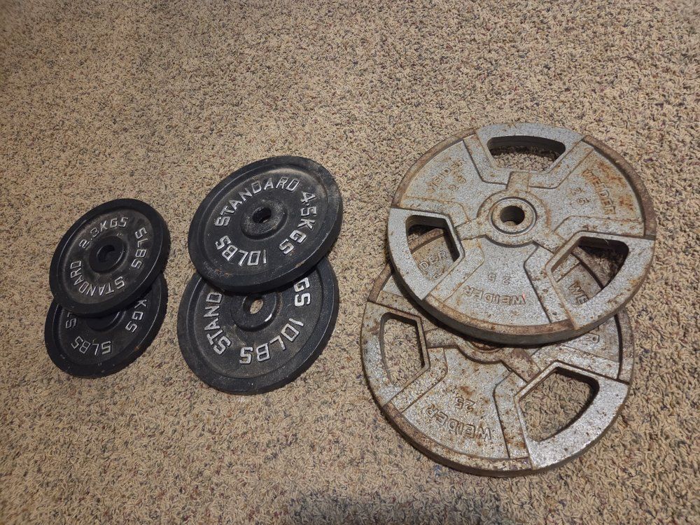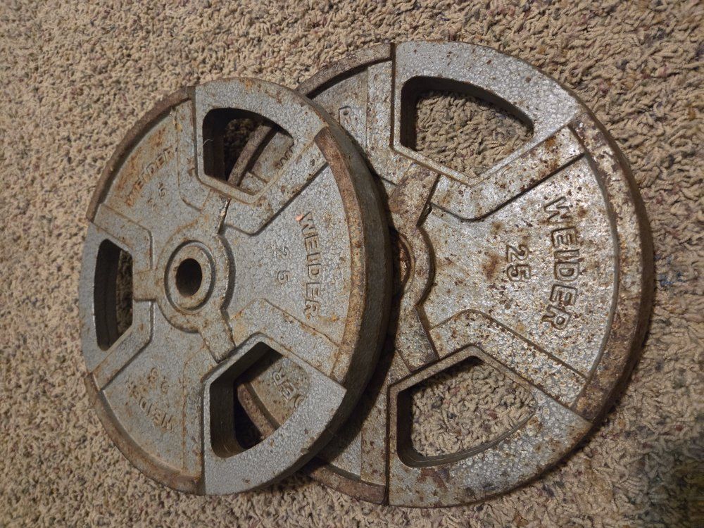 VenmoTwo 25lbs plates, Two 10lbs plates, and Two 5lbs plates. Selling as a set. All Standard brand except the 25lbs plates are Weider.