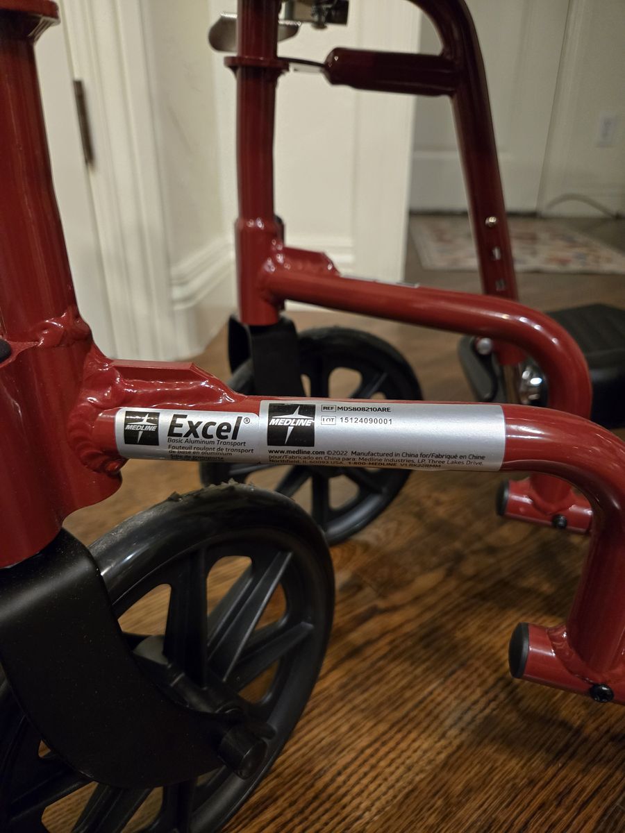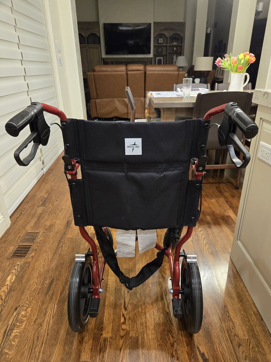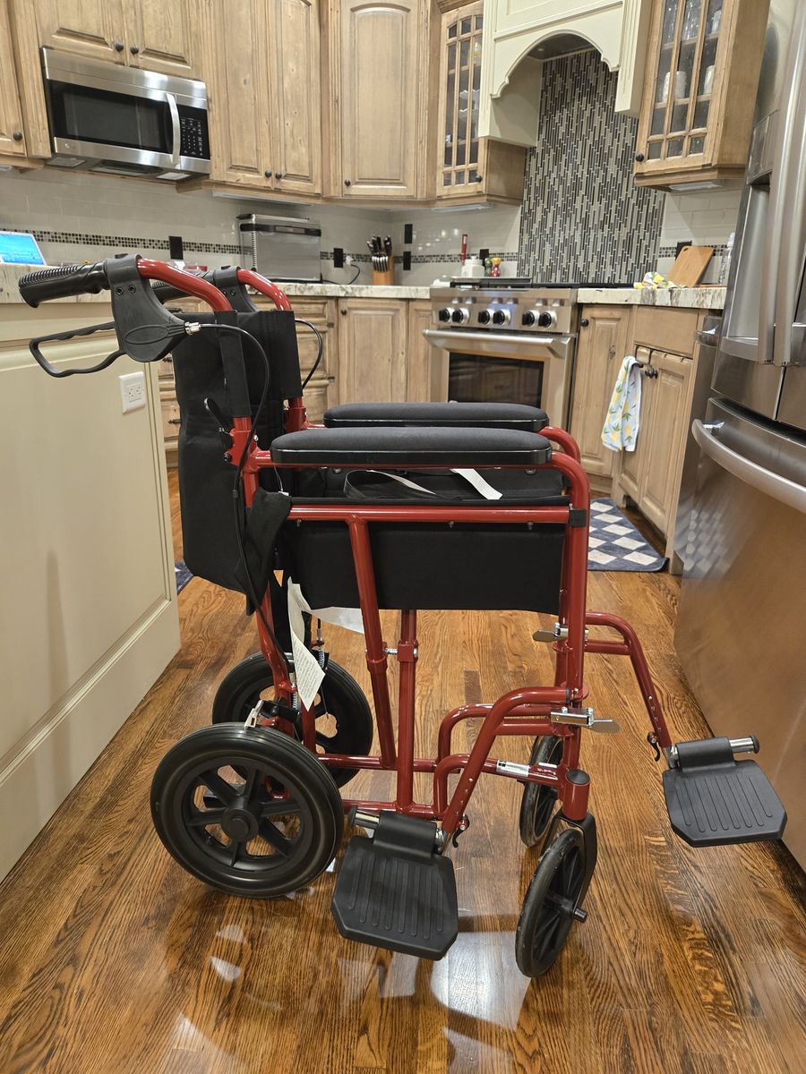 ZelleRed Medline lightweight floding wheechair. This wheel chair is easy to load into a vehicle and folds to save space. Virtually new as it was only used once or twice.