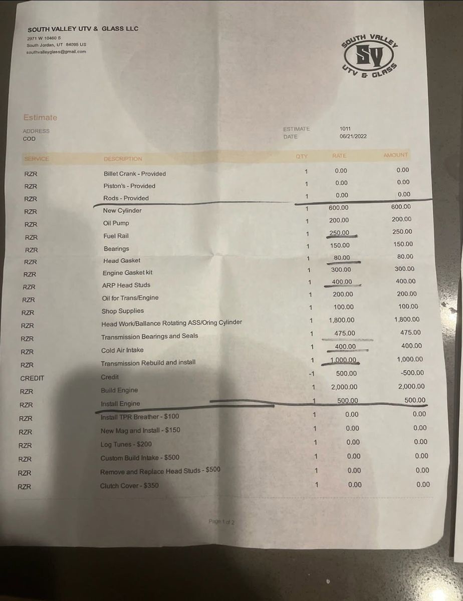 *RSK cage, roof, and full windshield. *SDR doors *PRP seats and door bags *L and W lowering bases *Full stereo with touch screen and great sub under dash. *Zbros stage 3 shocks *DW performance G22 big turbo *72.5mm stroker motor built by south valley UTV. *Power vision 3 tuner with Dave Phillips tunes. *1300 ID injectors. *D&M tensioner. *Built transmission with sandcraft internals. *Walbro fuel pump. *Split cooling tanks *Custom air intake *Works full exhaust *baja design headlights *Rock lights *Quick disconnect R1 whips *TPR catch can This can needs nothing. Runs great. comes with a spare belt. its turn key ready. Im just looking to buy a Pro R