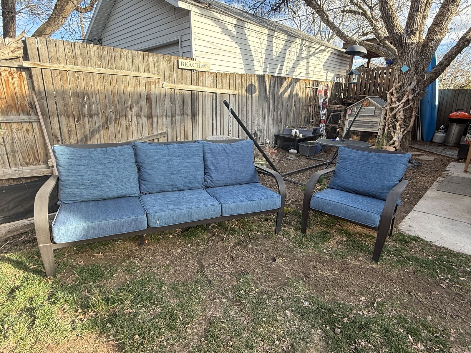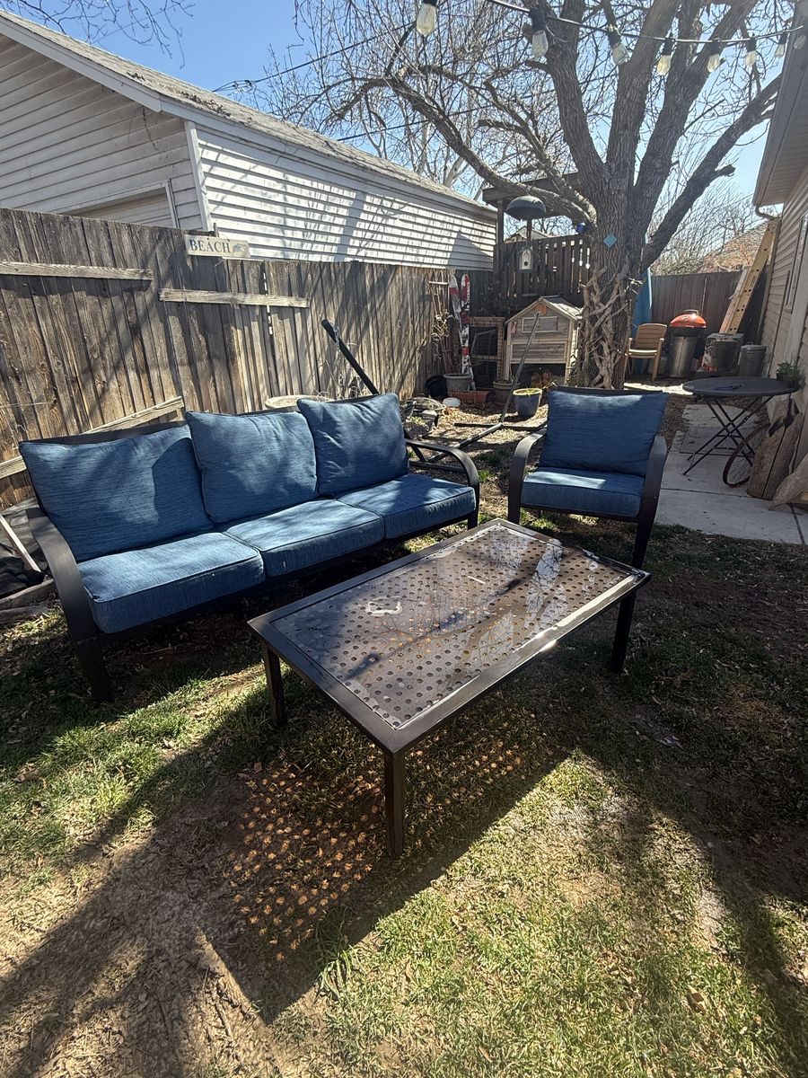 PayPalSuper comfy, sturdy outdoor couch, chair and table set. Metal frame and in great shape. Allen & Roth. Ready for the warm days coming our way! Sugarhouse.
