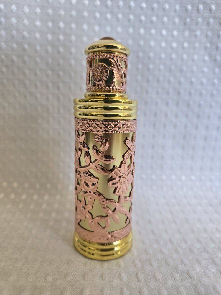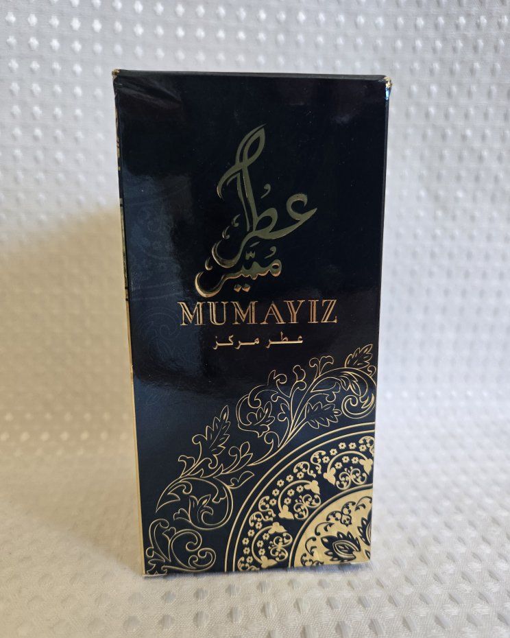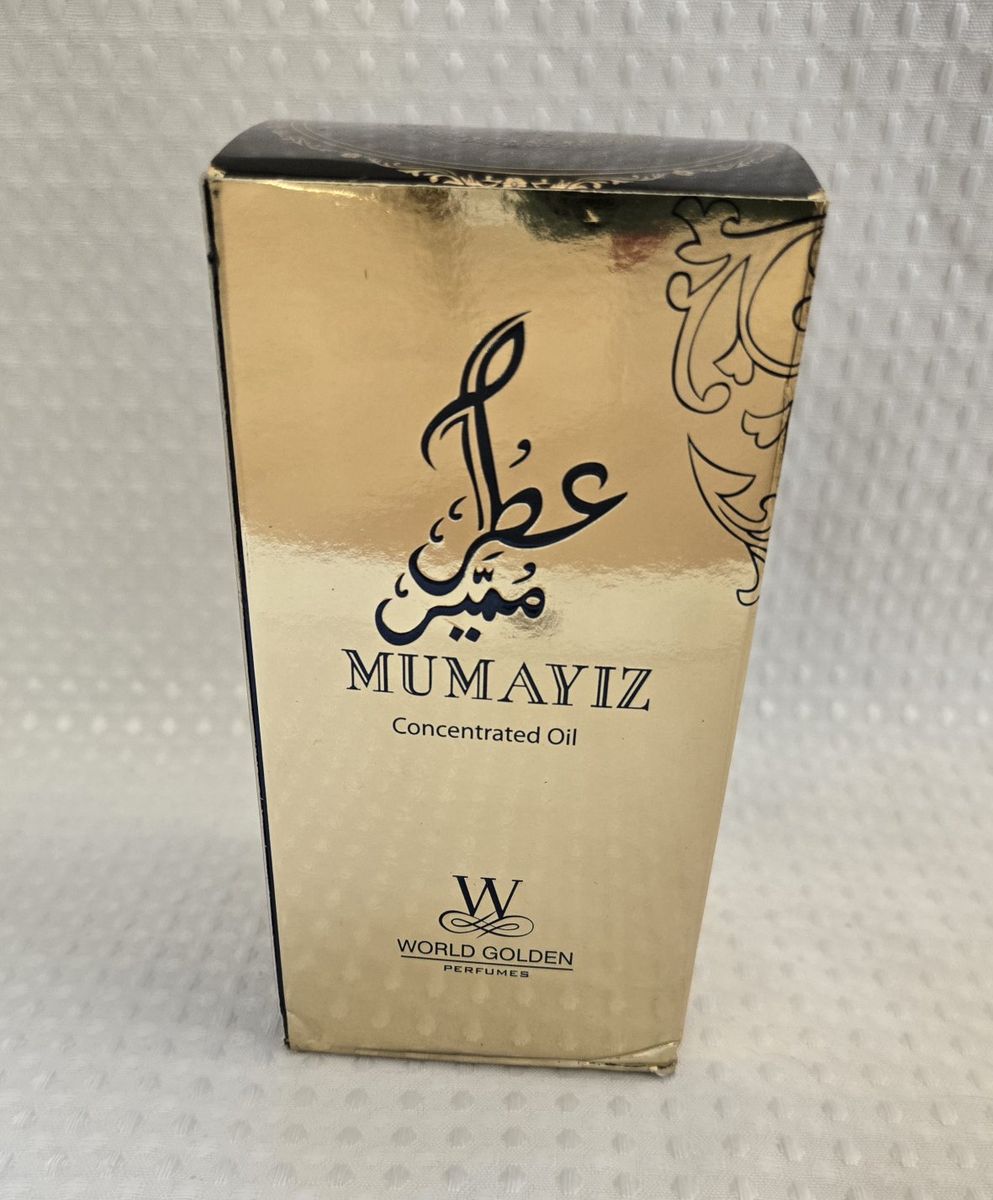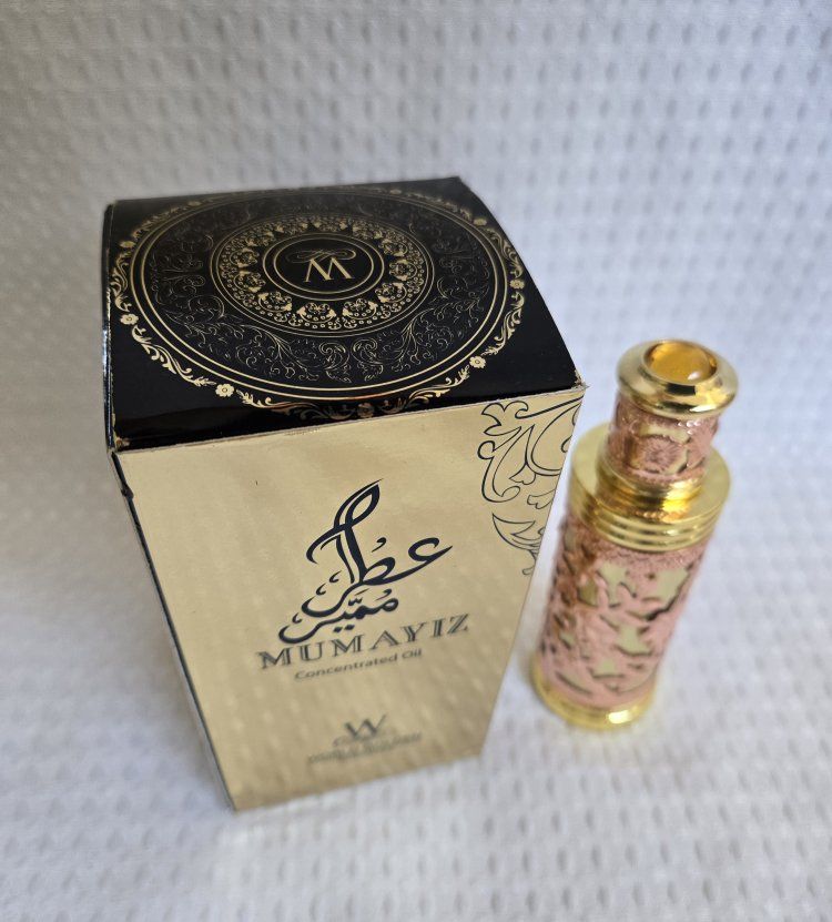 Elegant Mumayiz concentrated oil. Has a beautiful gold and rose gold bottle with intricate floral design, wonderful for collection. Comes with original box. The oil perfumes last for more than a day. Super delicious, elegant and super concentrated!