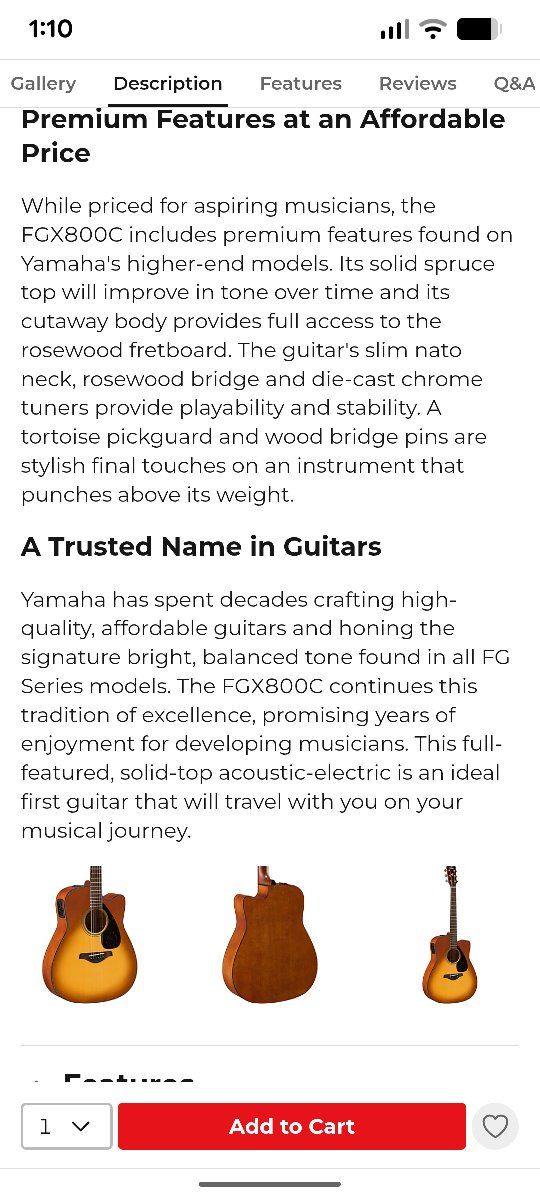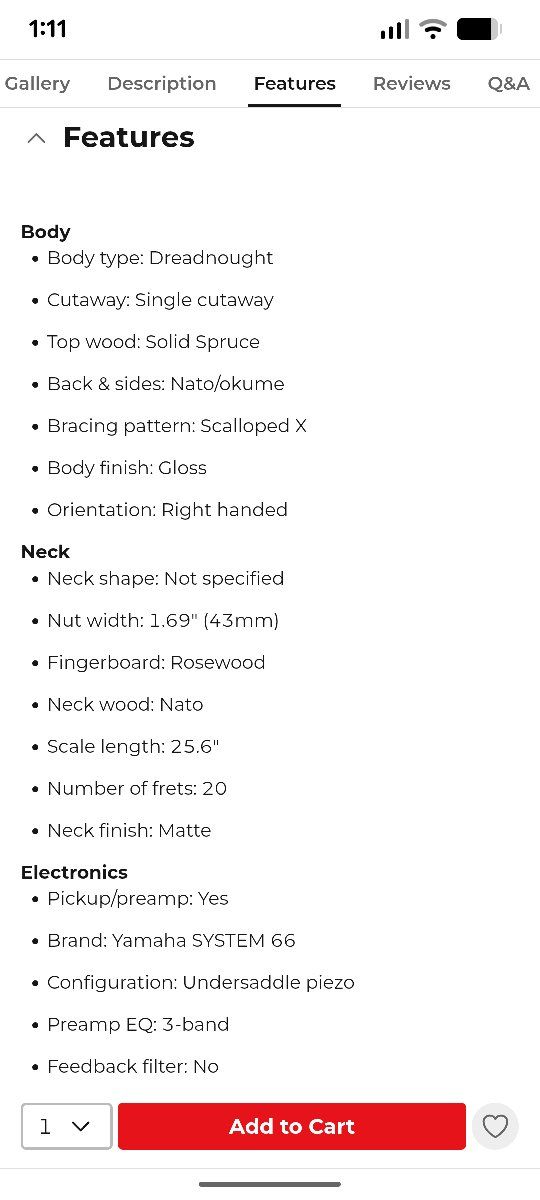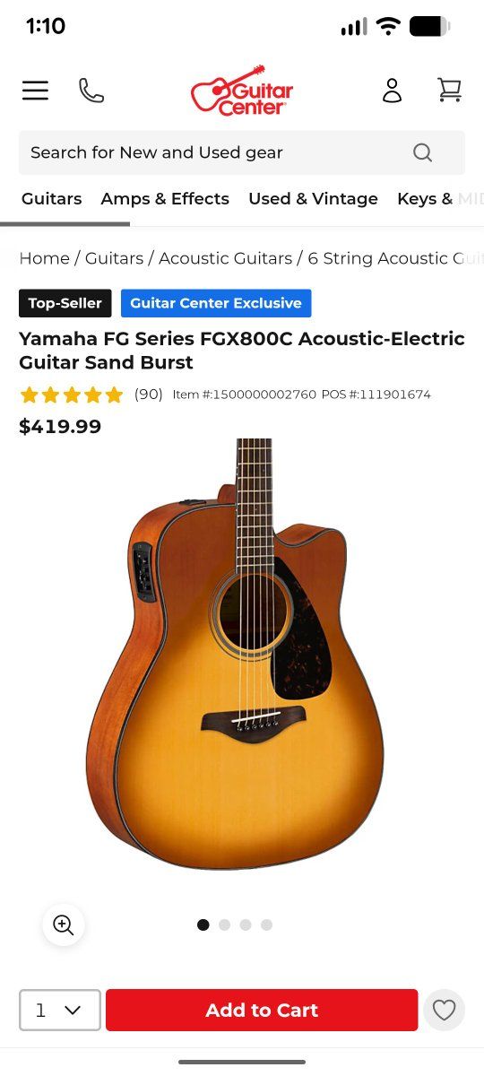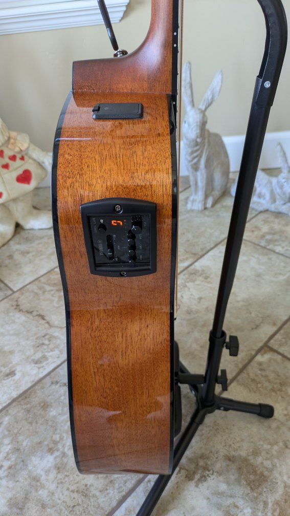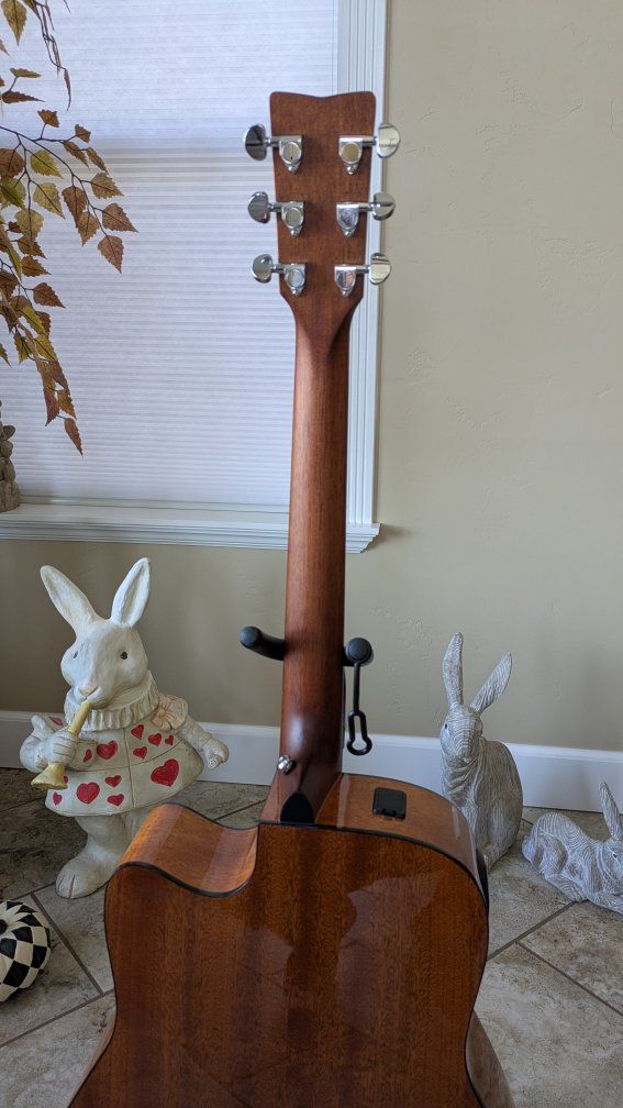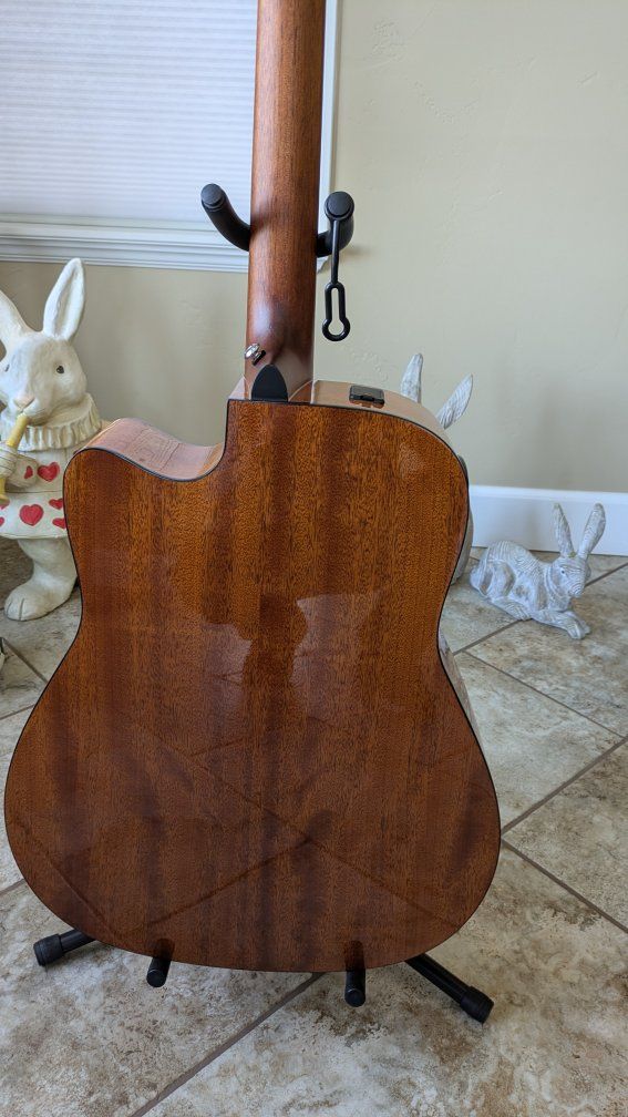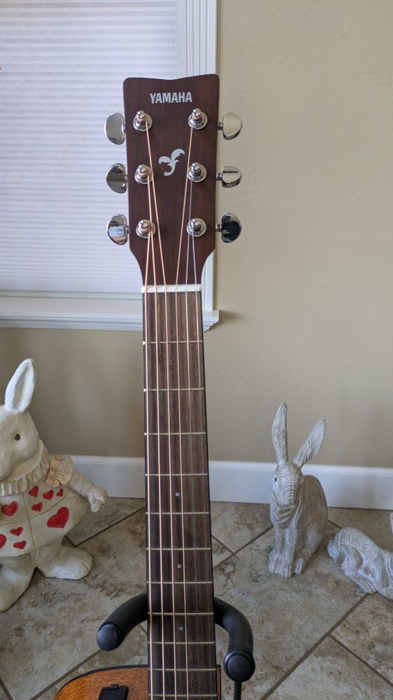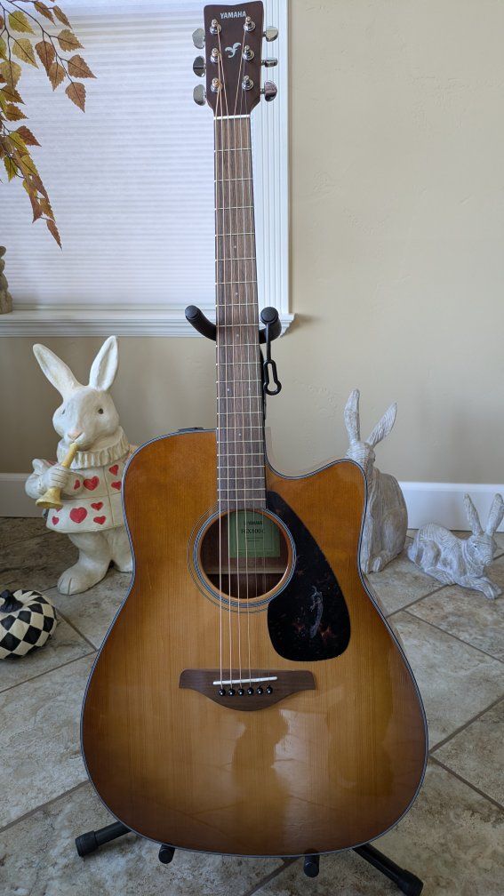 I bought this guitar new from Musicians Friend one month ago. It is a beautiful guitar and has amazing sound. Yahama makes the best entry level acoustic guitars available. I am a beginner guitarist and after having for a month I decided the dreadnaught body is too large for me. I just ordered the exact same guitar with a smaller body. I changed the strings to Elixir Phosfor Bronze 11 - 52 and installed a front strap button. I can change it back to the original strings if you prefer. The finish is called Sand Burst and it is an amazing, beautiful guitar in perfect, like new condition. New from Musicians Friend with tax is $450.