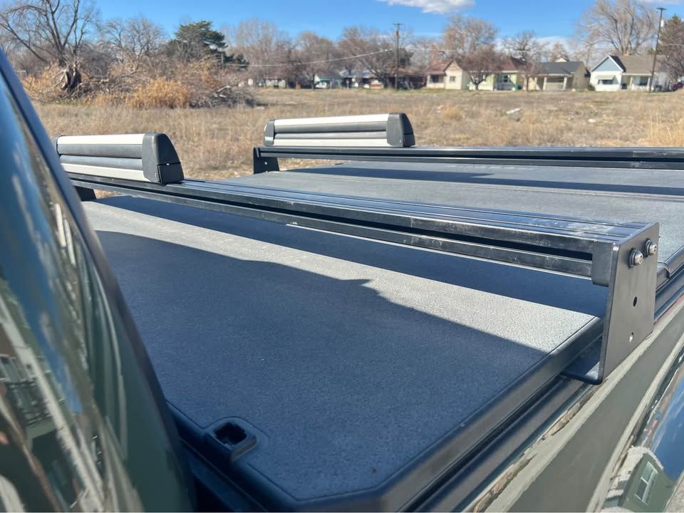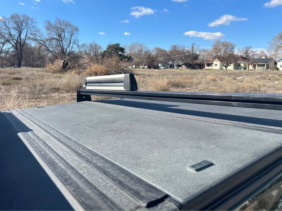 OEM tonneau cover for third gen Tacoma short bed. Can provide hardware if buyer can swap bed caps. Bed rack and ski rack not included.
