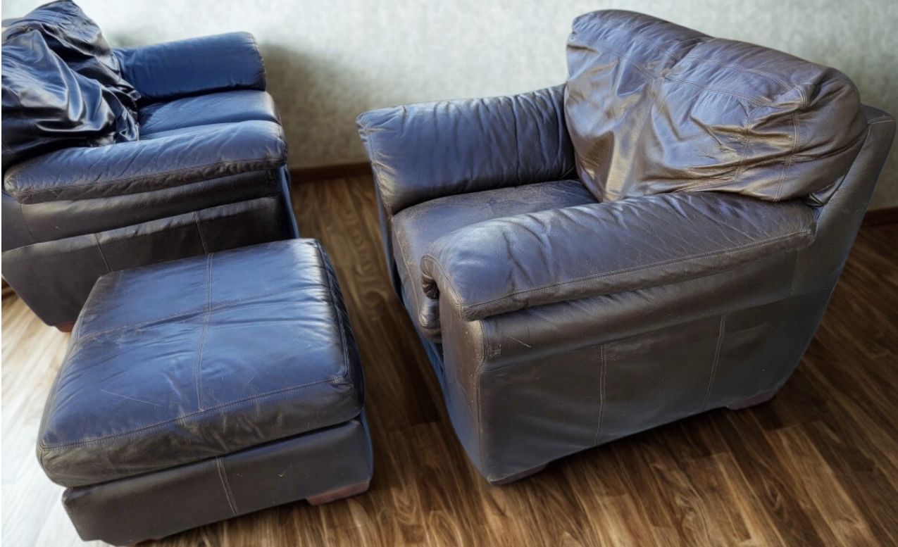 VenmoFcfs. Comfy brown leather sofa, armchair, and ottoman set. All pieces match. Has brown leather upholstery. I will deliver for a fee.
