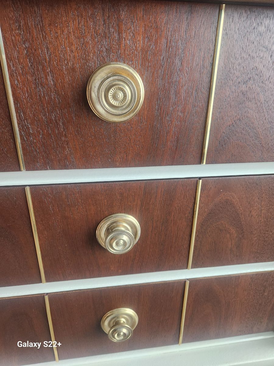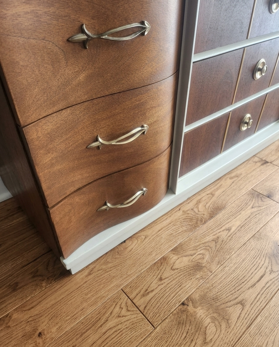 Original Hardware: Features elegant "starburst" style pulls on the curved drawers and sleek circular knobs on the center drawers.