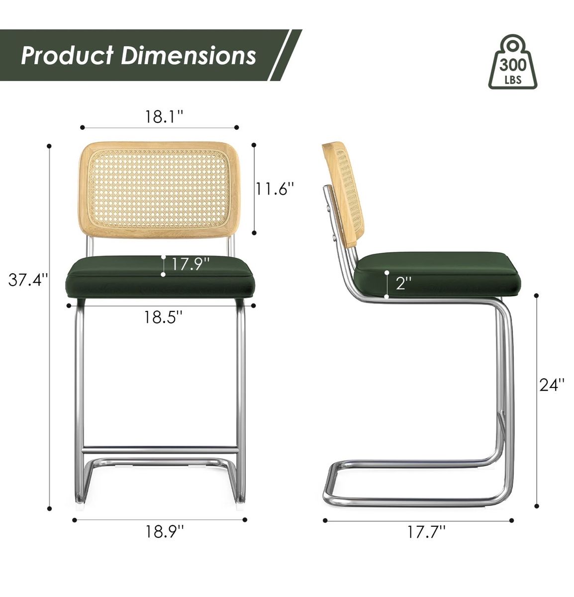 VenmoFarini Velvet Counter Height Bar Stools Set Of 2 With Rattan Back, Cantilever Comfort