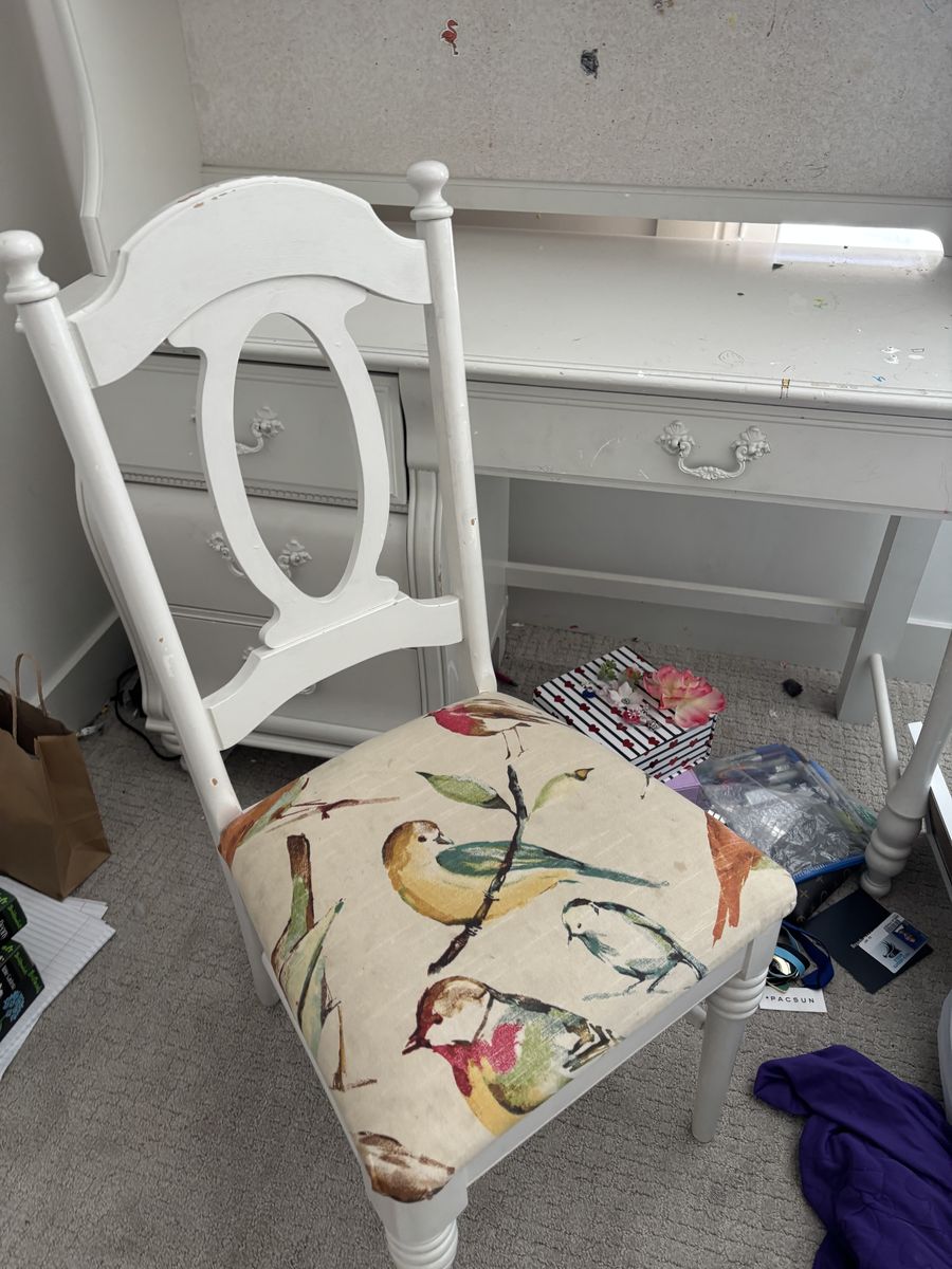 Features:• Built-in hutch with shelves for books or decor• Three drawers for storage• Spacious work surface• Solid, sturdy furniture• Matching chair with bird-pattern cushion included