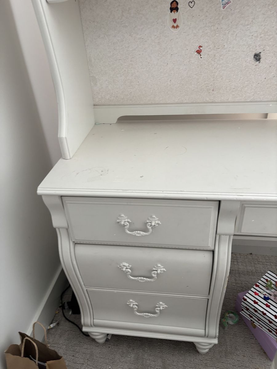 The desk has great bones and is sturdy, but it does show some cosmetic wear from normal use. It would be a great piece to repaint or refresh, and the quality construction makes it worth the effort.