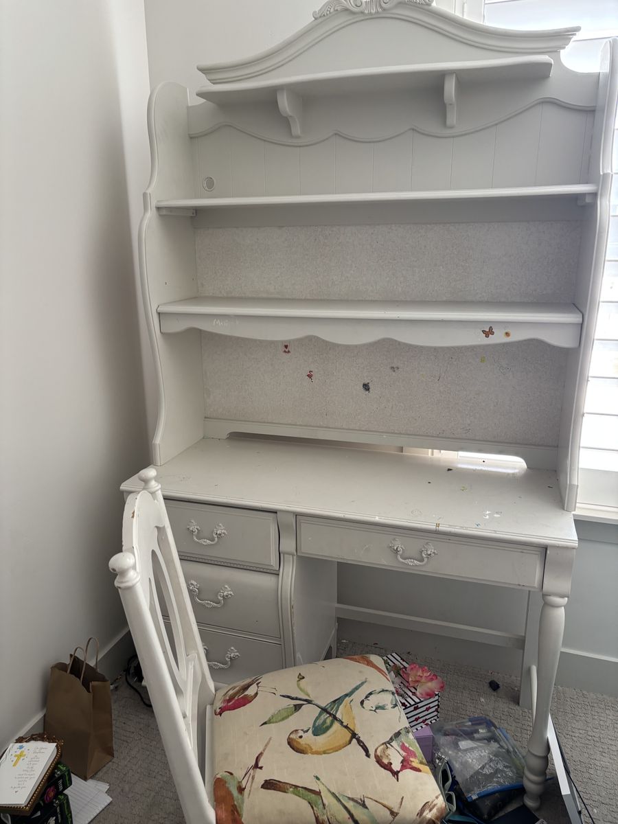 Selling a solid wood desk with hutch and matching chair. This would make a great homework desk, craft station, or bedroom workspace.