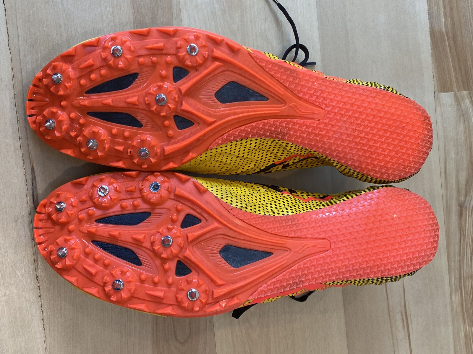 These spikes were only worn twice. They are in great condition. However, the left shoe is missing one spike.