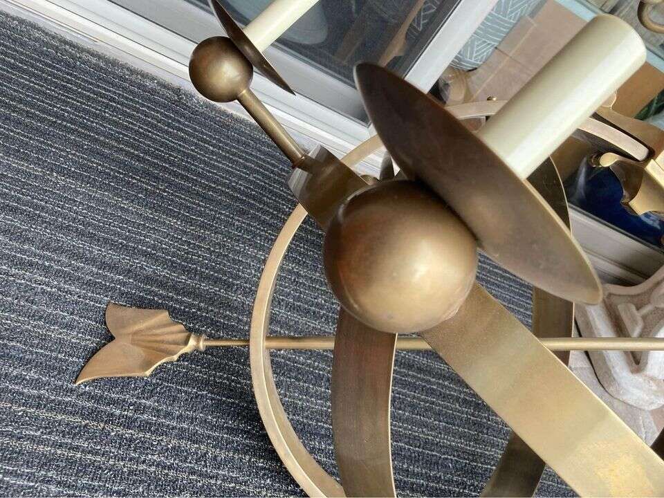 This six-light statement fixture blends traditional design with modern craftsmanship, featuring elegant brass bands and arrow accents inspired by celestial navigation.