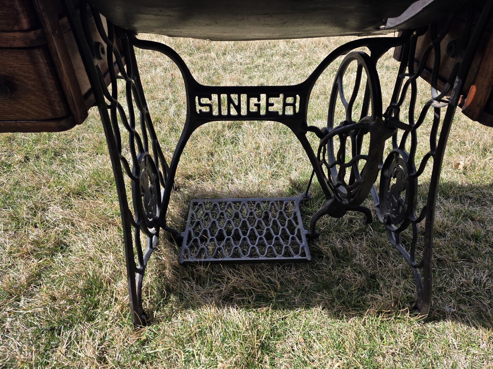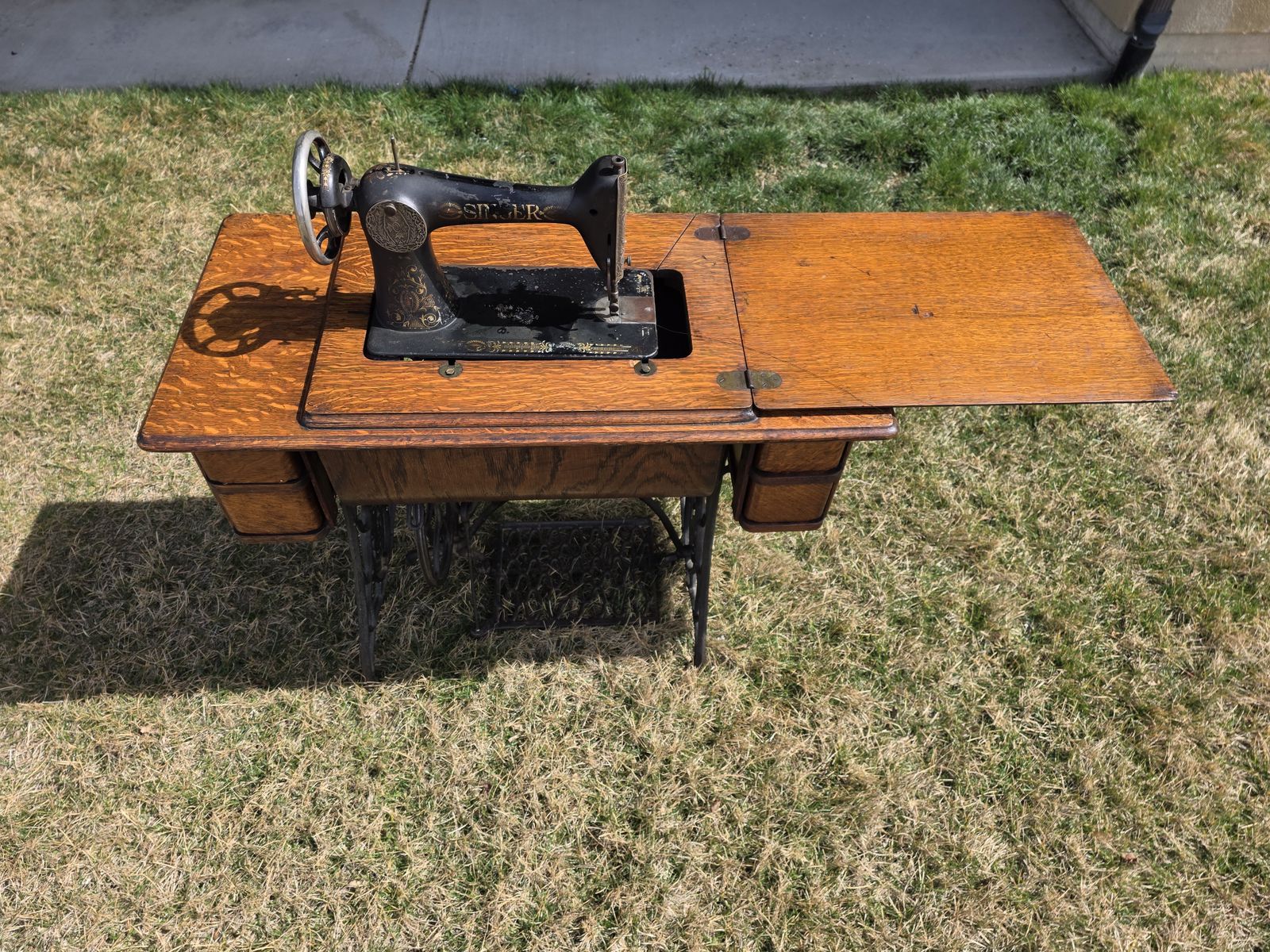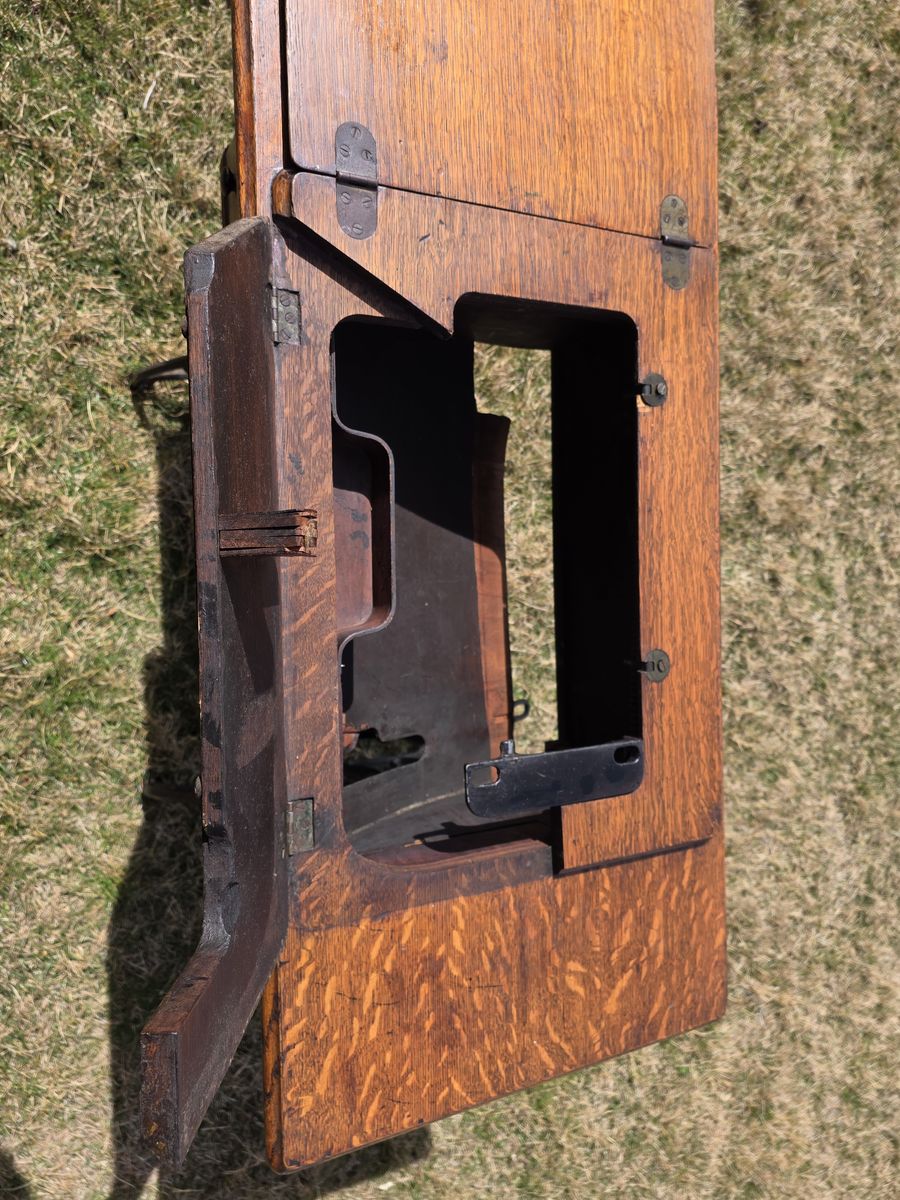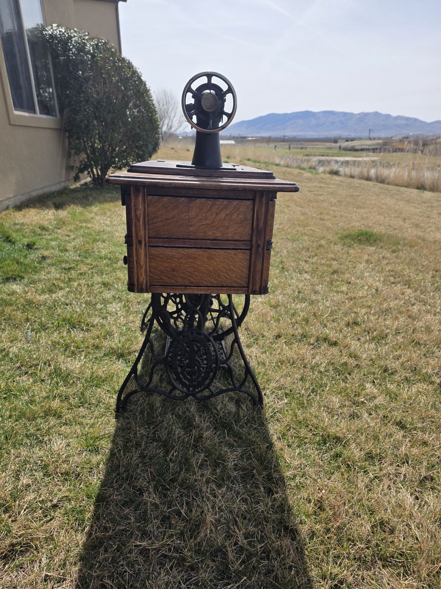 VenmoAntique Singer treadle sewing machine in beautiful oak cabinet. Early 1900s machine with original cast iron base and foot pedal.
