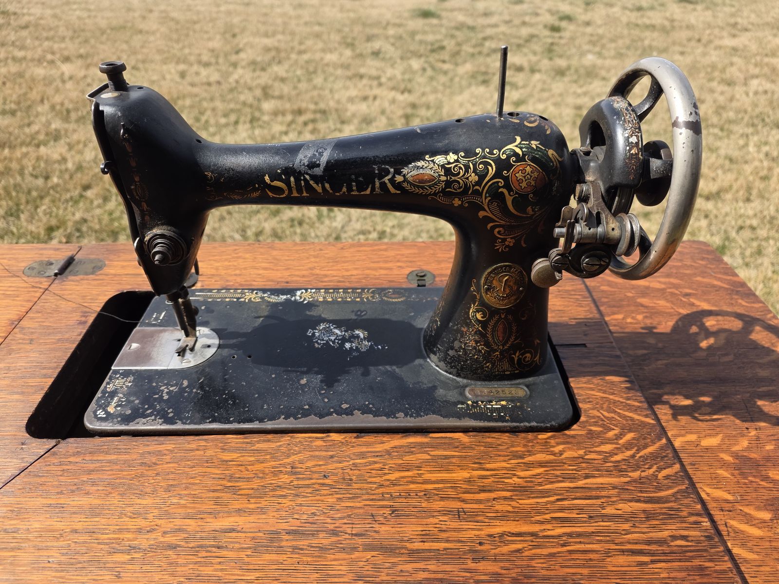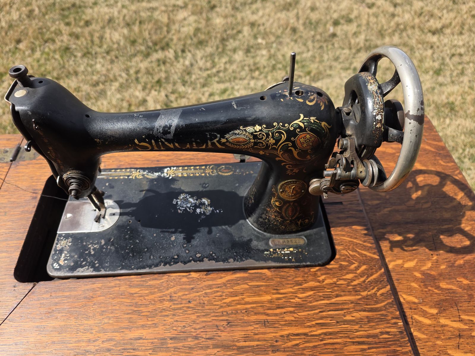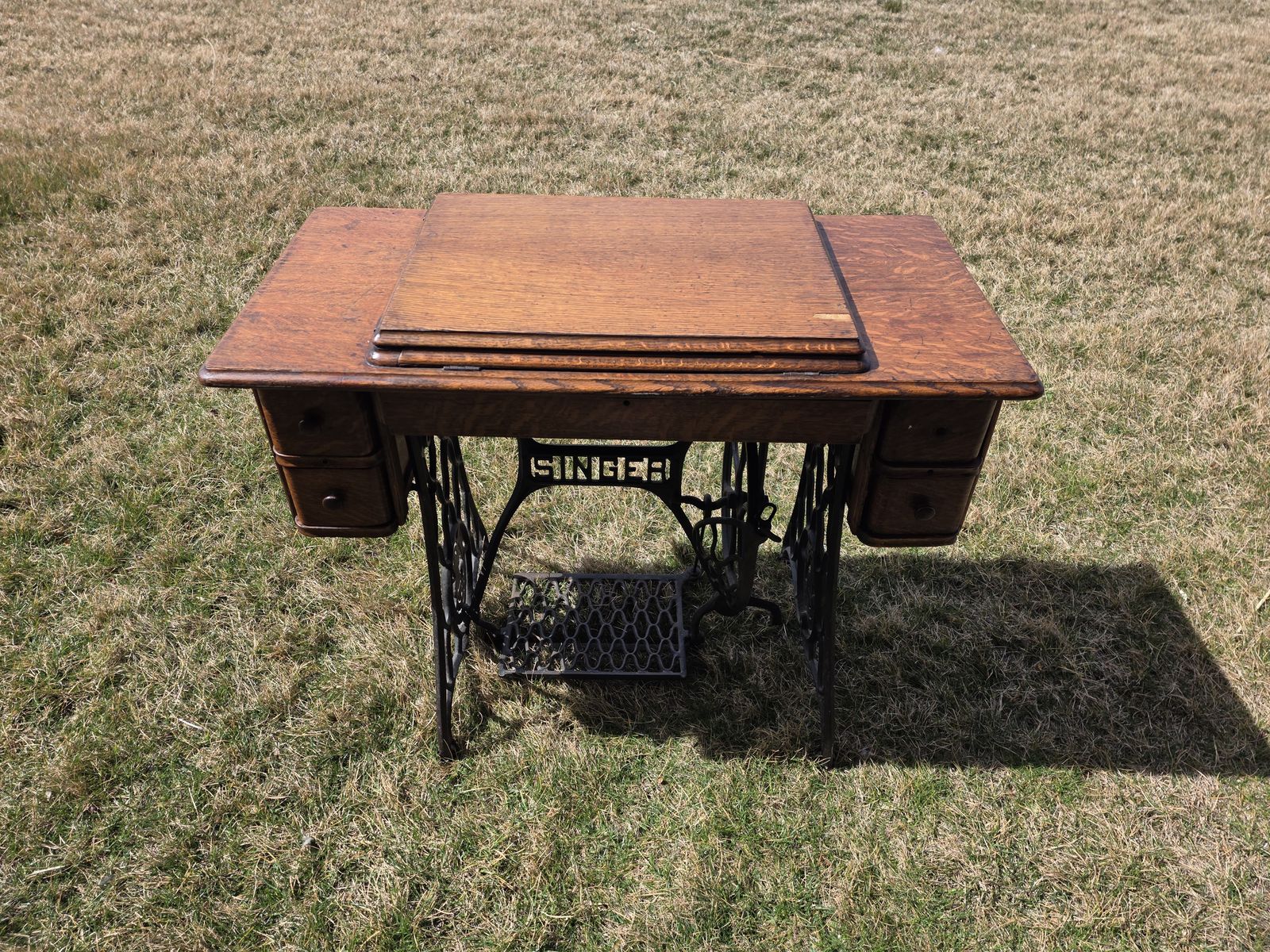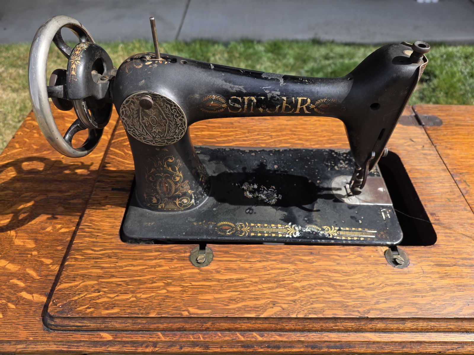 VenmoAntique Singer treadle sewing machine in beautiful oak cabinet. Early 1900s machine with original cast iron base and foot pedal.