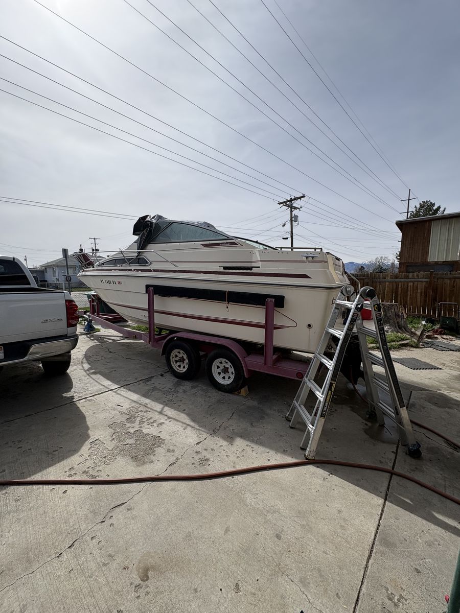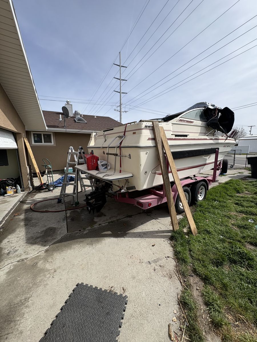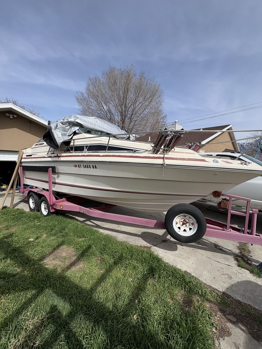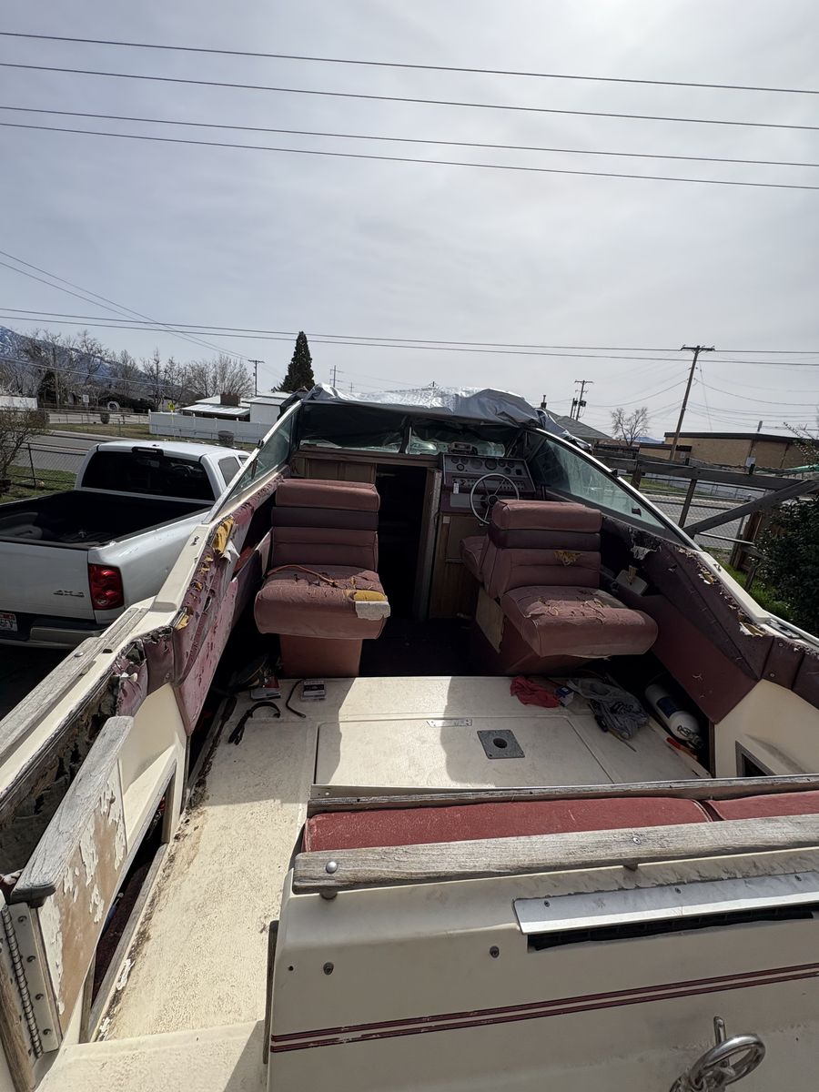 Interior is usable, but needs to be redone. Just found out engine needs new exhaust manifold and risers. The trailer is in great shape and worth asking price motor fires up. $1200 obo might consider a trade