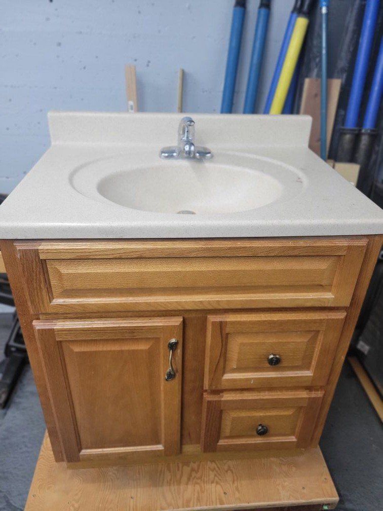 bathroom vanity in great shape. 22" deep 31"wide 35" tall (to the sink 38.5" to the top of the backsplash)