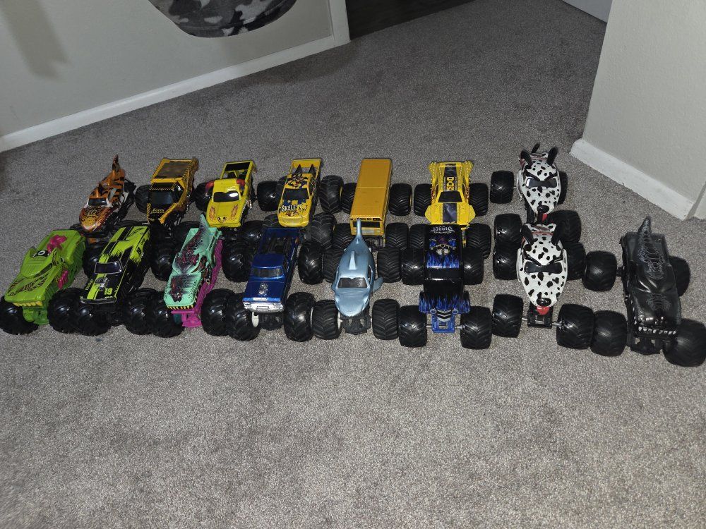 15 Monster trucks that are the 1:24 scale, still in good condition. we got rid of the broken ones.