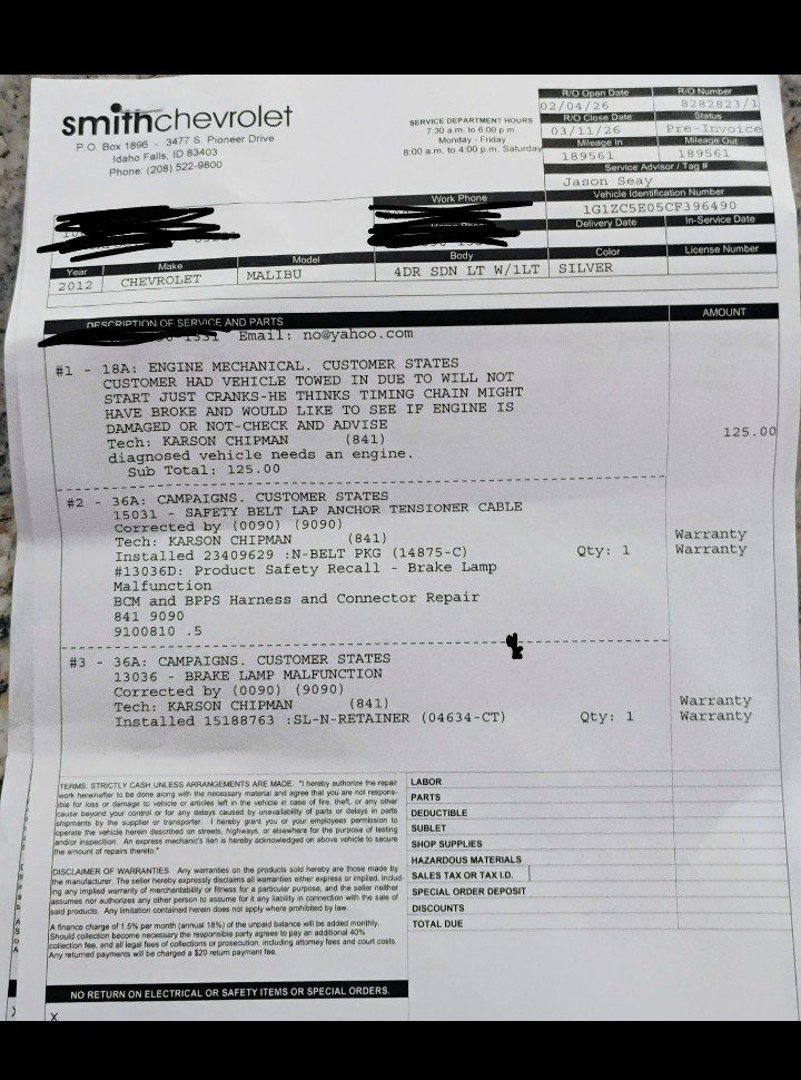 VenmoPurchased car for my daughter in December of 2025. We drove it maybe 100 miles before the timing chain broke and seized up the engine. Had it checked out at dealership for true diagnostics. Will provide paperwork with serious inquiries only. Vehicle has around 190k on odometer. Will come with extra set of snow tires on rims used only 3 months I was told. Tires on it are excellent. Interior clean electronic all work. AC heater ects. Does had little bumps and scratches. Really clean. Located in Idaho Falls. Price is firm.