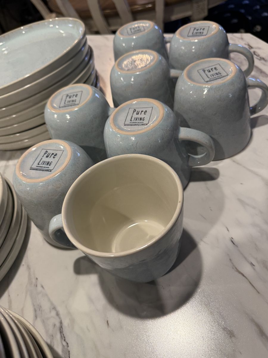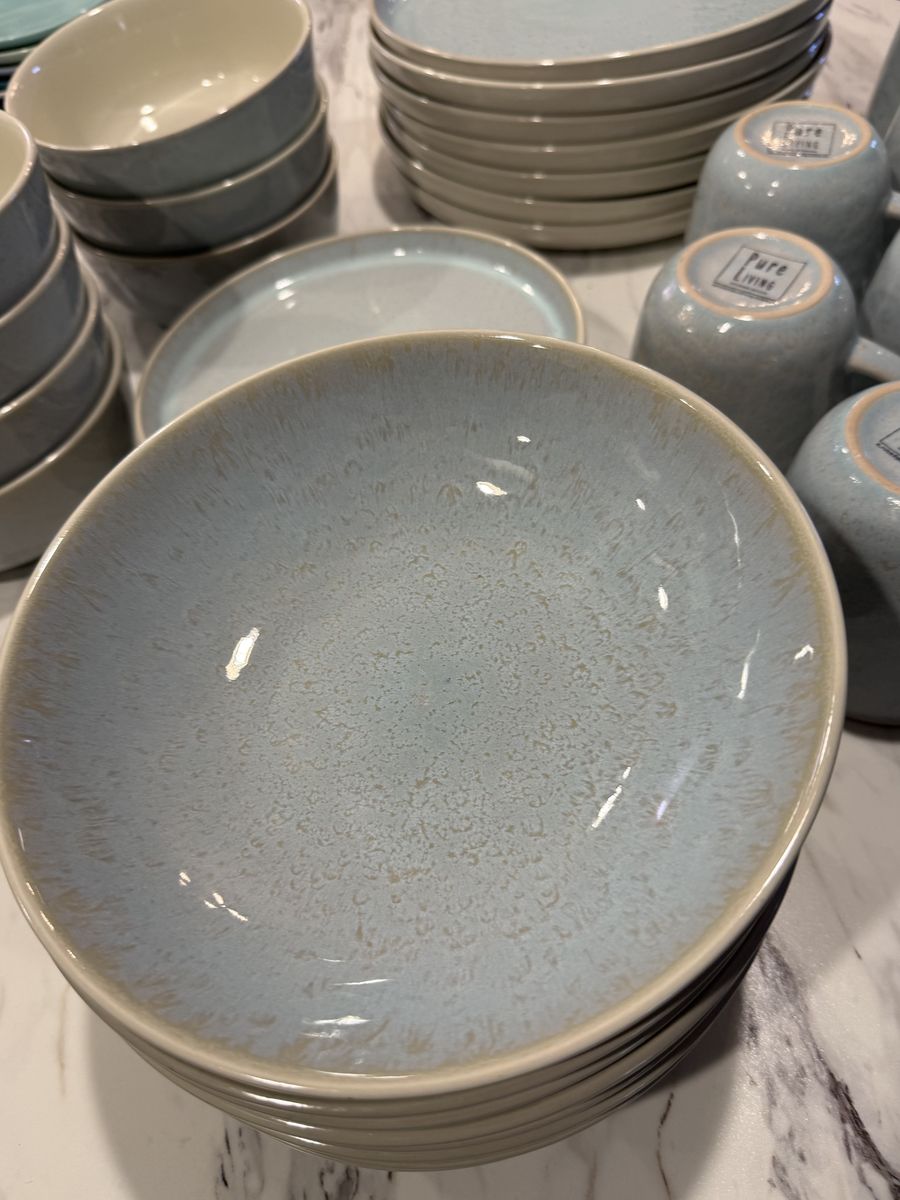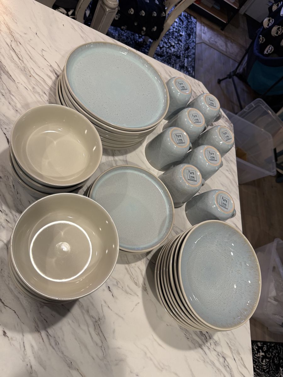 ZelleBeautiful white/light blue ceramic dish set with 8 each of mugs, large plates, small plates, bowls, pasta bowls. Beautiful set, I decided to replace them. Barely used, but in new condition. No chips. Pick up in West Point. Cash preferred.