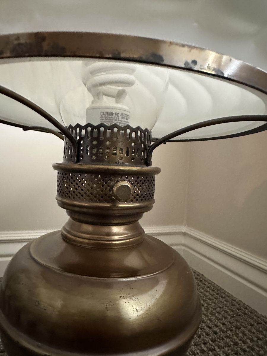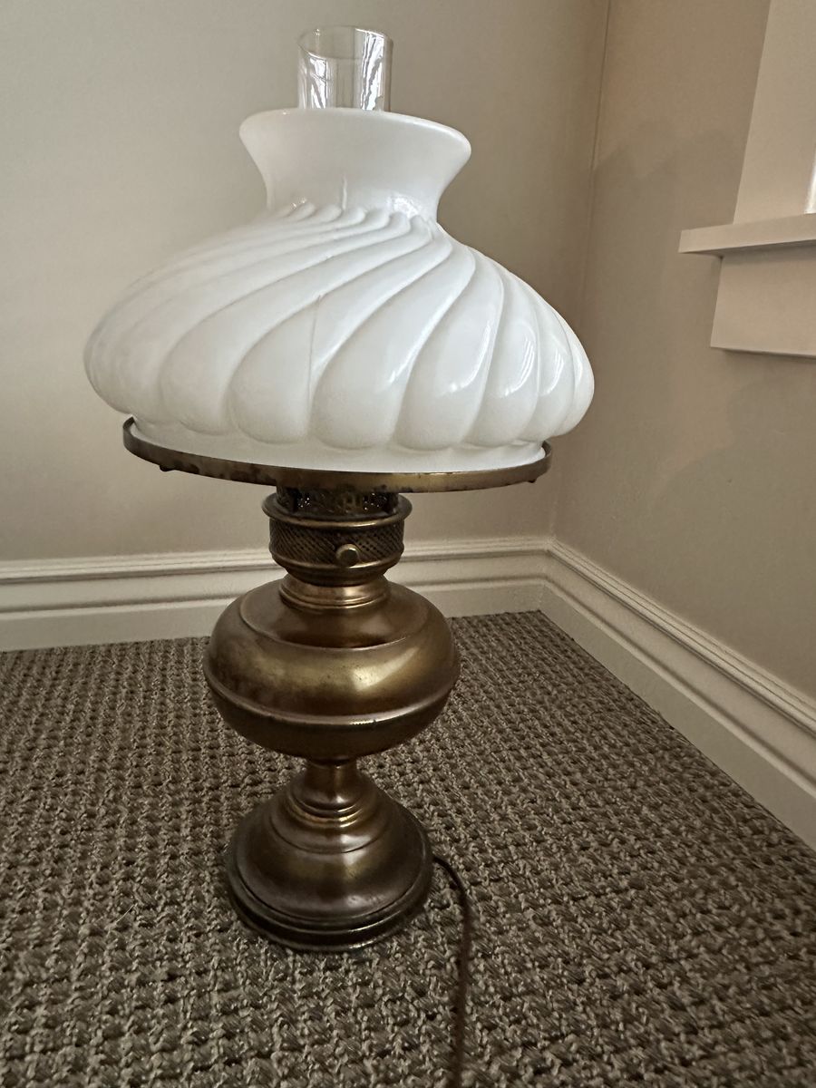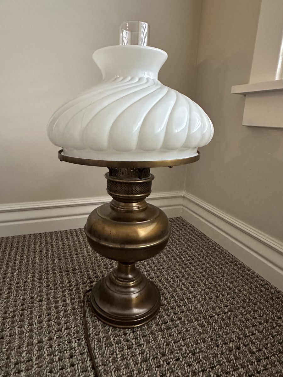 PayPalBeautiful antique brass hurricane table lamp with milk glass swirled shade. Excellent condition.