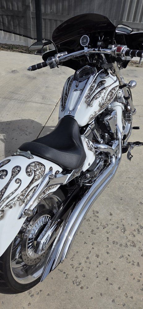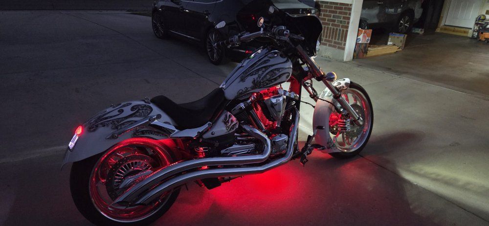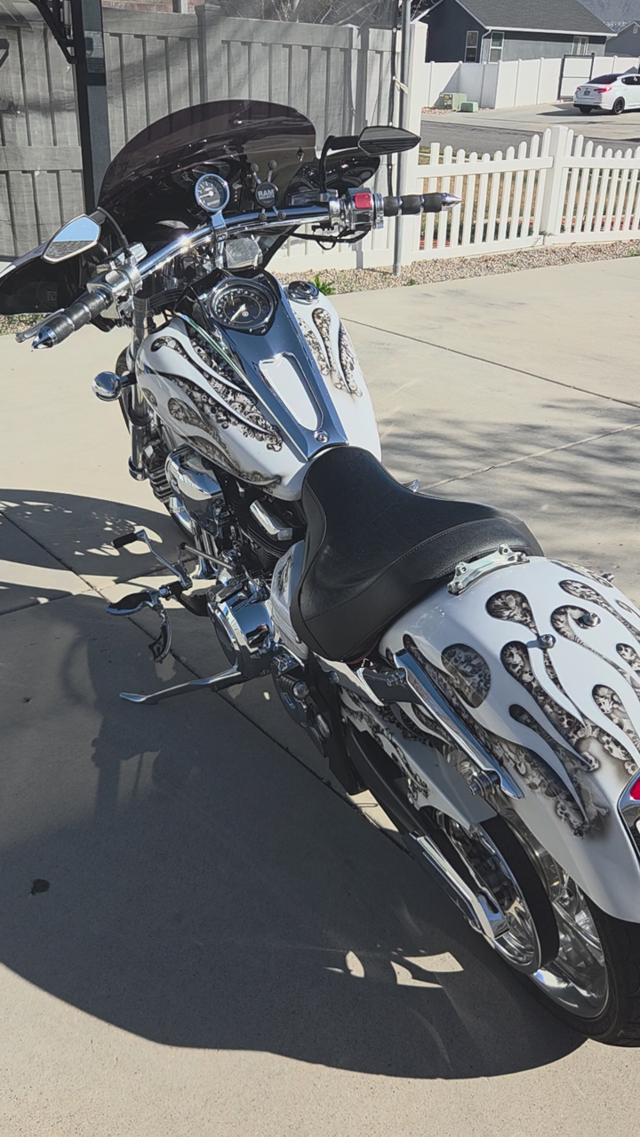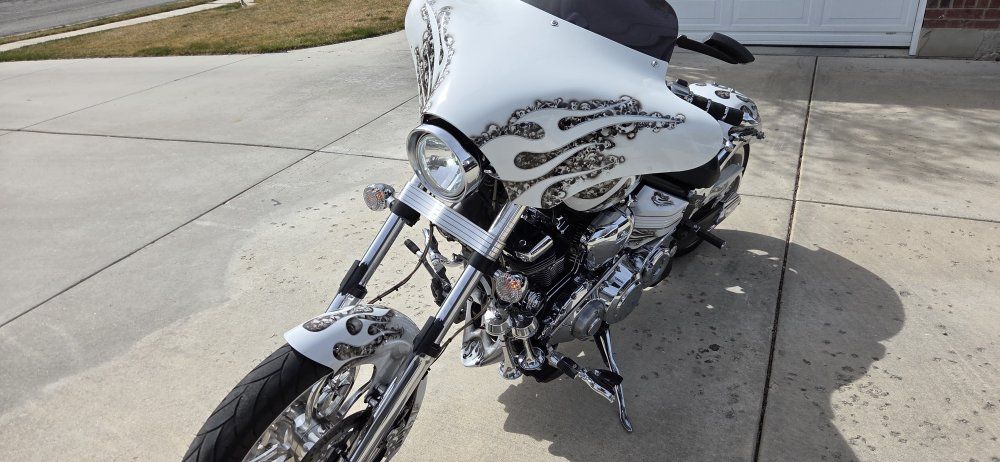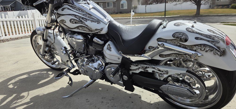 Incredibly super clean custom 09 Raider. White with airbrushed skulls S. Memphis shade faring painted to match. 11,500 miles. Custom front, rear wheels and rear pully. Fiberglass front and rear fenders. Custom stretched out forks. Stage 1 clutch kit. Have mustang seat and passenger seat with rear quick release back rest. Under glow kit and HID led headlifht light conversion. Lots of extras and well taken care of. Firm on price.