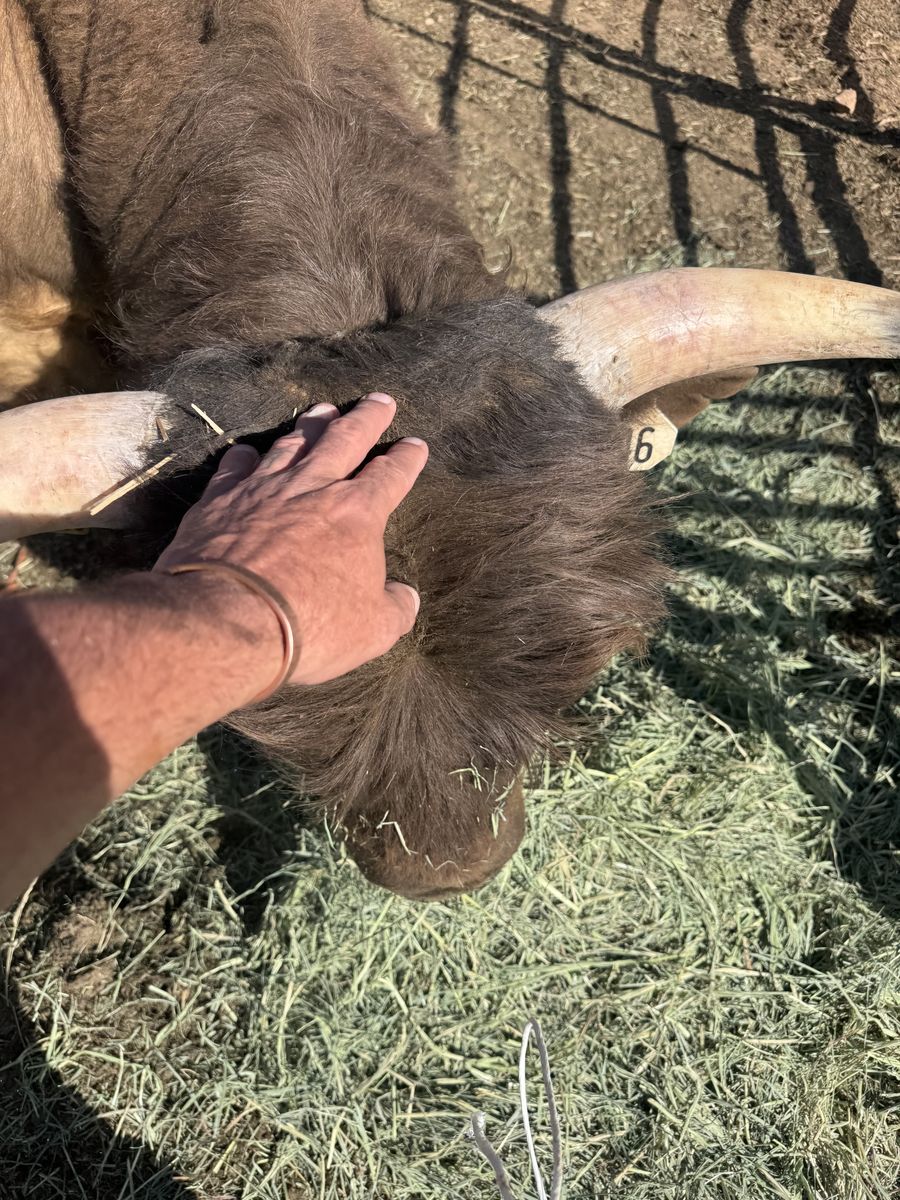 2 year old pet higher bull for sale . Has been tested and is a breeder . This bull is great to be around . 3.5 feet tall around 600 pounds .
