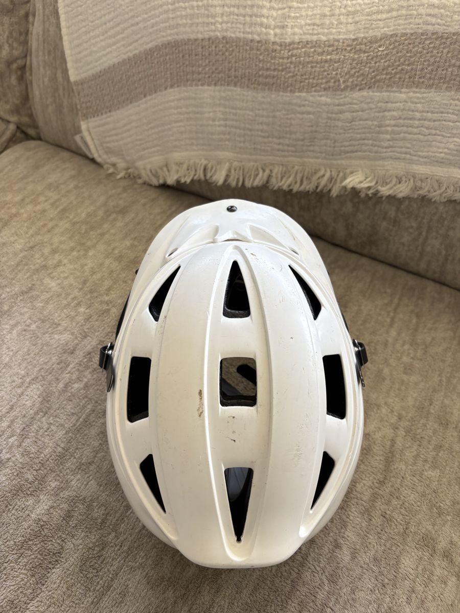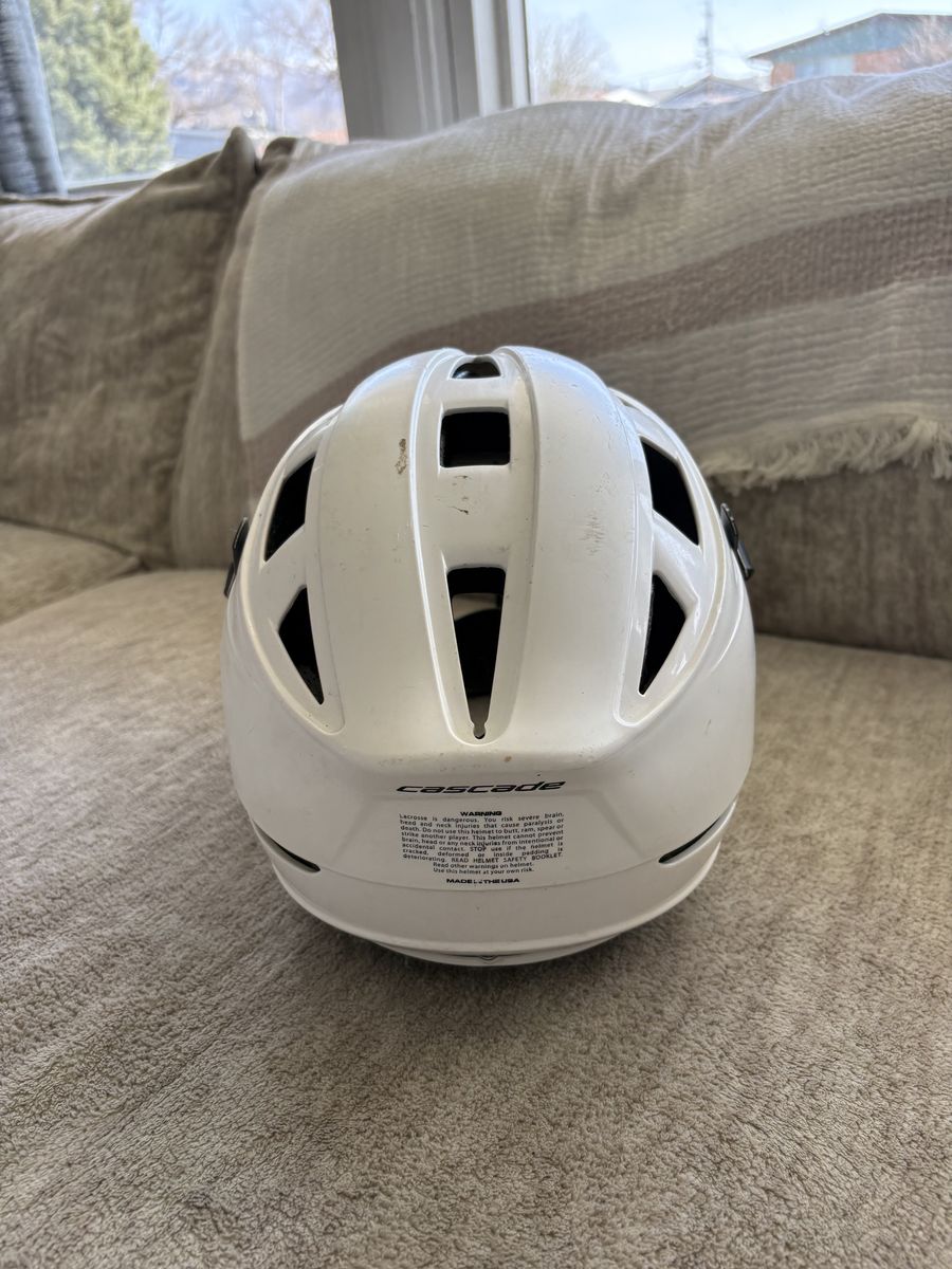 This is a great lacrosse helmet and worked perfect for me for a few seasons. I stopped playing and does not get used anymore. This is a cascade CPV – R from what I can tell the size is medium/large.