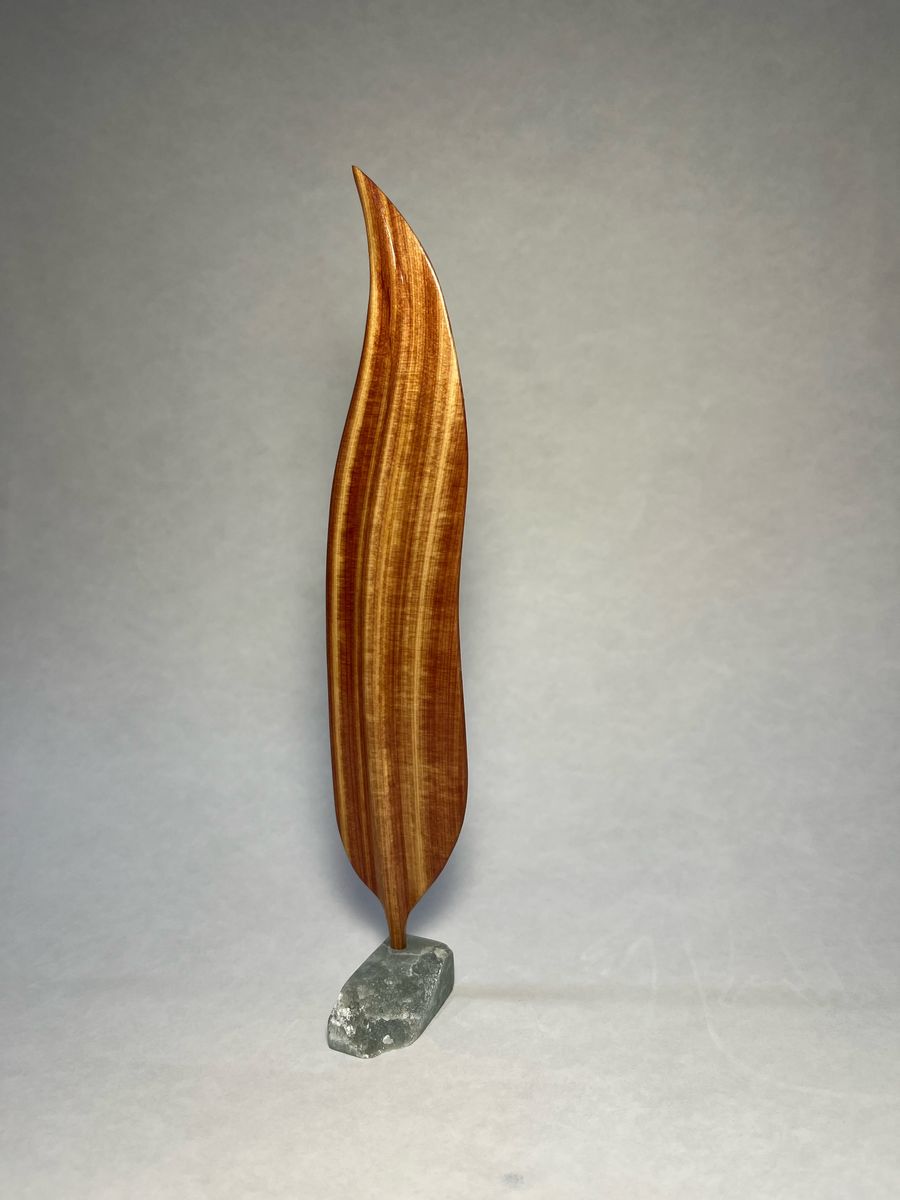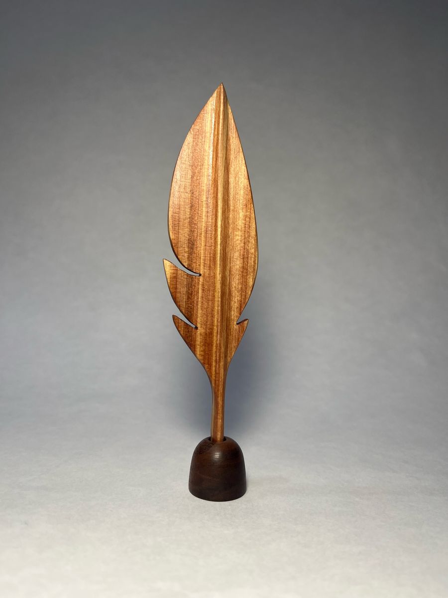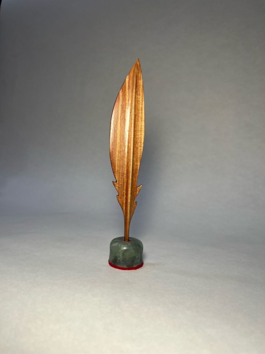 Handmade cedar wood feathers with stands made from Talc (2 on left of main image), and black walnut (on right of main image).