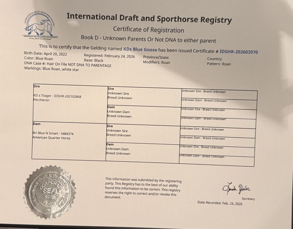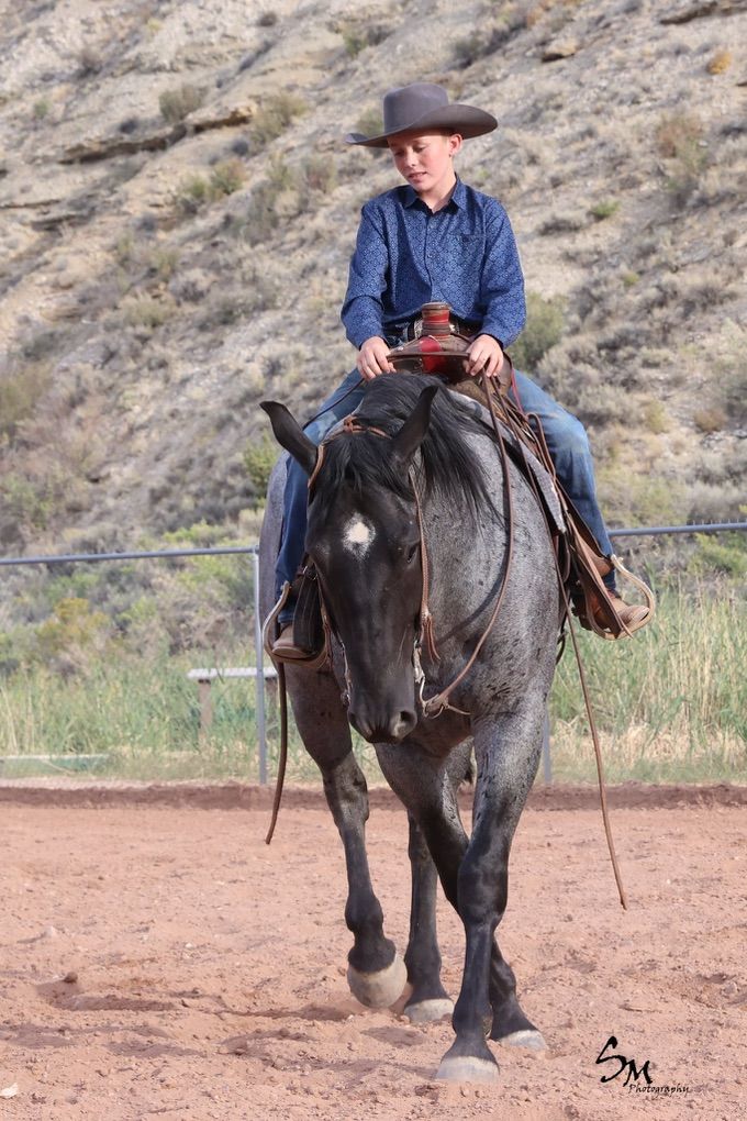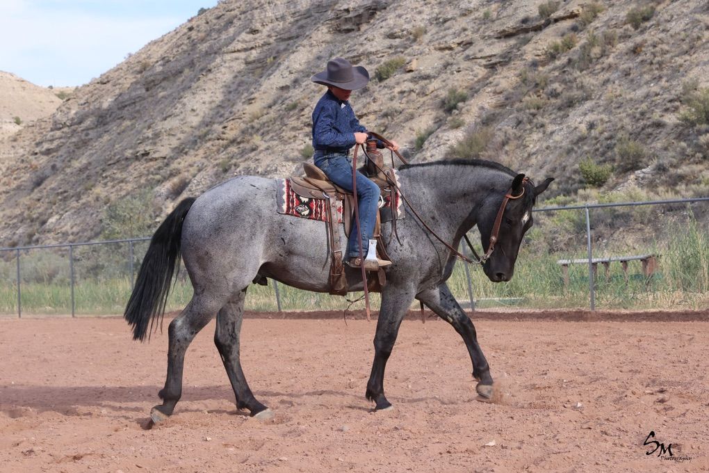 Introducing the coolest draft cross around! Goose is a 4 year old blue roan draft cross gelding. He is registered with the International Draft and Sport Horse registry. He was born and raised at our place. He is out of our Percheron Stallion and a AQHA mare. Goose has all the training we expect out of our barn. He can neck rein, side pass and lope a nice pretty circle. He is broke like a quarter horse but has the toughness of a Percheron. He has packed out elk and been used a lot on the mountain this past fall during the hunts. He knows a hard days work! Goose has also been used to cowboy on. We have roped bulls on him and can confidently say he has a big heart that is ready for a full days work. We have also team roped on him as well. He is big enough to pull just about anything! We love Goose! There are not enough good things to say about this guy. Not only is he big and beautiful but he is exceptionally broke for a horse his age. He is up to date on wormers and vaccinations. To give Goose a try give us a call 801-391-7940