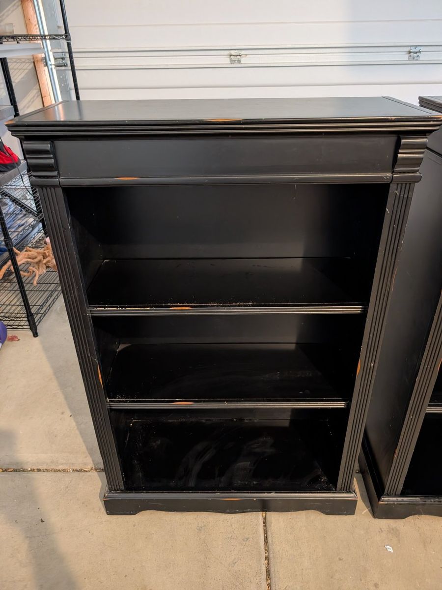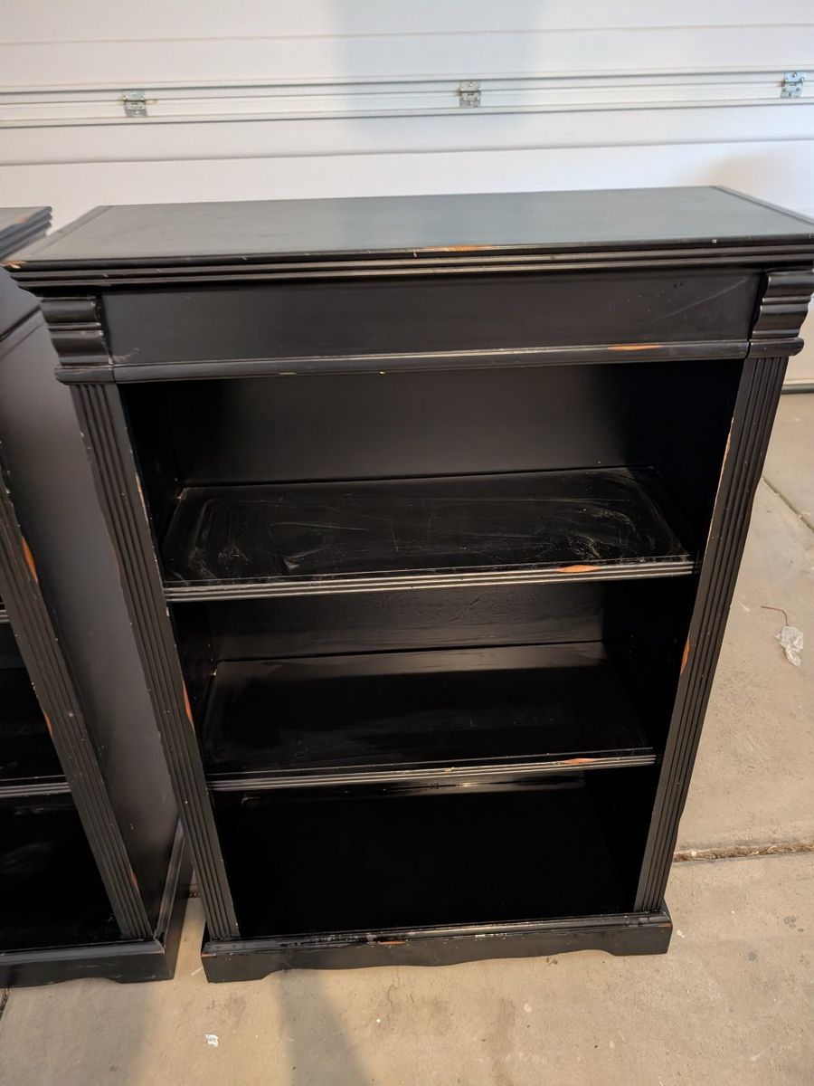 VenmoMatching Black bookshelves 2 shelves on each, adjustable height Approximate measurements: height: 48" width: 32" depth: 13"