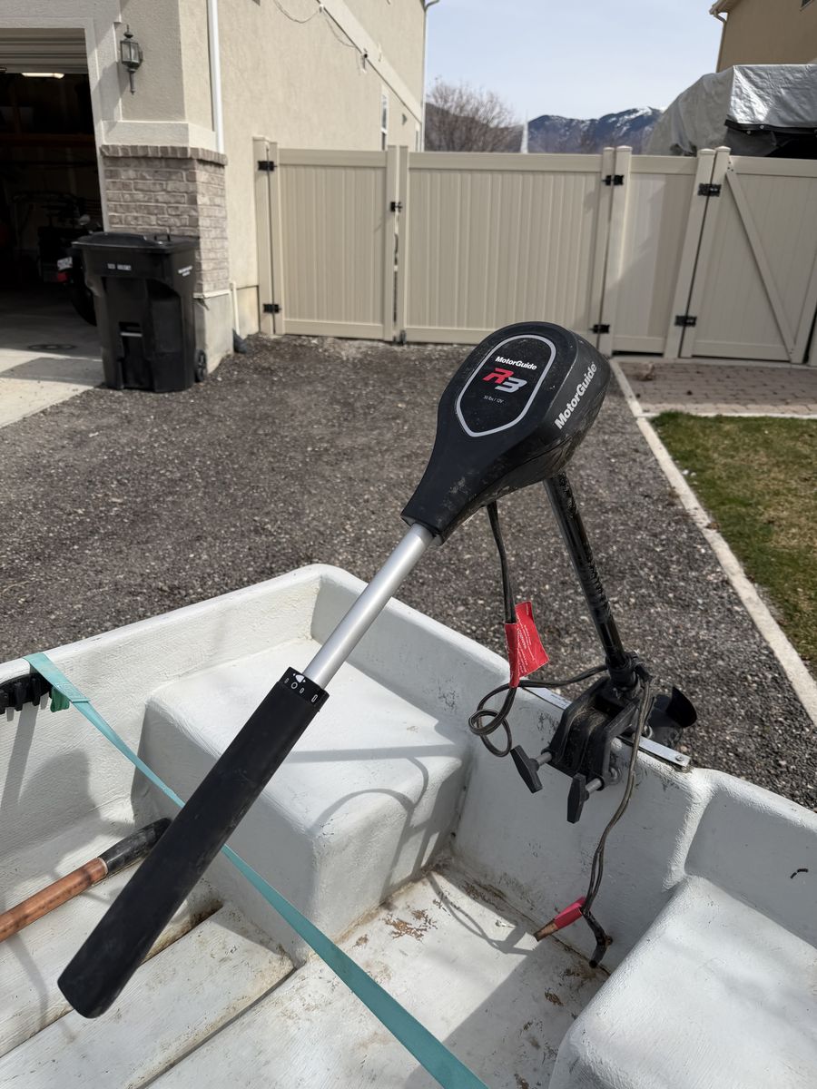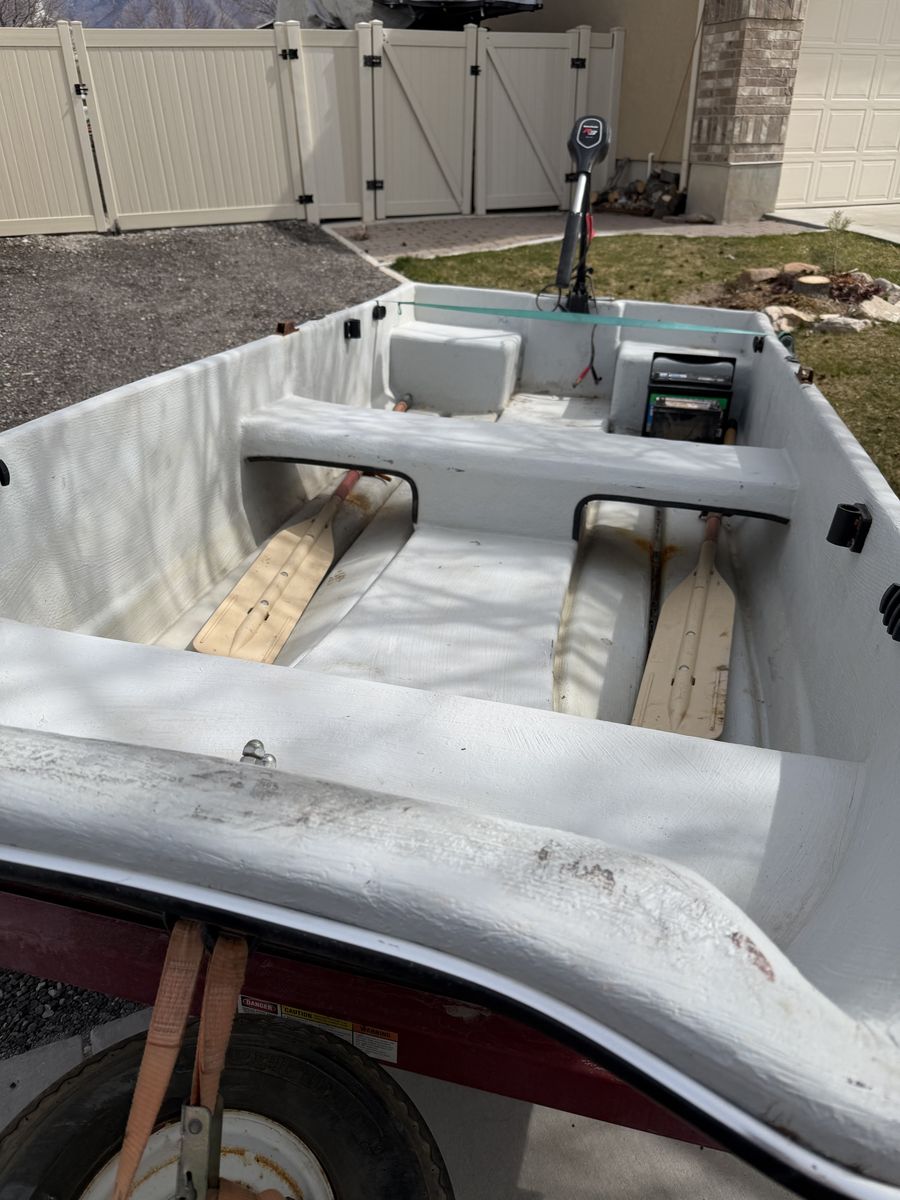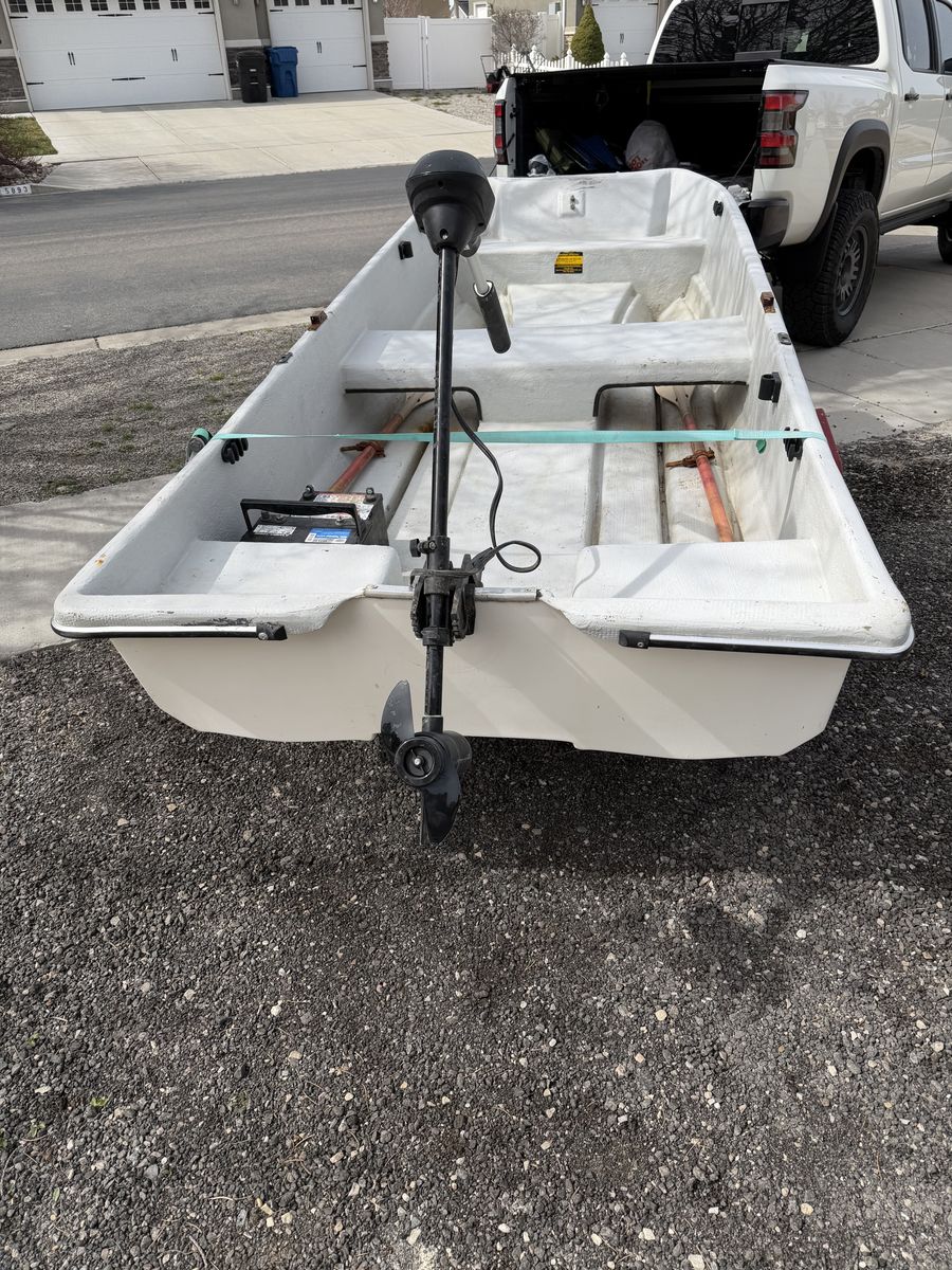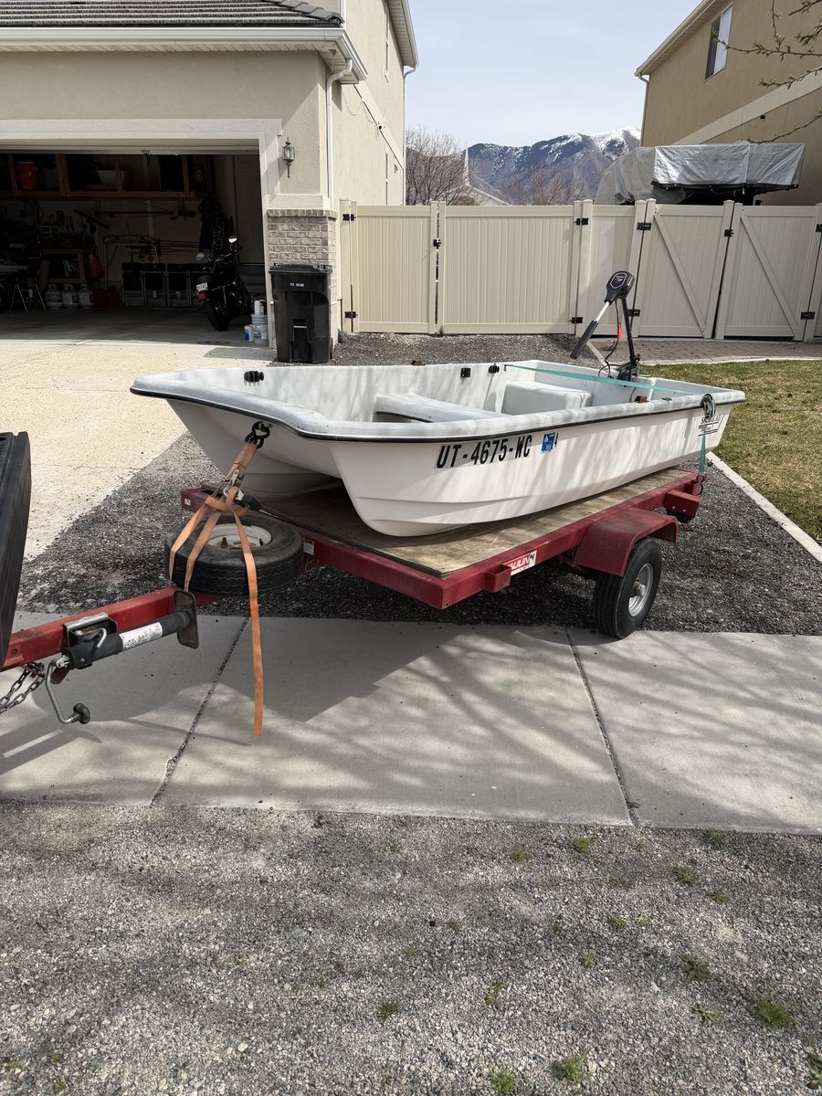 10 foot fiberglass boat with battery and electric motor with trailer and new tires