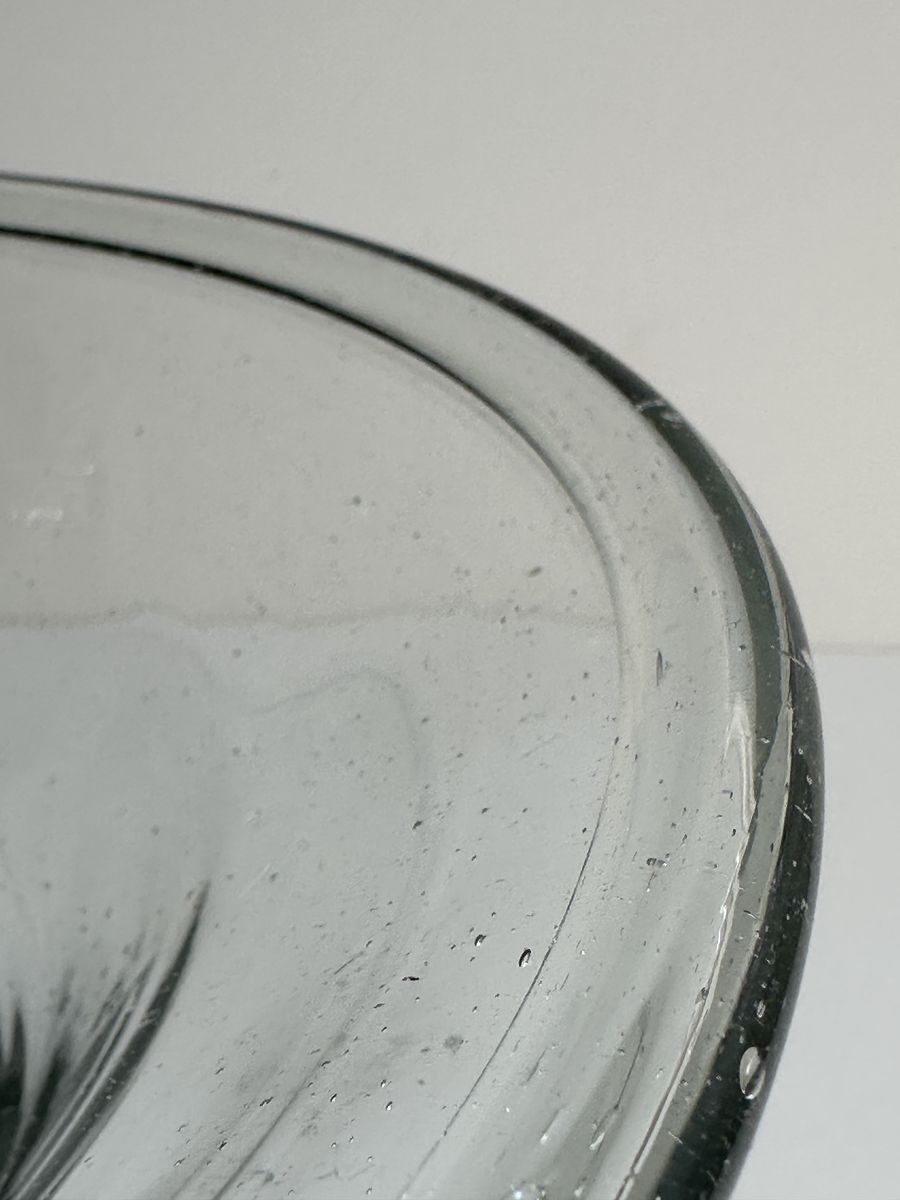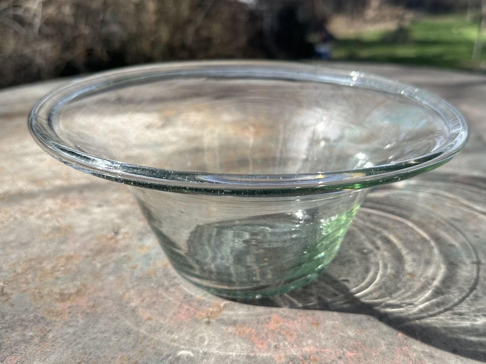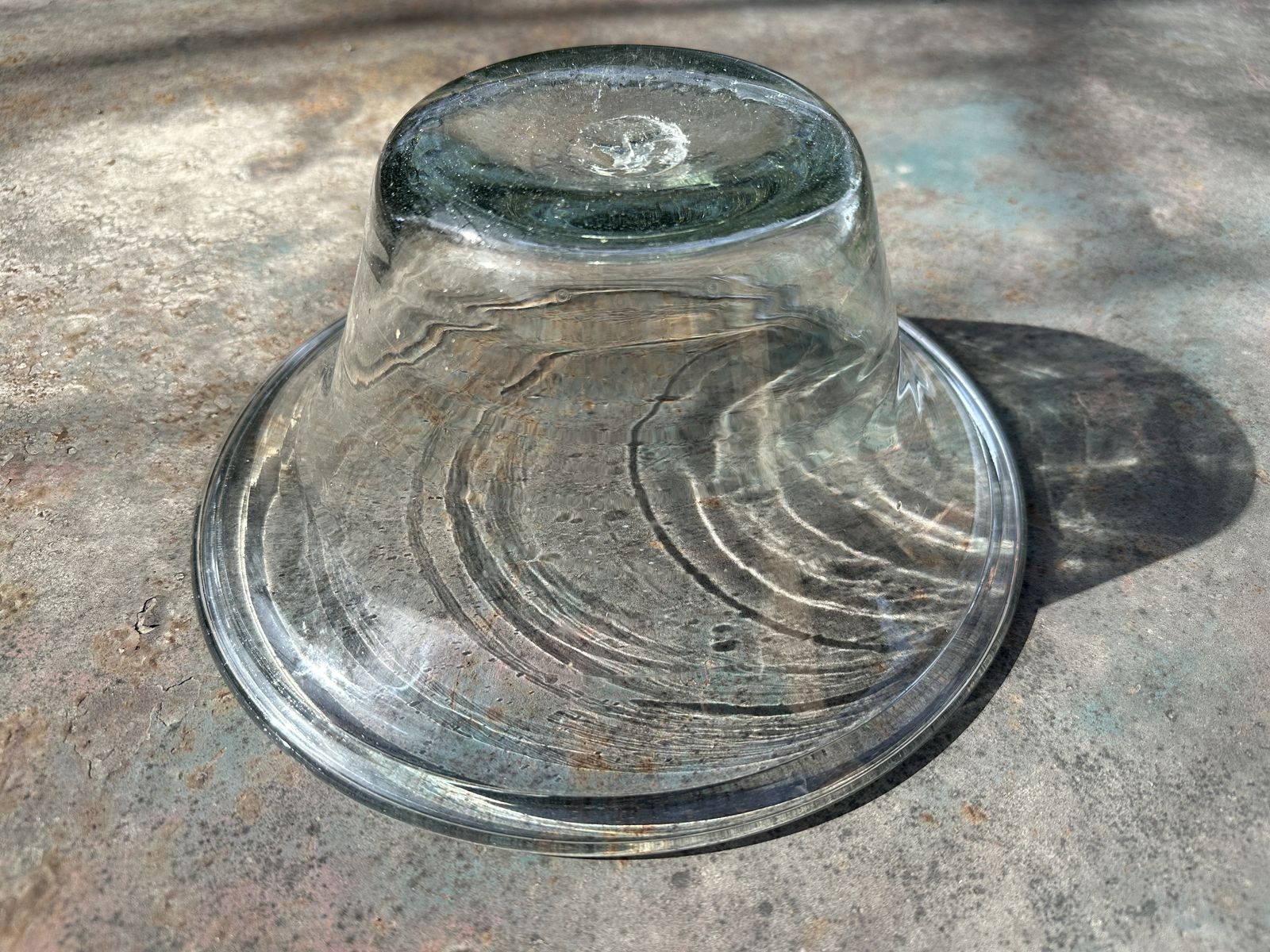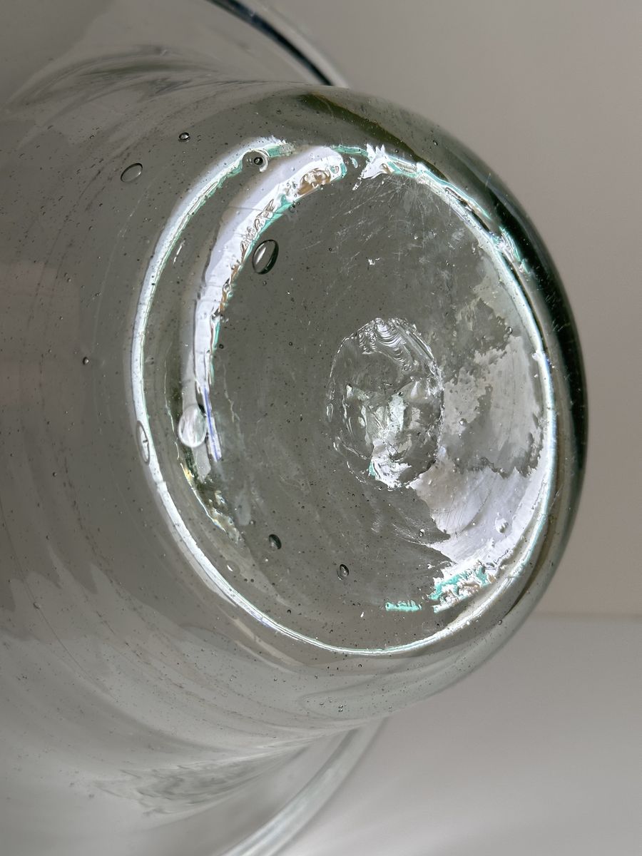 Antique 19th-century American deep free-blown glass dairy/cream bowl or pan with large inward rolled/folded rim, and a rough pontil mark.
