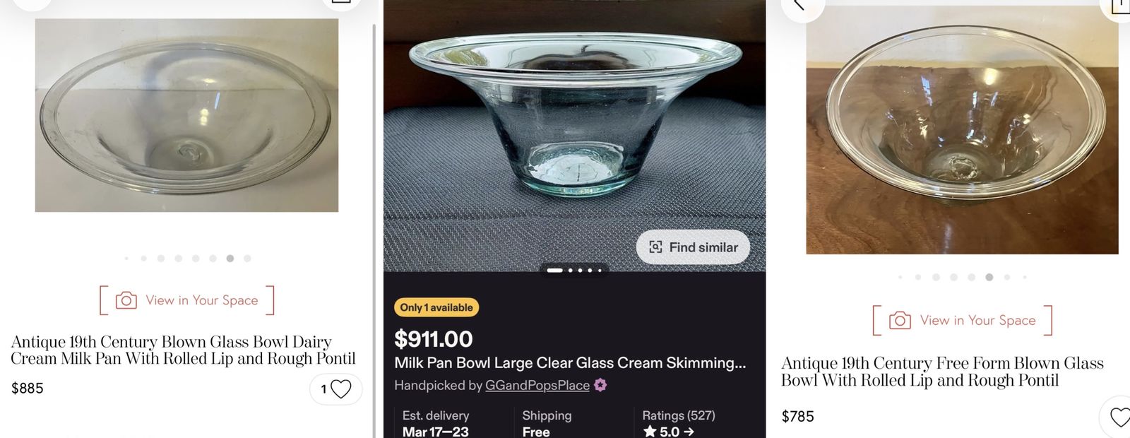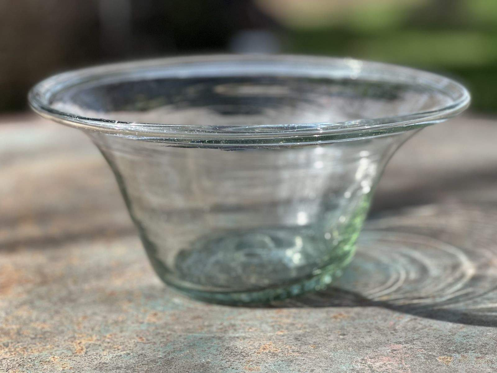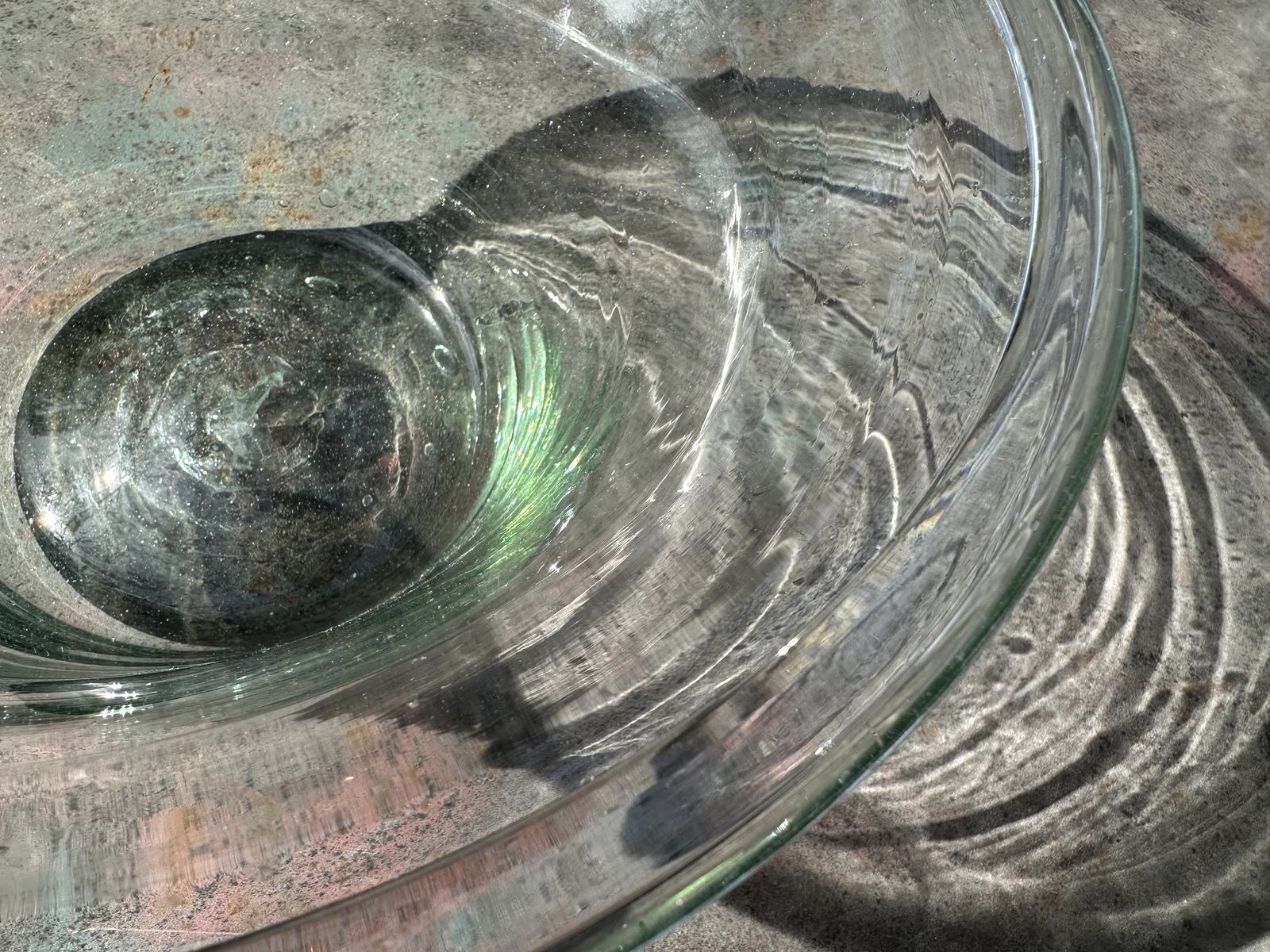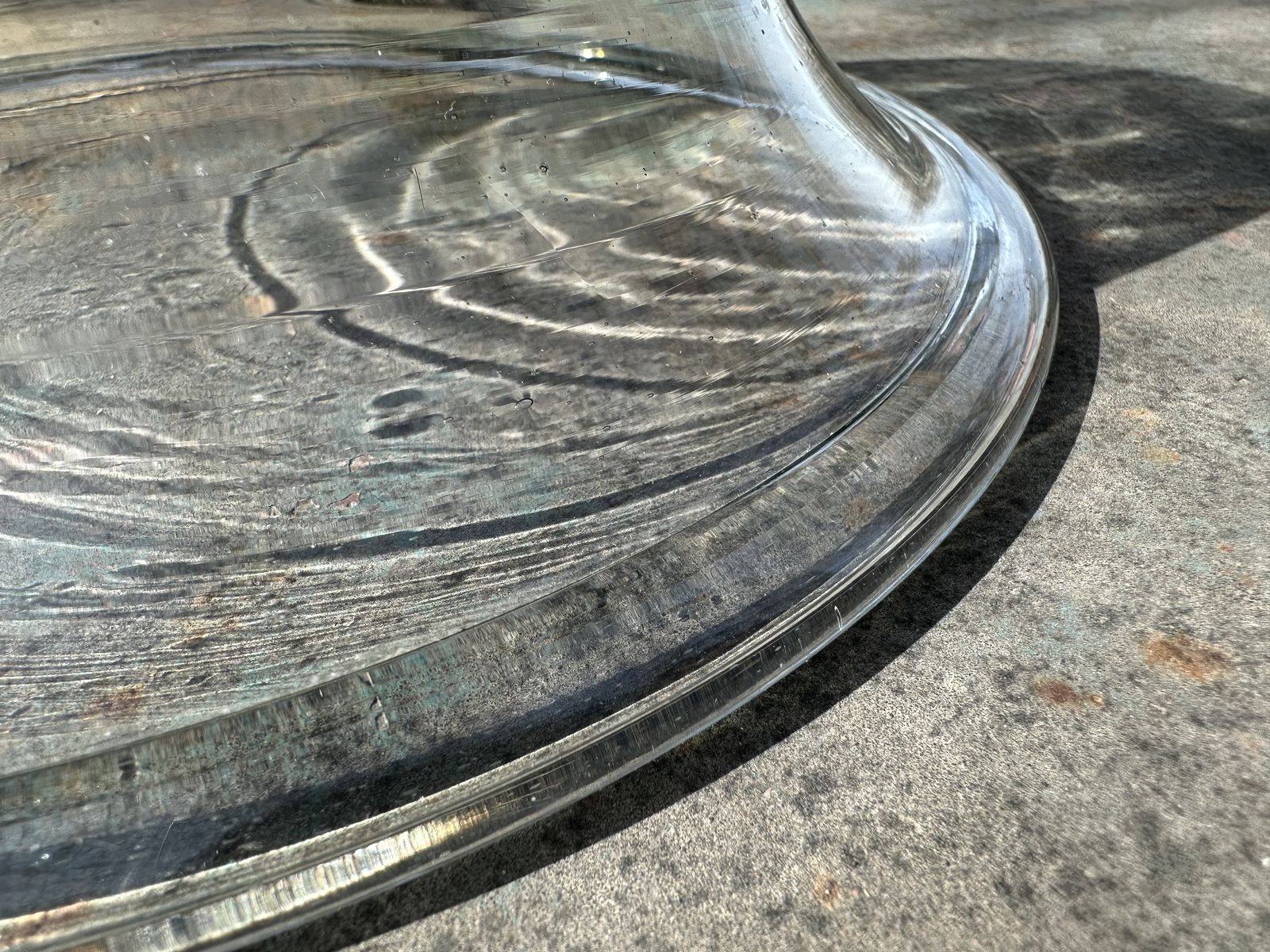 Antique 19th-century American deep free-blown glass dairy/cream bowl or pan with large inward rolled/folded rim, and a rough pontil mark.