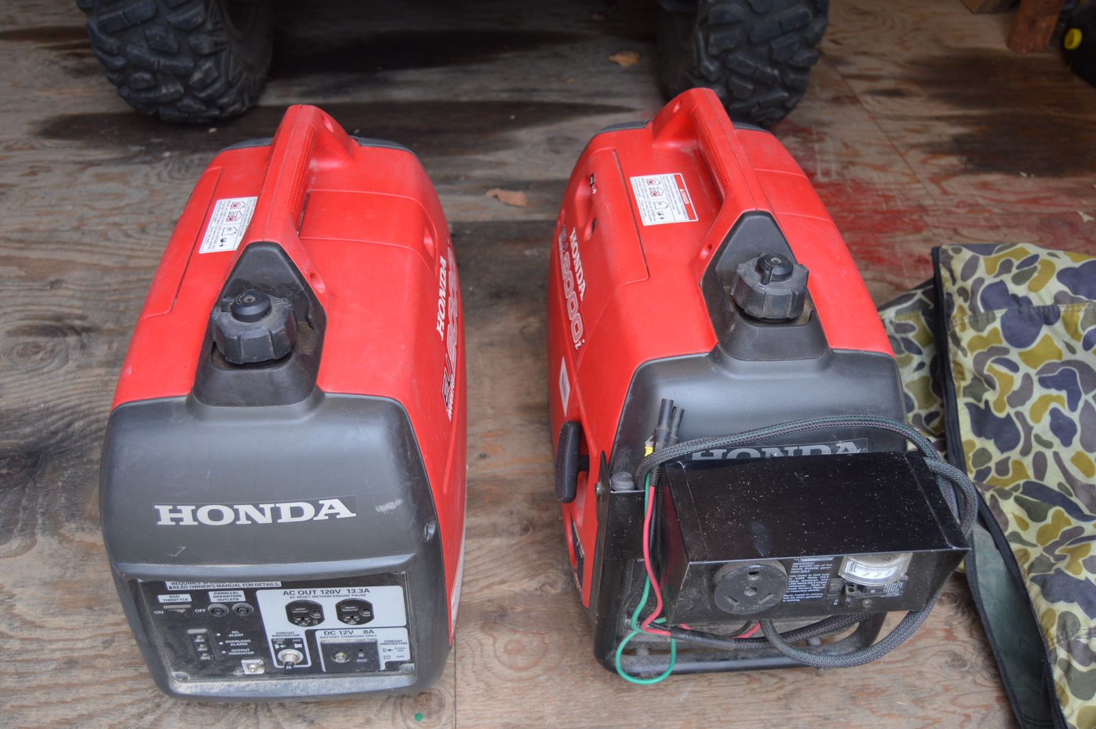 Two 2000 i generators in like new condition. One has 15hrs on it and the one with the parellel device on it 3hrs. Can be used separately or in Parellel. Great for camping summer or winter. Together in parellel they start and run our aircondition. Very quiet. Honda reputation. $1,200.00 or $650 seperatly. They have covers.